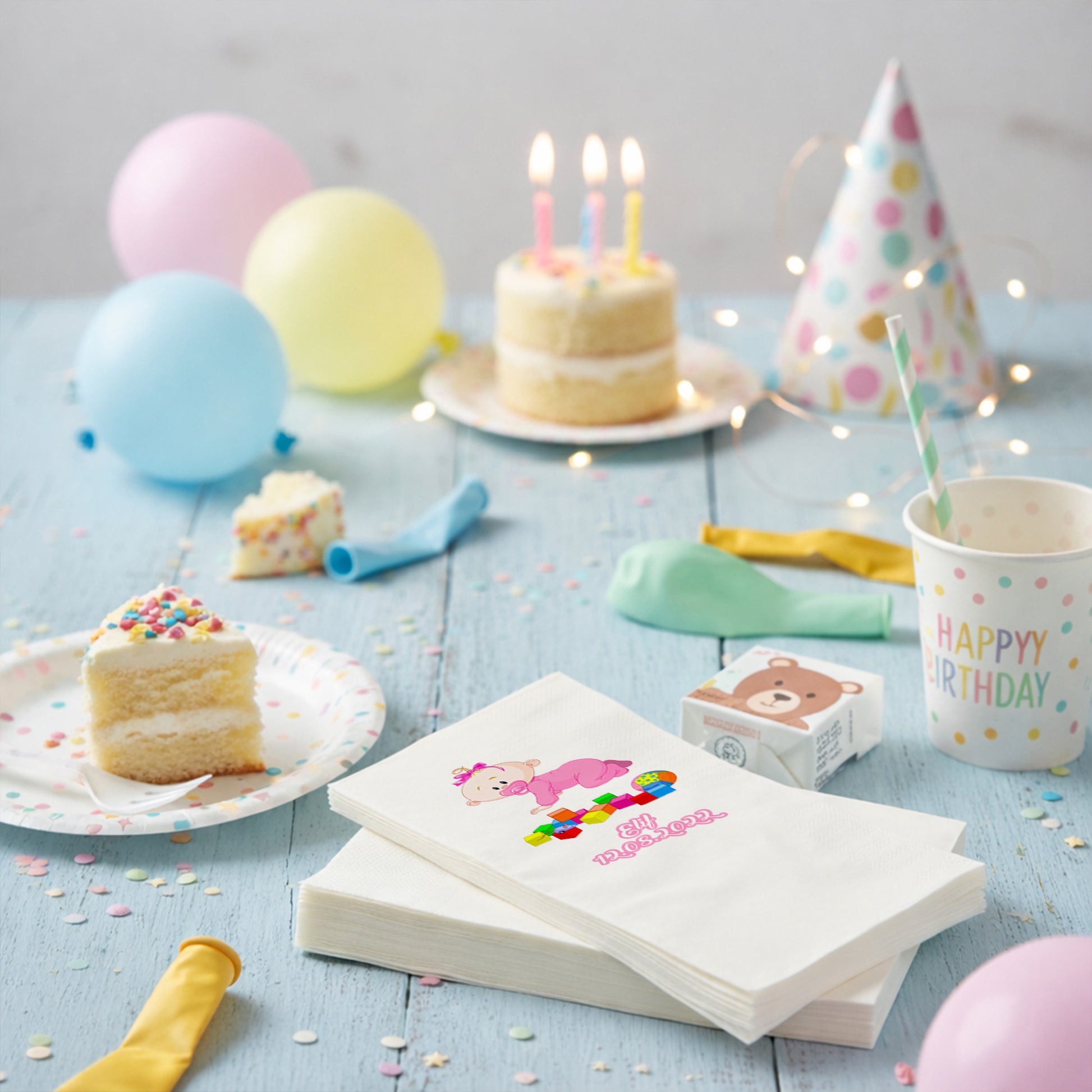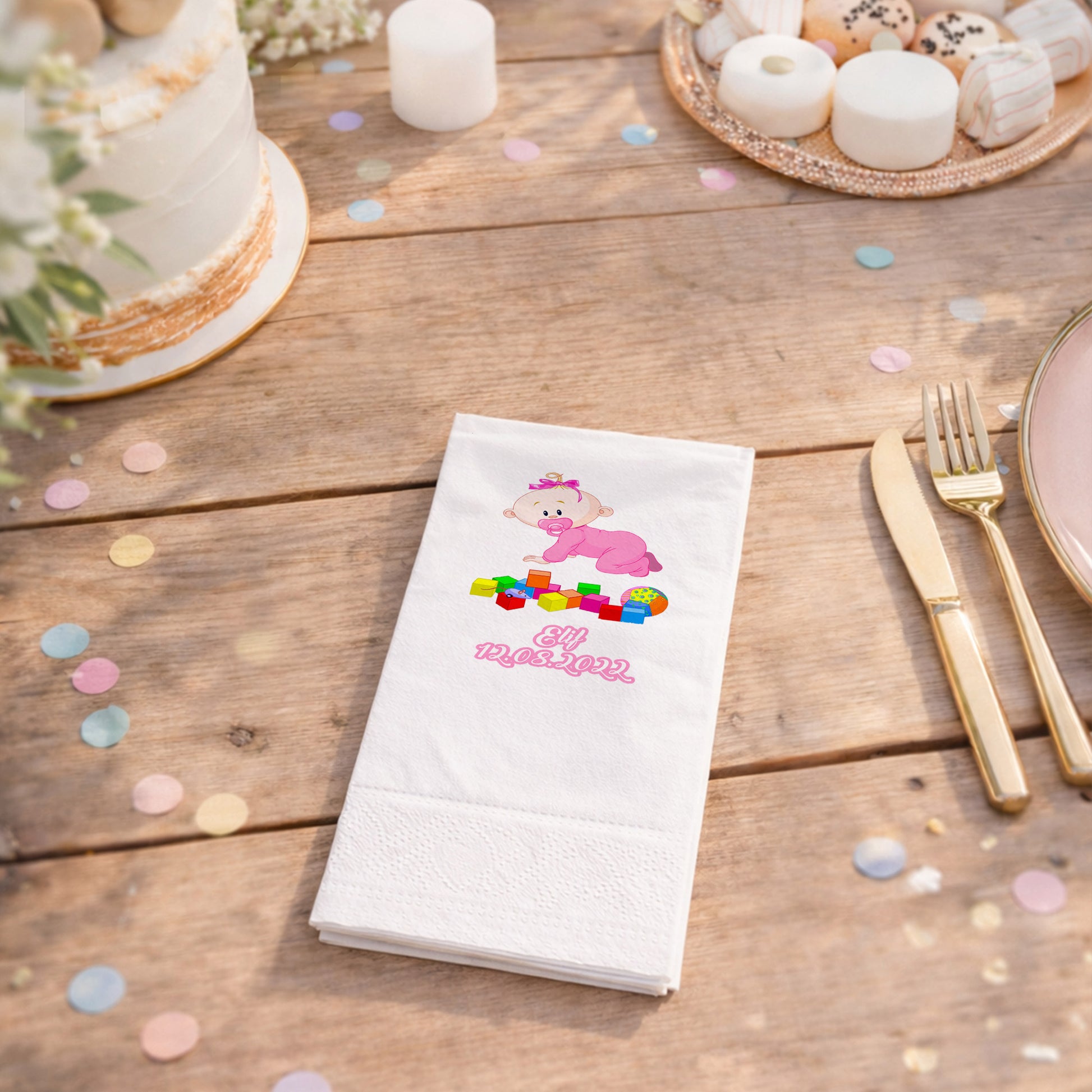 Elif bebeğin dünyasına renk katan bu peçete tasarımı, oyuncak bloklar ve emekleyen sevimli bebek figürüyle çocuksu bir neşe saçar. Pembe tonlarının canlılığı ve isim-tarih baskısıyla özelleşen bu ürün, doğum günleri ve diş buğdayı partileri için vazgeçilmez bir dekoratif öğedir. Bloklar ve oyuncak fare detayıyla zenginleşen görsel, partinizin oyun dolu atmosferini pekiştirir. Kaliteli kağıt dokusu sayesinde ikramlarınızın yanında hem şıklık sunar hem de pratiklik sağlar. Elif isminin zarif bir şekilde işlendiği bu peçeteler, sofranızda bütünlük oluşturur. Canlı baskı kalitesi ve hijyenik yapısıyla bebeğinizin ilk özel anlarını taçlandıran bu tasarım, misafirlerinizin de hafızasında yer edecek tatlı bir detaydır.