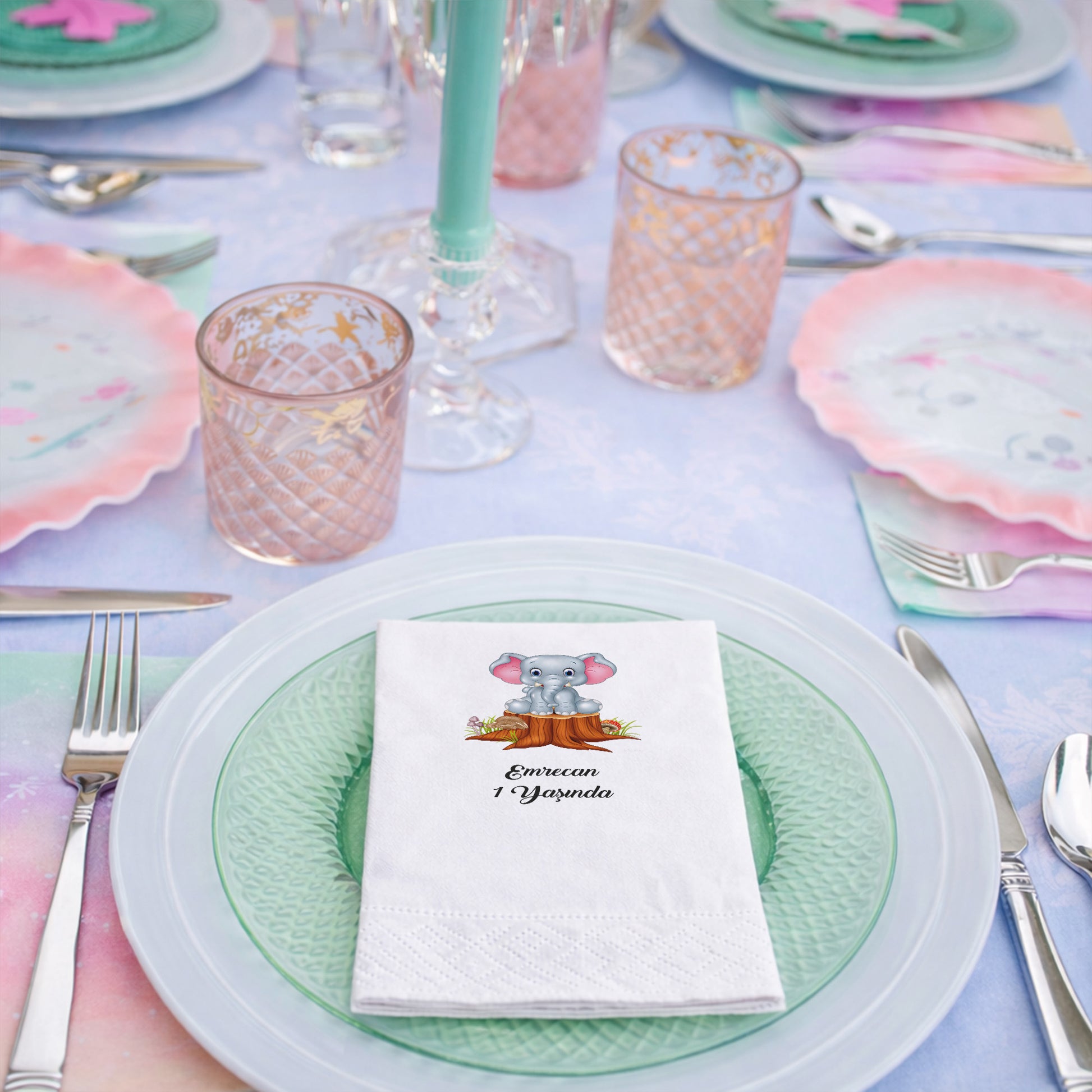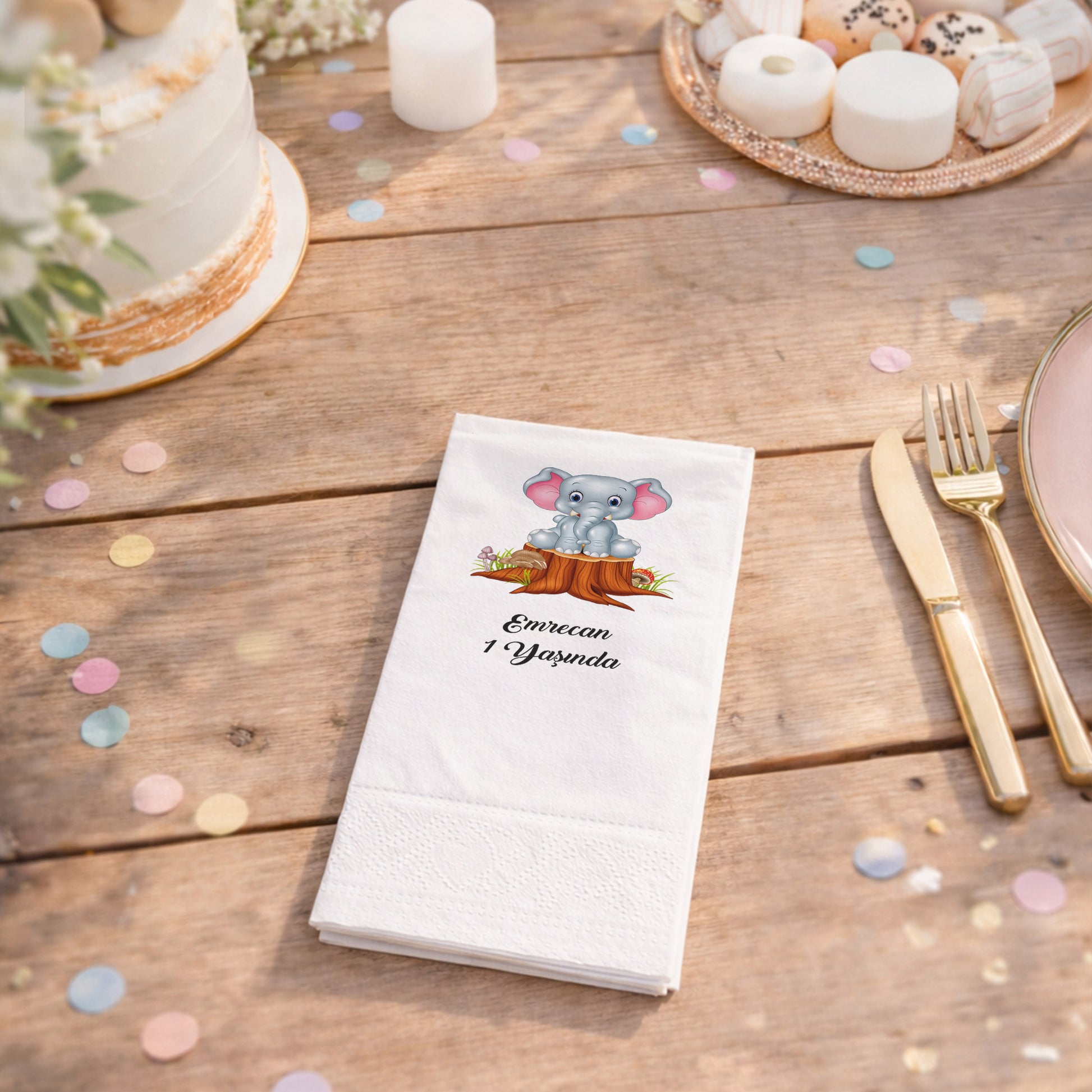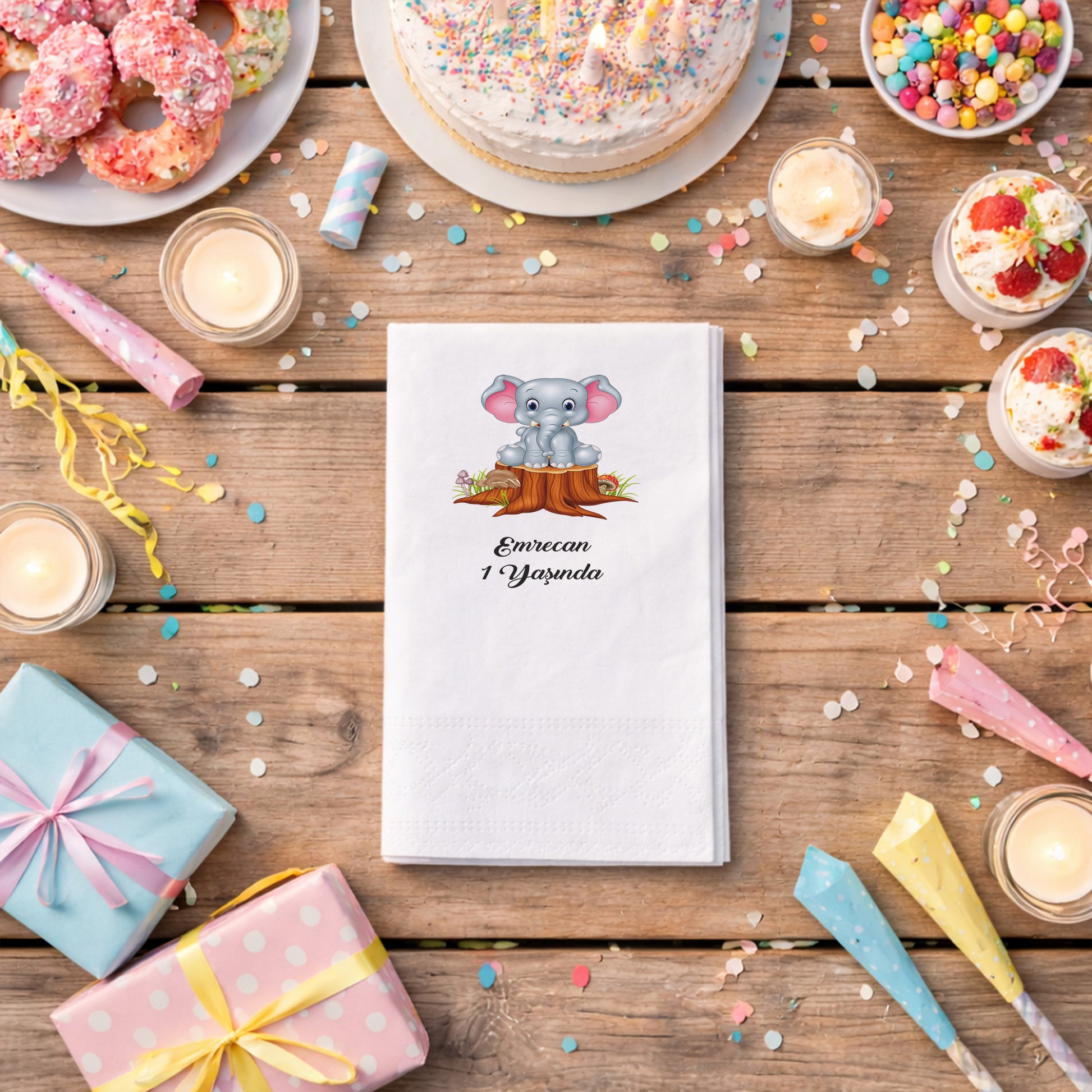 Emrecan 1 Yaşında Kütük Üstünde Fil Tasarımlı Doğum Günü Peçetesi