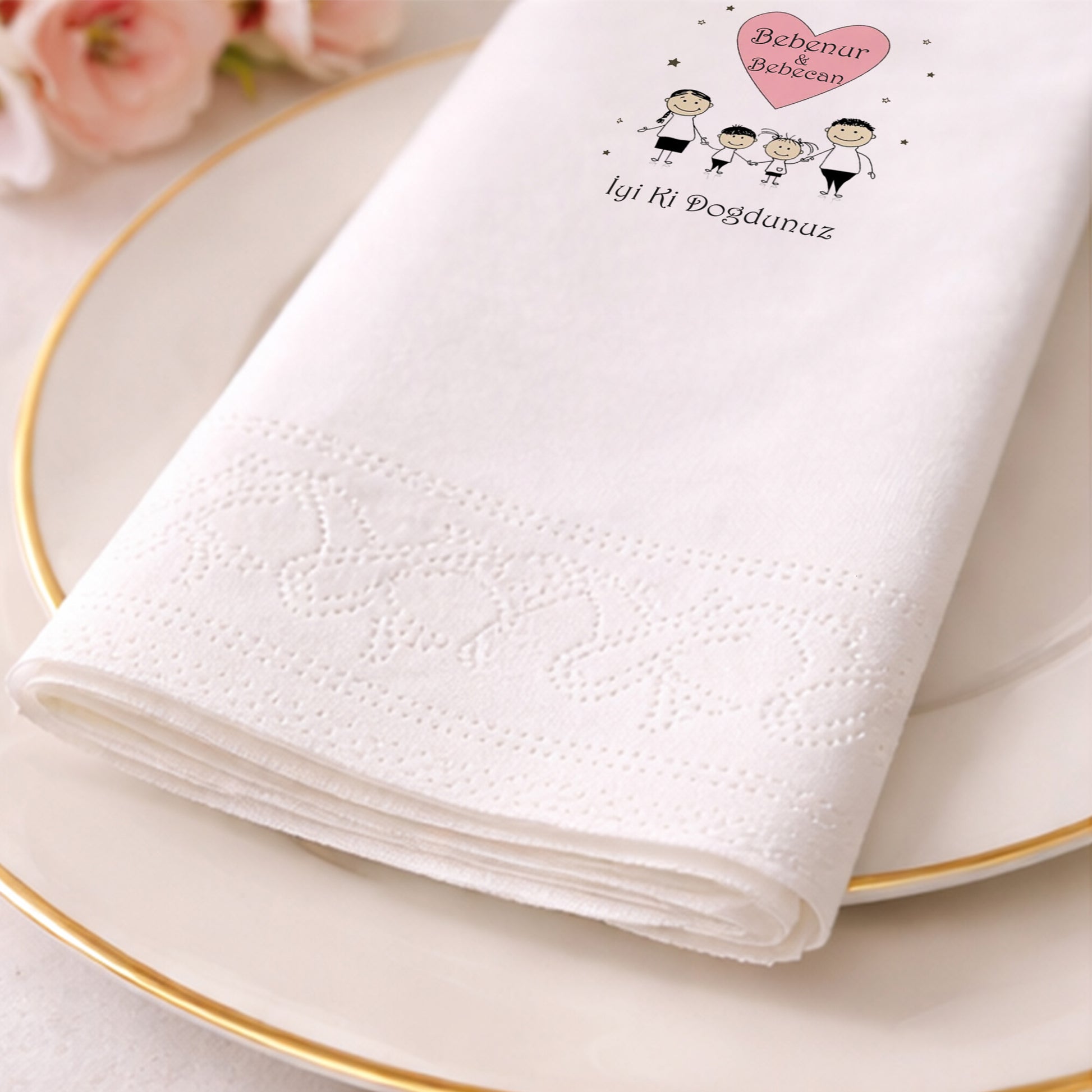 Tasarım, peçetenin ön yüzünde tam merkezde olacak şekilde yüksek çözünürlüklü baskı ile uygulanır. Dilersen özel konumlandırma taleplerini de iletebilirsin.