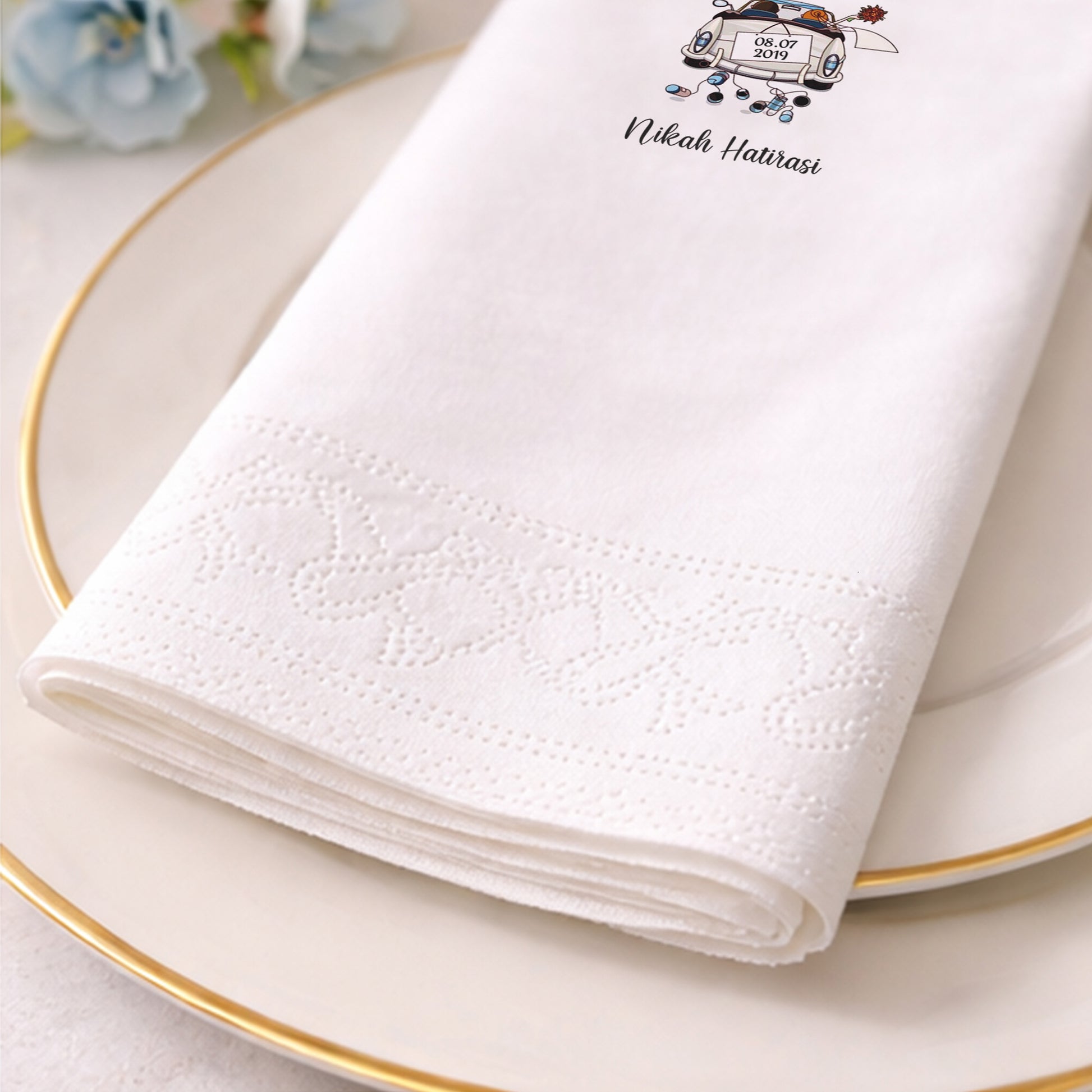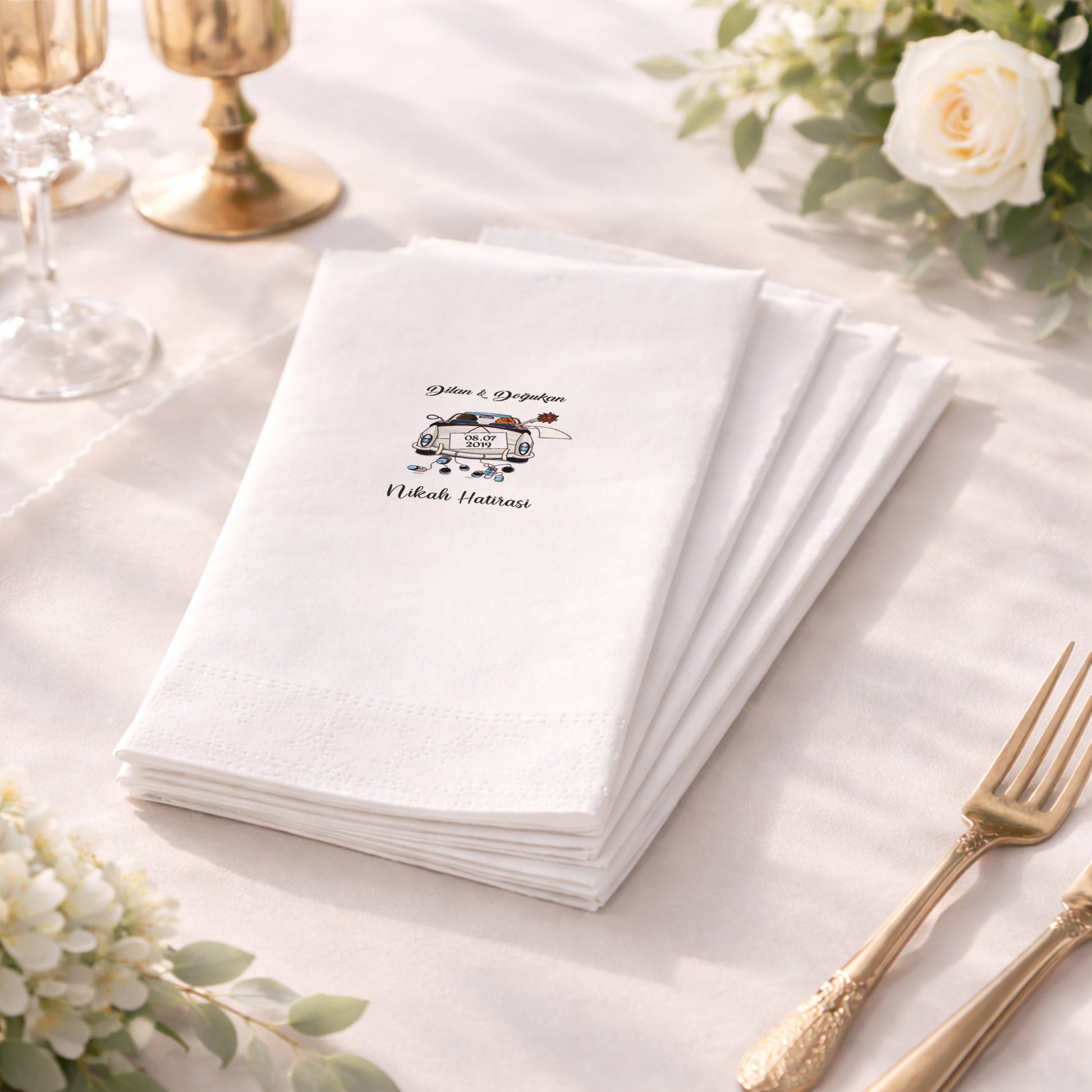Gelin arabası illüstrasyonu ile tasarlanan bu baskılı peçete, nikah organizasyonları için eğlenceli ve akılda kalıcı bir stil sunar. İsim ve tarih bilgisiyle kişiselleştirilen tasarım, özel gün peçetesi olarak davetlere karakter katar. Organizasyon peçetesi olarak nikah masalarında samimi bir atmosfer oluşturur. Nikah peçetesi ve düğün peçetesi olarak tercih edilebilir. Baskılı peçete yüzeyi, illüstrasyon detaylarının netliğini korur. Klasik tasarımlardan farklı, enerjik ve güven veren bir nikah konsepti arayanlar için ideal bir üründür.