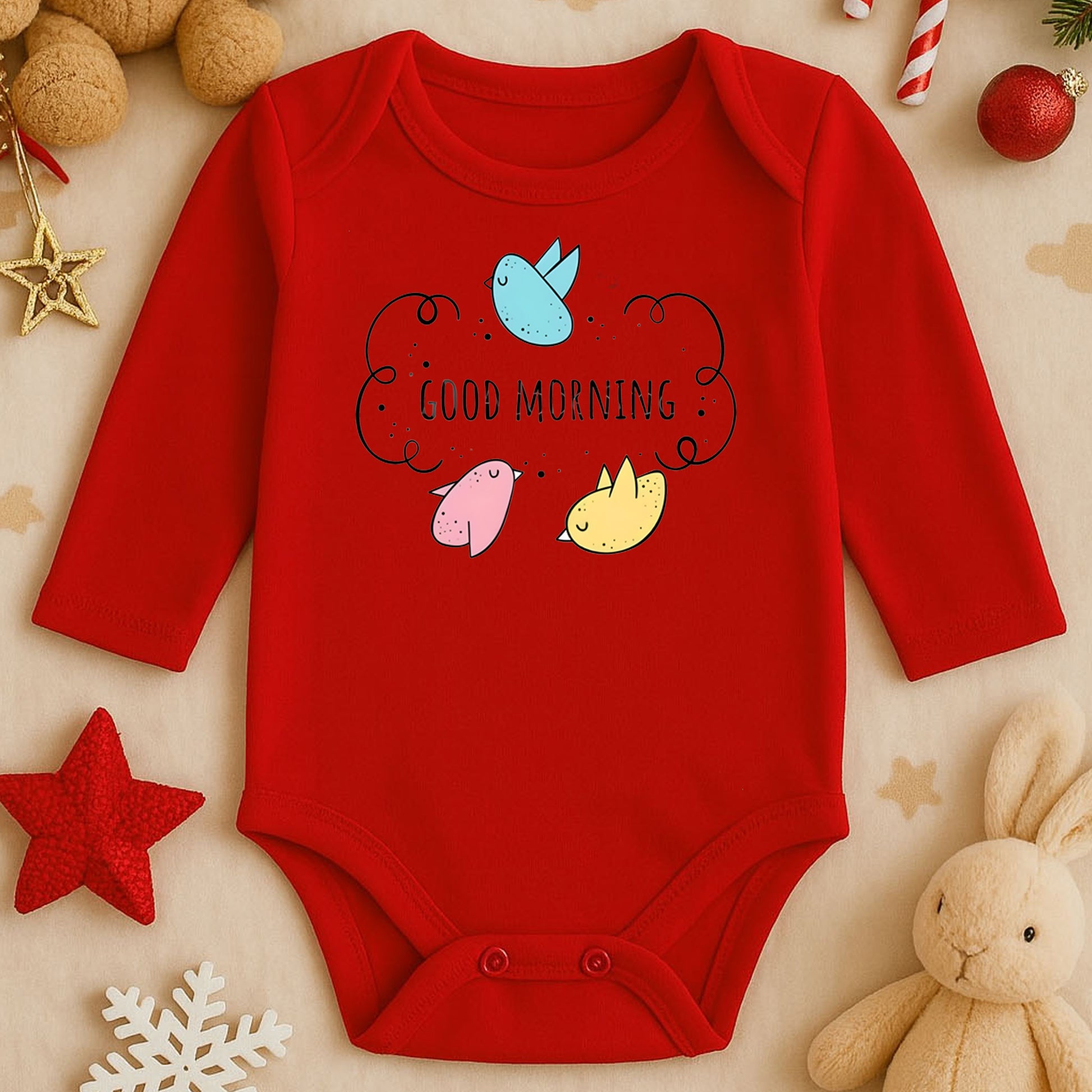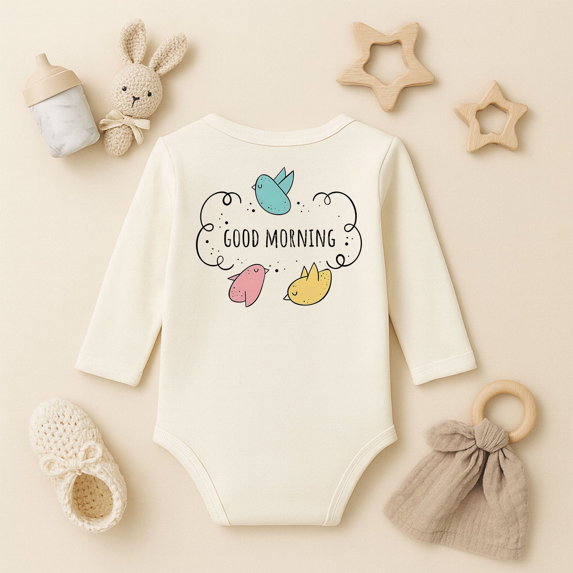 “Good Morning” yazısı ve sevimli kuş figürleriyle tasarlanan bu bebek zıbını, güne neşeli bir başlangıç yapmanın en tatlı yolu. Hassas ciltlere uygun kumaşı ve kaliteli DTF baskısıyla günlük kullanım ve hediyelik için idealdir.