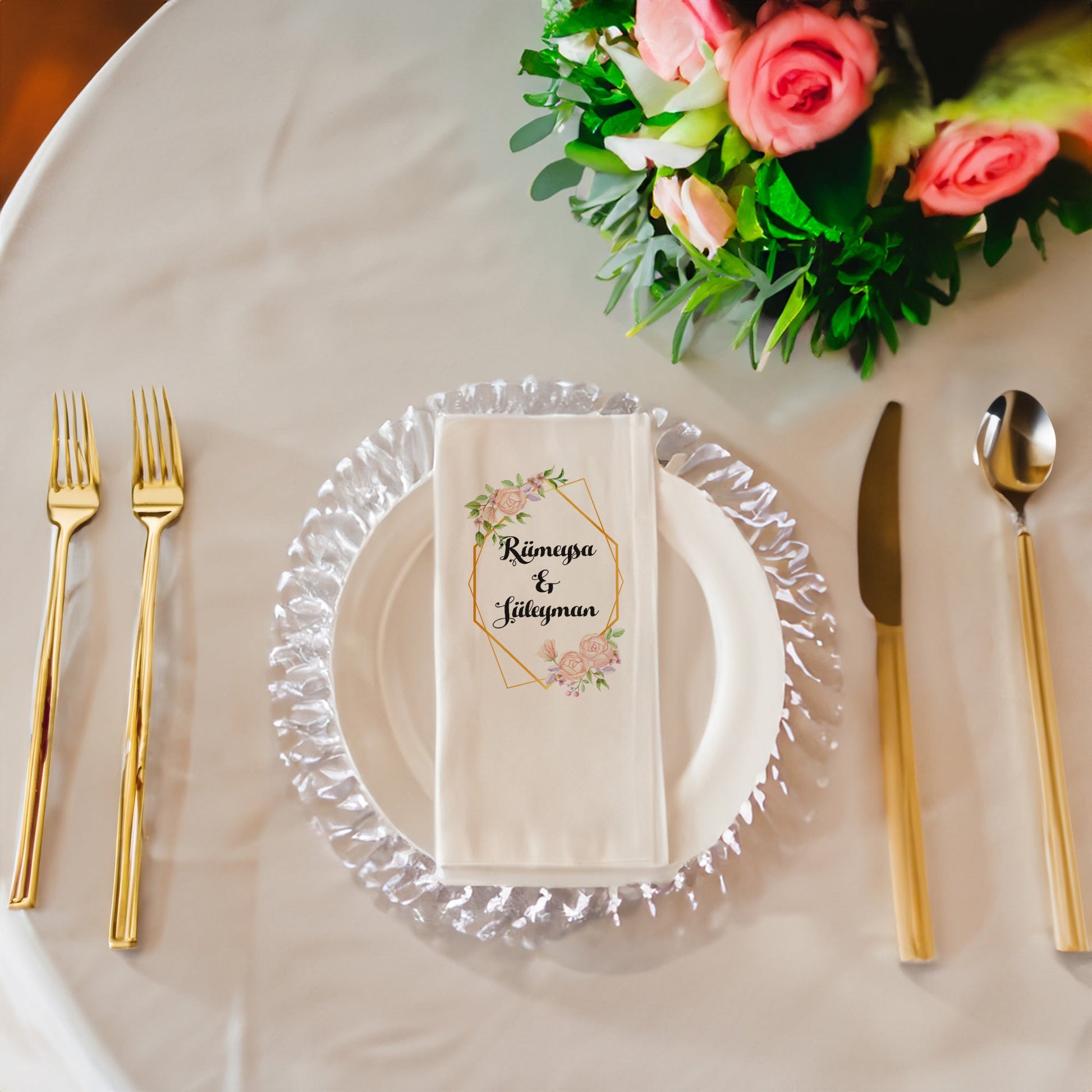 Özel günlerinizi unutulmaz kılacak zarif bir dokunuş: Gül Detaylı Gold Çerçeveli Düğün, Nişan, Söz ve Kına Peçetesi Seti!