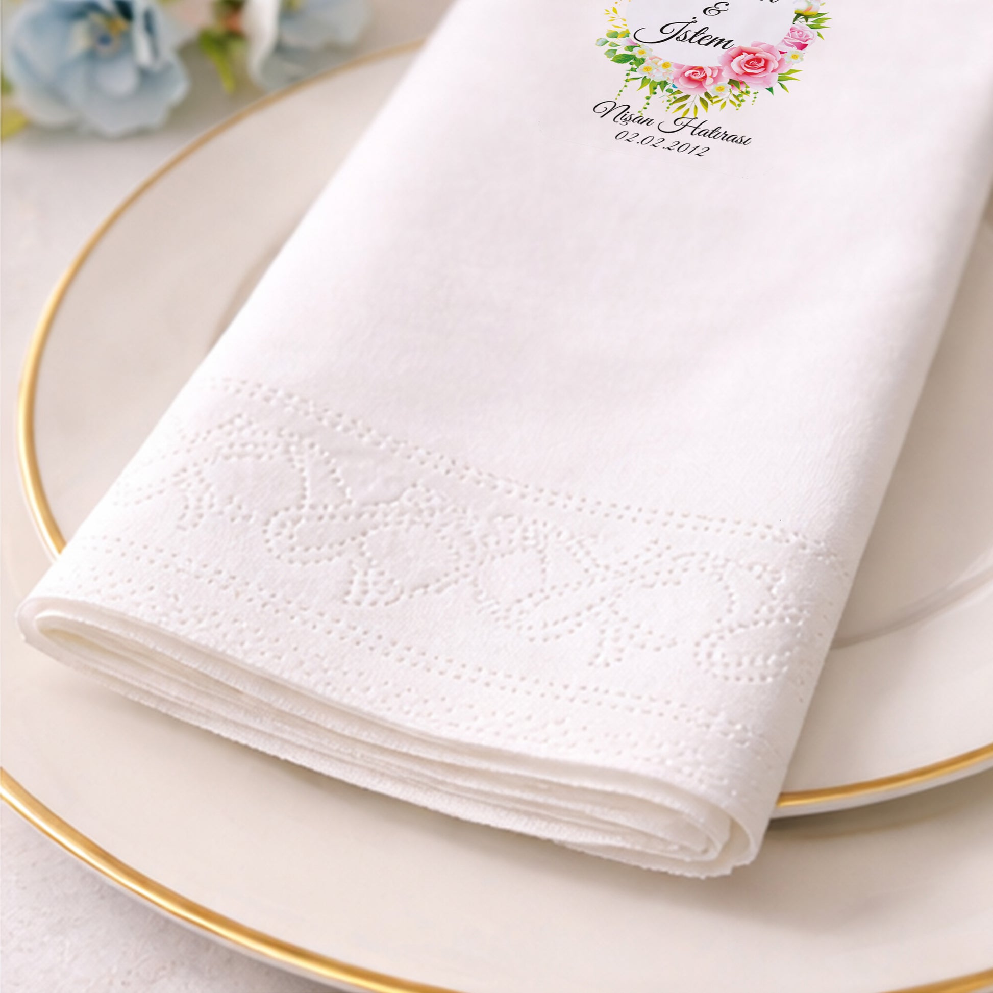 Pembe gül ve çiçek illüstrasyonlarıyla hazırlanan bu baskılı peçete, nişan organizasyonları için romantik ve sıcak bir atmosfer oluşturur. İsim ve tarih alanı sayesinde özel gün peçetesi olarak kişiselleştirilebilir. Organizasyon peçetesi olarak masalara zarif bir renk dengesi kazandırır. Nişan peçetesi olarak kullanılan ürün, baskılı peçete yapısıyla yazıların netliğini ve desenlerin canlılığını korur. Romantik konseptleri seven çiftler için estetik bir tamamlayıcıdır. Zamansız çiçek tasarımı sayesinde uzun yıllar saklanabilecek, güven veren ve şık bir hatıra niteliği taşır.