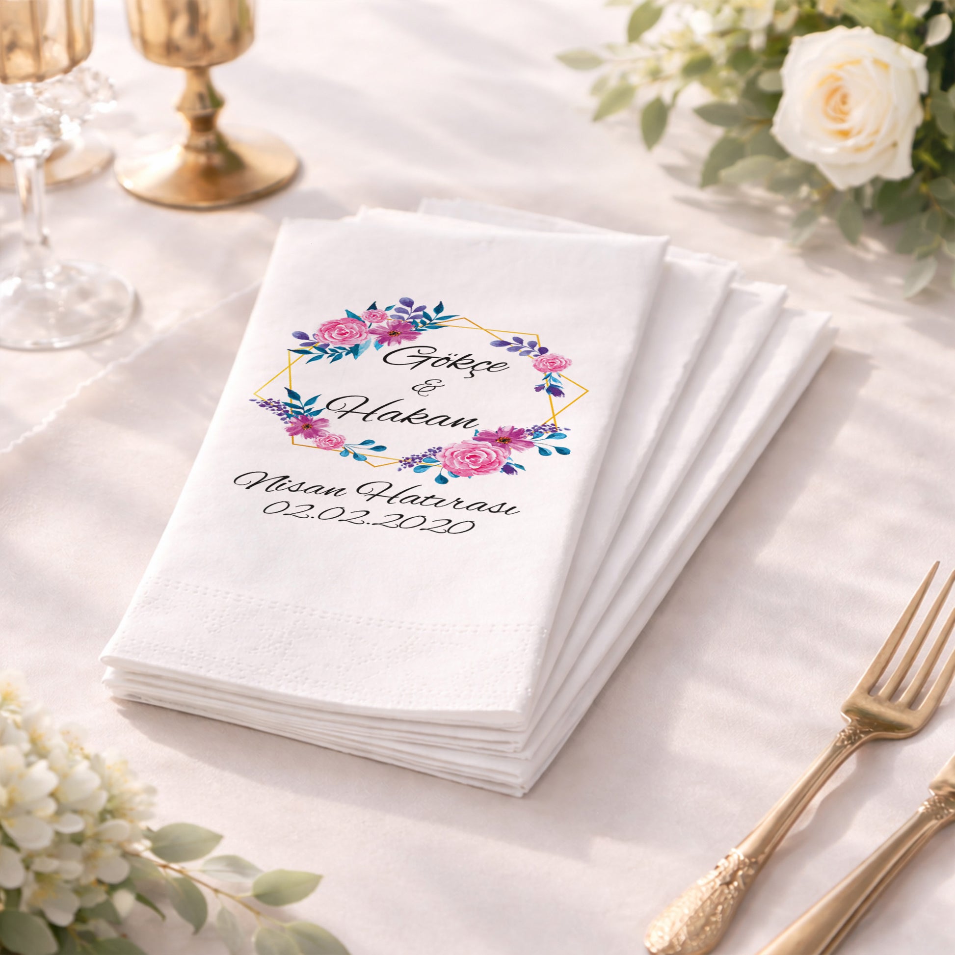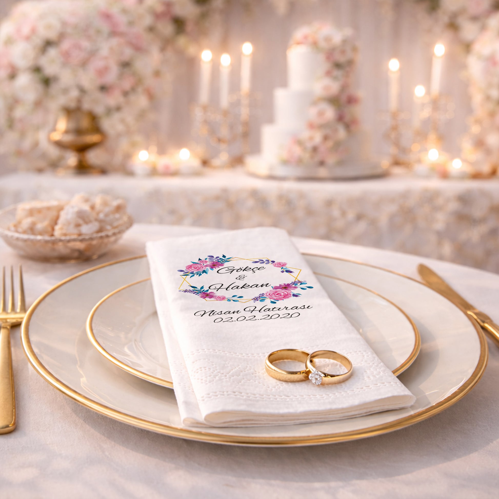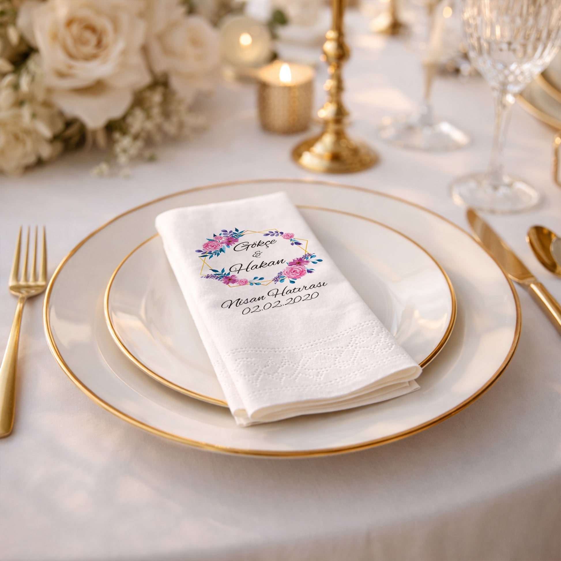 Gül detaylı altın çerçeve tasarımıyla hazırlanan bu baskılı peçete, nişan organizasyonları için zarif ve romantik bir sunum sağlar. İsim ve tarih bilgisiyle kişiselleştirilen tasarım, özel gün peçetesi olarak masalara estetik bir dokunuş katar. Organizasyon peçetesi olarak şık ve düzenli bir görünüm sunar. Nişan peçetesi kullanımına uygundur. Baskılı peçete kalitesiyle çiçek detayları canlı ve nettir. Klasik-romantik tarzı seven çiftler için güvenli bir tercihtir.