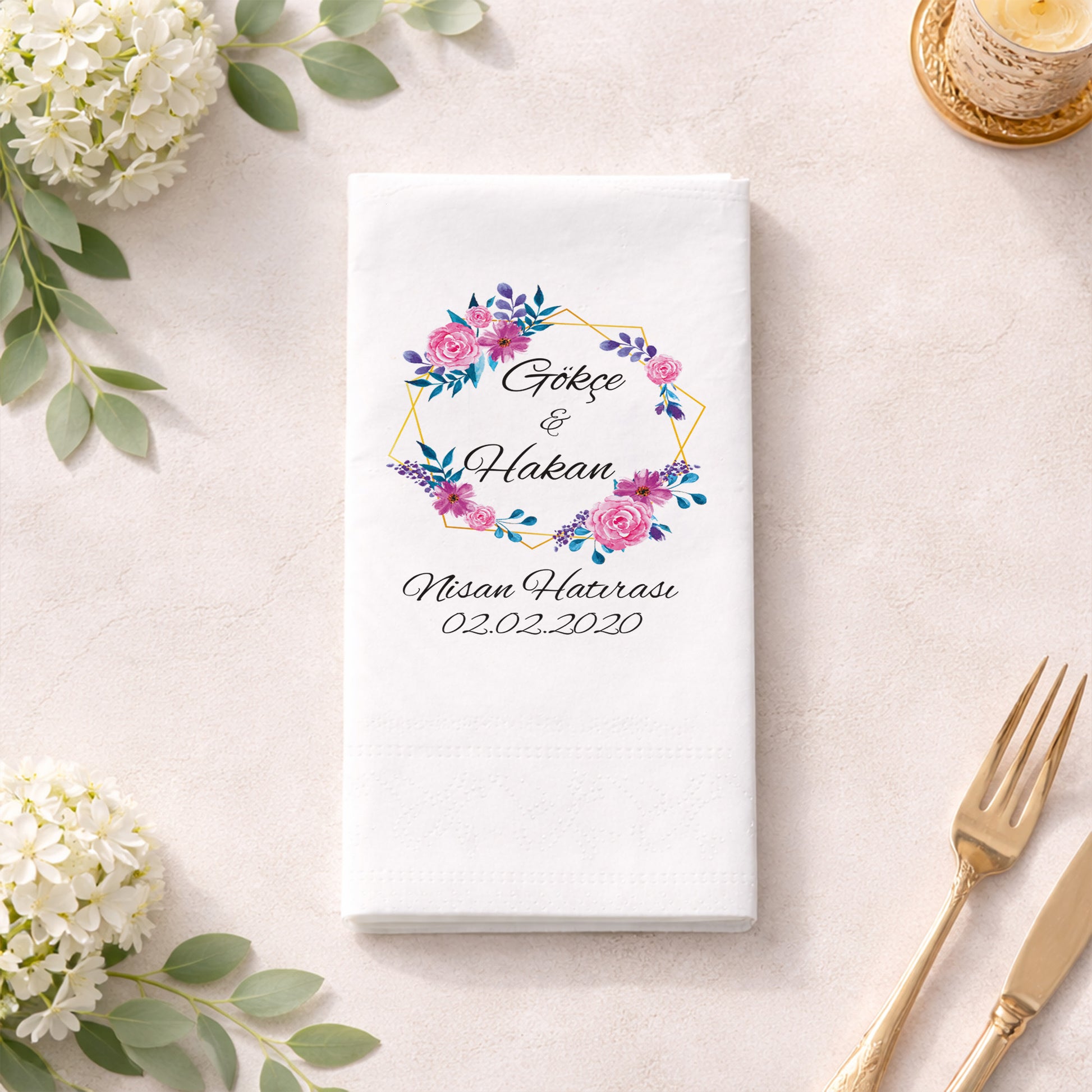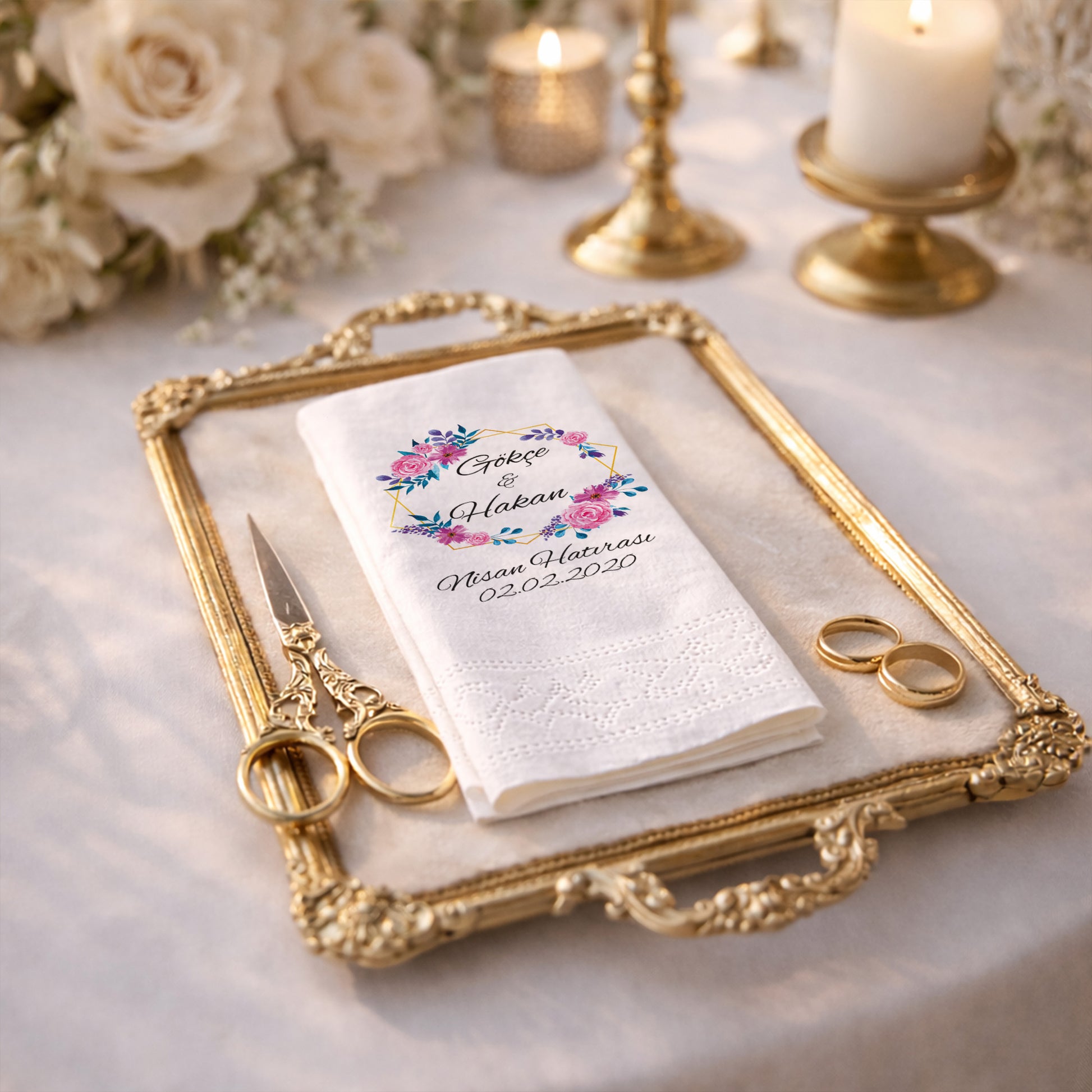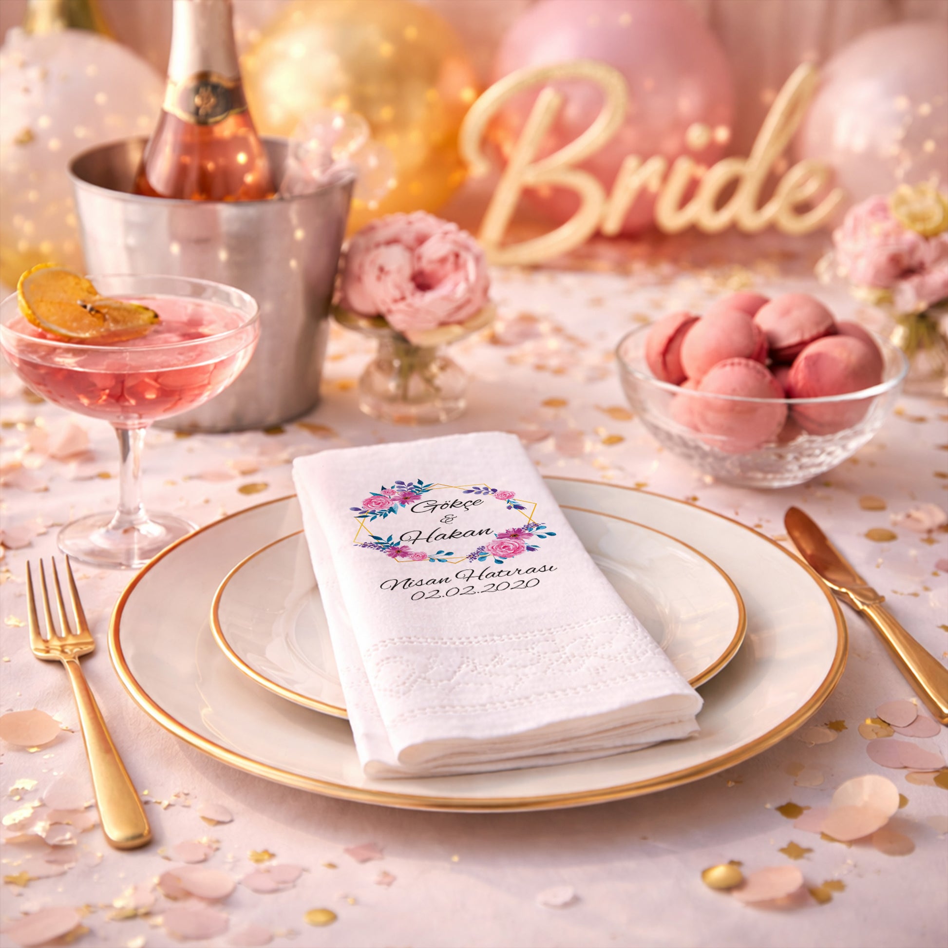 Gül detaylı altın çerçeve tasarımıyla hazırlanan bu baskılı peçete, nişan organizasyonları için zarif ve romantik bir sunum sağlar. İsim ve tarih bilgisiyle kişiselleştirilen tasarım, özel gün peçetesi olarak masalara estetik bir dokunuş katar. Organizasyon peçetesi olarak şık ve düzenli bir görünüm sunar. Nişan peçetesi kullanımına uygundur. Baskılı peçete kalitesiyle çiçek detayları canlı ve nettir. Klasik-romantik tarzı seven çiftler için güvenli bir tercihtir.
