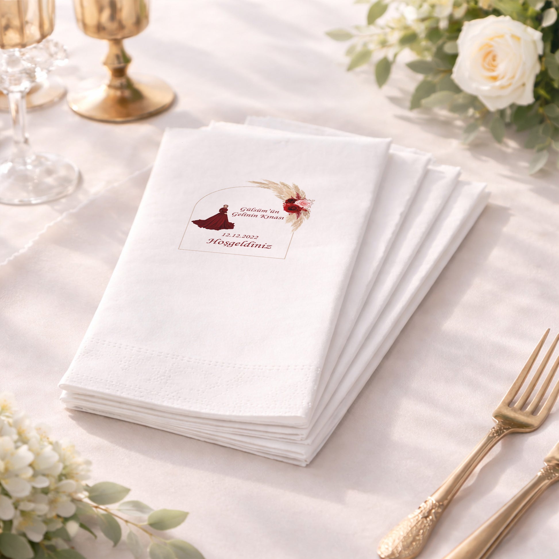 Gülsüm’ün Gelin Kınası için tasarlanan bu model, kabarık etekli bordo elbise illüstrasyonu ile kına gecesi ihtişamını masalara taşıyor. Arşivsel kemer tasarımı ve köşedeki çiçek buketi detayları, baskılı peçete ürününü görsel bir şölene dönüştürür. Organizasyonlarınızda kullanacağınız bu özel gün peçetesi, hem hijyenik bir çözüm sunar hem de dekoratif bir obje işlevi görür. Üstün kaliteli kağıt malzemesi üzerine uygulanan canlı renkler, temanızın bütünlüğünü korur. "Hoşgeldiniz" ibaresiyle misafirlerinizi nezaketle karşılayan bu tasarım, davetinizin kalitesini vurgular. Düğün, nişan ve kına gibi törenlerde fark yaratmak isteyenlerin tercihi olan bu peçete, kişiselleştirilmiş içeriğiyle anlam kazanır. Siz de bu şık tasarım ile kına masalarınızı taçlandırabilirsiniz.