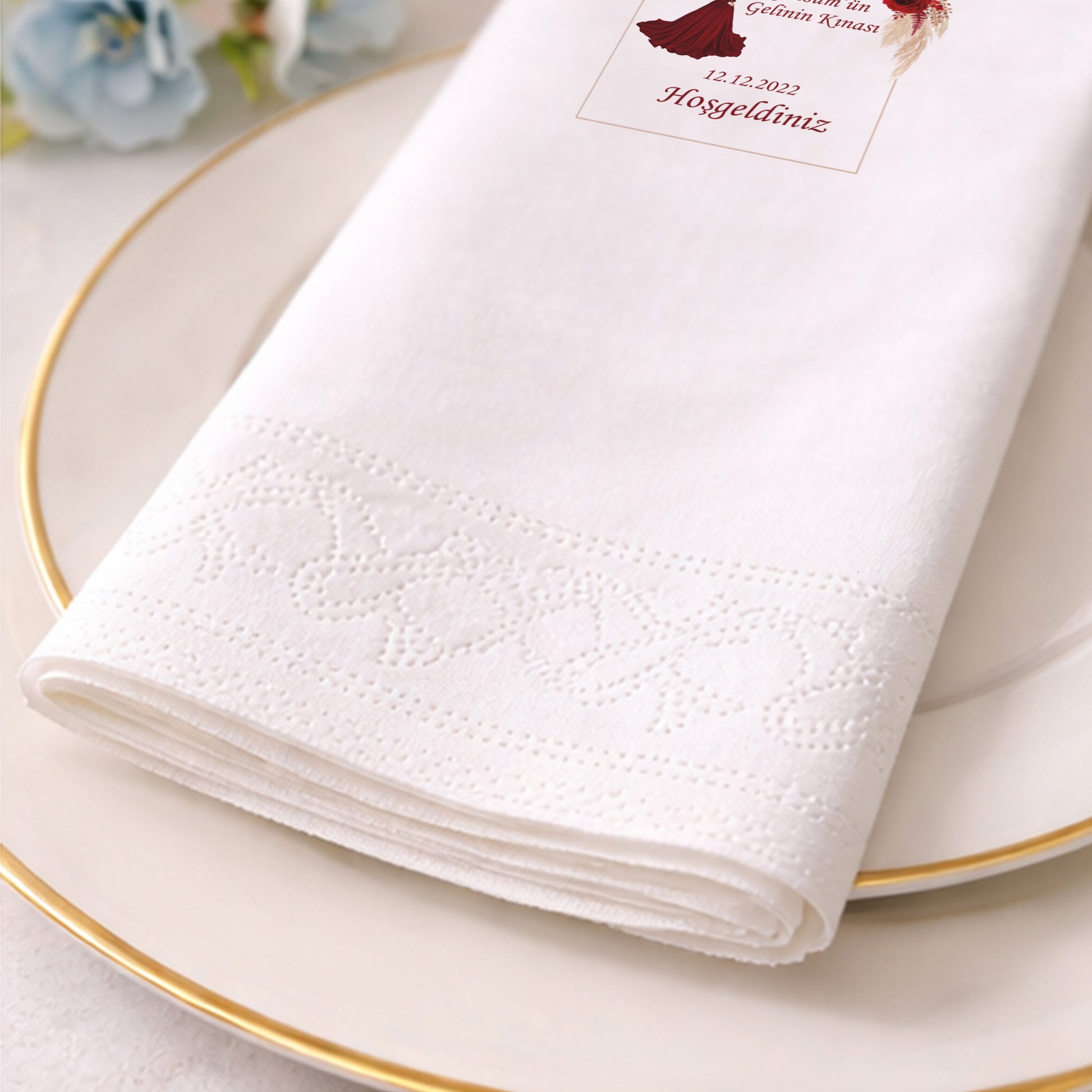 Tasarım, peçetenin ön yüzünde tam merkezde olacak şekilde yüksek çözünürlüklü baskı ile uygulanır. Dilersen özel konumlandırma taleplerini de iletebilirsin.