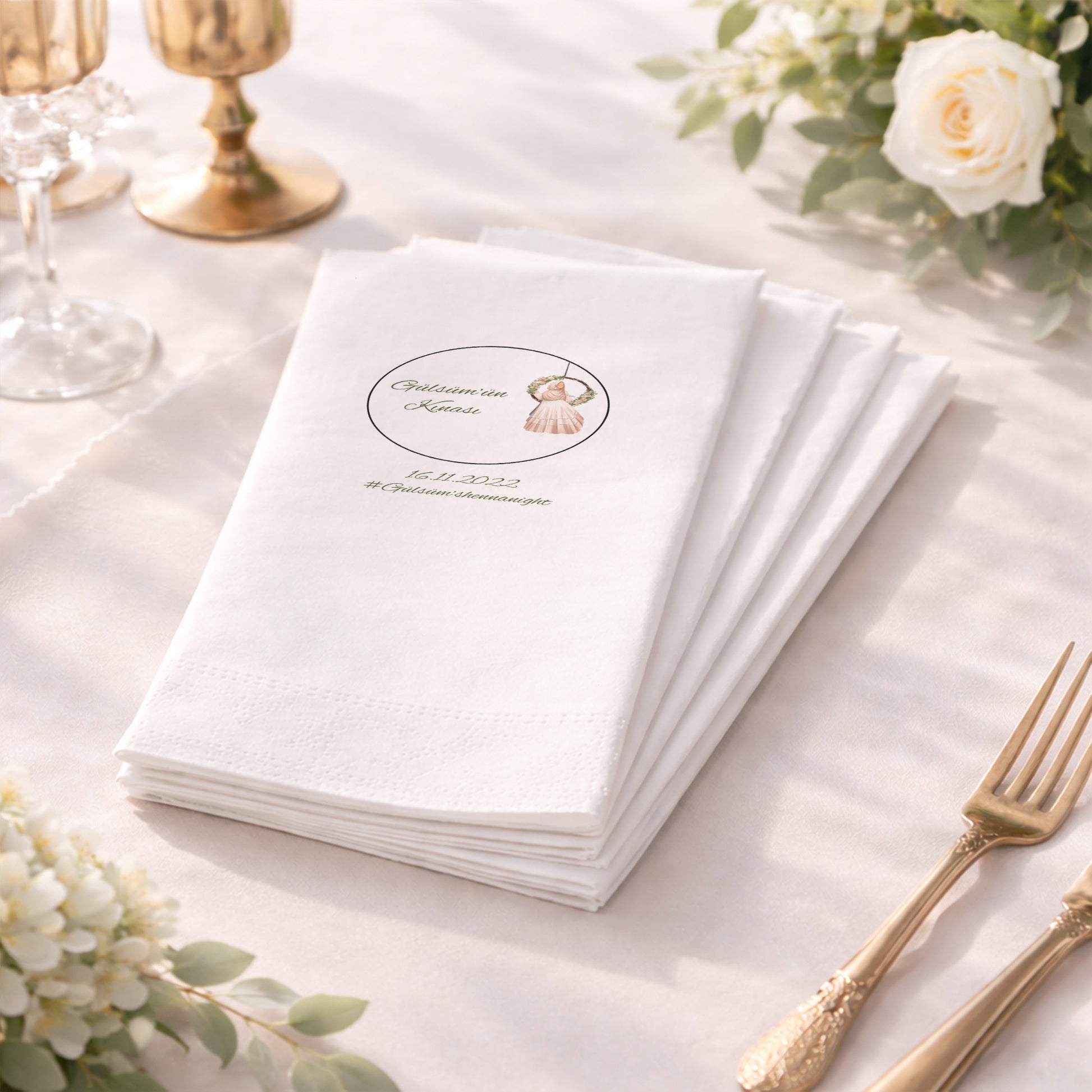 Gülsüm’ün Kınası temalı bu siyah baskılı peçete, salıncakta sallanan çiçekli gelin figürüyle masalsı bir atmosfer sunuyor. Soft renklerin siyah zemin üzerindeki kontrastı, organizasyon peçetesi tasarımına derinlik ve estetik kazandırır. Özel gün peçetesi kategorisinde yer alan bu ürün, kına gecesinin romantik ruhunu yansıtan zarif yazı tipleri ve hashtag detaylarıyla tamamlanmıştır. Misafirlerinizin sunum masalarında ilk dikkatini çekecek bu parça, kına hatırası olarak da akıllarda kalır. Yüksek emicilik ve yumuşak dokusu, kullanım konforu sağlarken görsel bütünlüğü bozmaz. Profesyonel baskı kalitesi sayesinde ince işlenmiş çiçek detayları net bir şekilde görülür. Düğün hazırlıkları sürecinde özgün bir imza atmak isteyen gelinler için bu ürün eşsiz bir fırsattır.