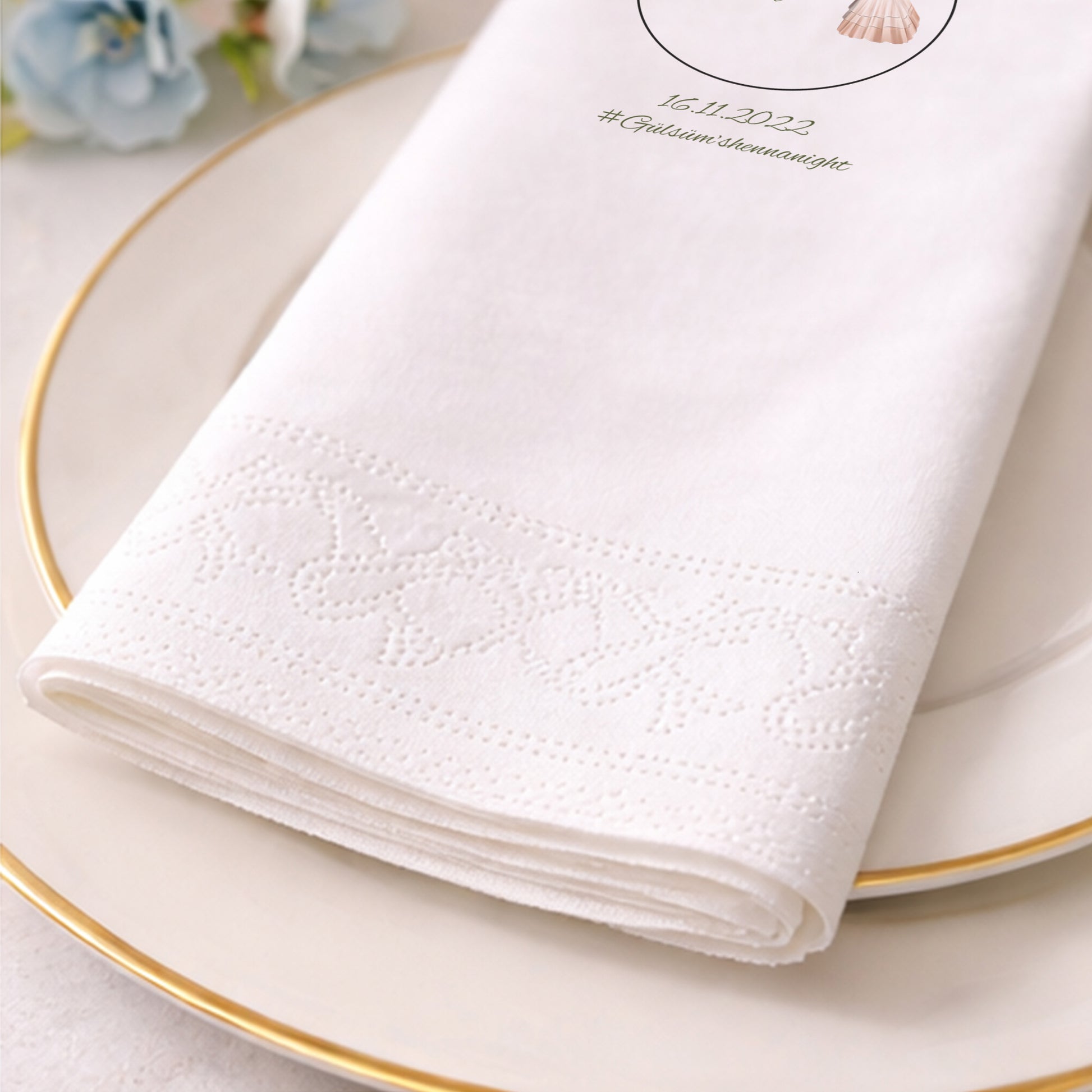 Tasarım, peçetenin ön yüzünde tam merkezde olacak şekilde yüksek çözünürlüklü baskı ile uygulanır. Dilersen özel konumlandırma taleplerini de iletebilirsin.