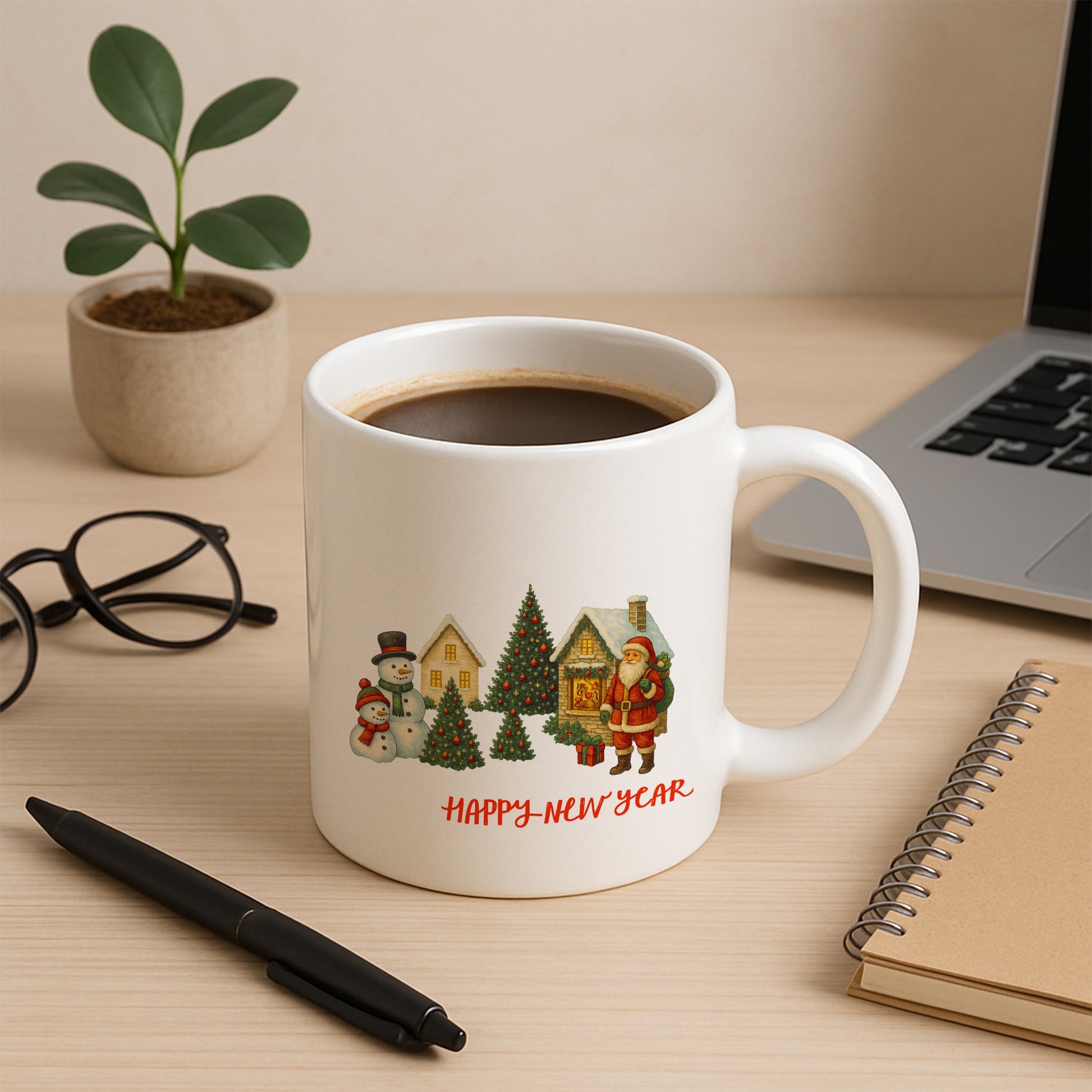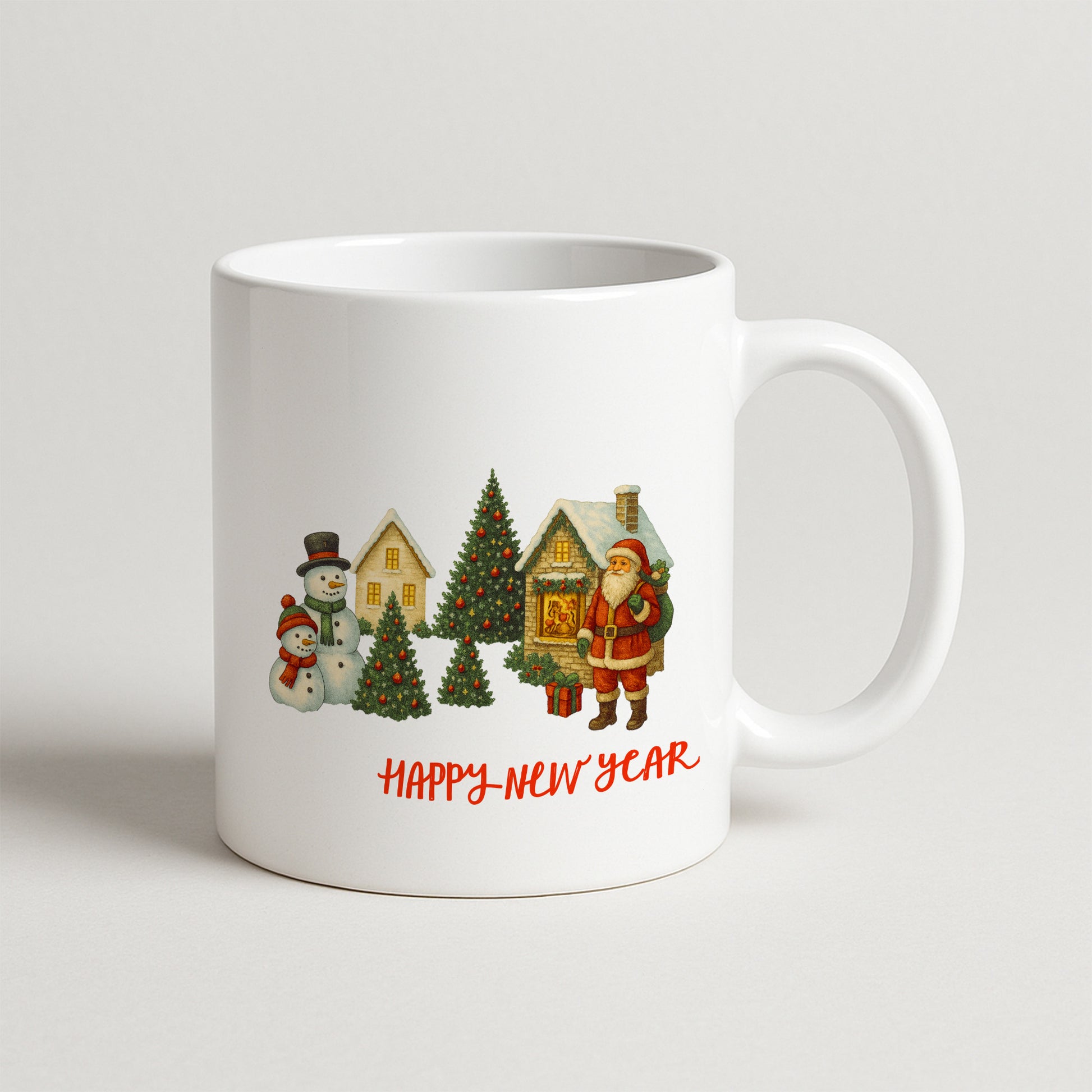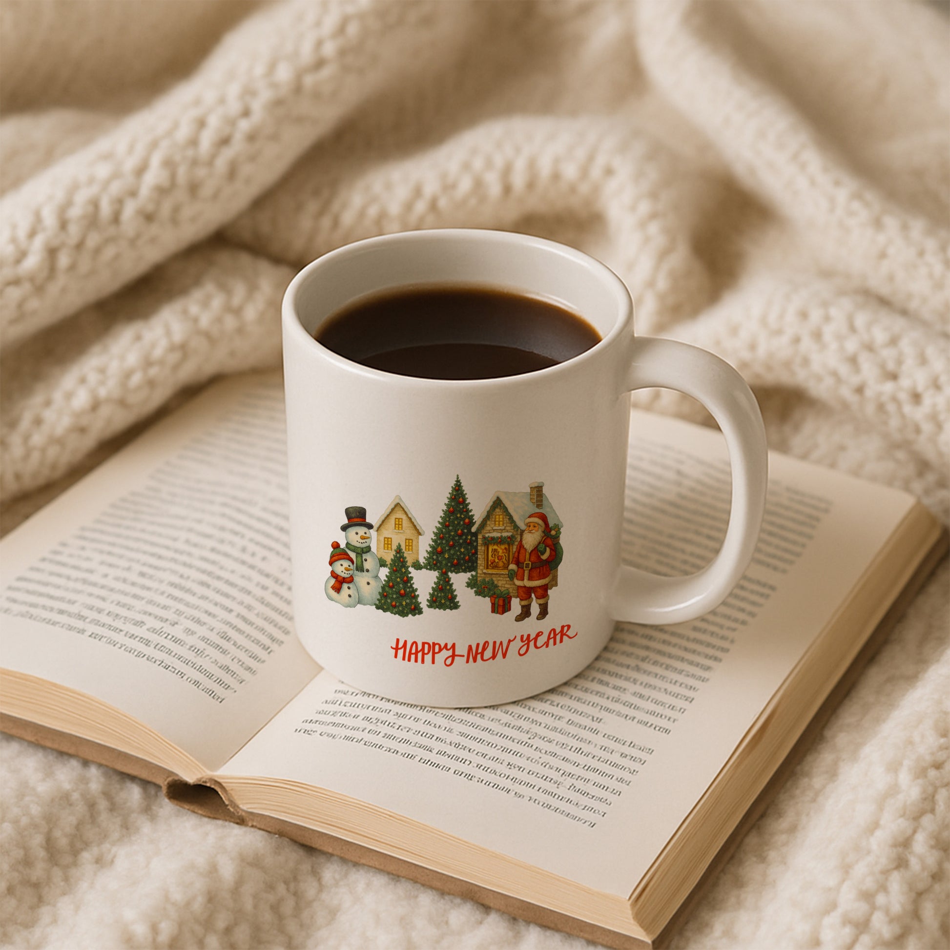 Bu özel tasarım kupa, yeni yılın huzurlu ve nostaljik duygusunu kış köyü temasıyla bir araya getirir. Karlarla kaplı evler, süslenmiş çam ağaçları, kardan adamlar ve Noel Baba figürü; yılbaşı akşamlarının sıcaklığını ve paylaşma hissini yansıtan bir hikâye sunar. Alt kısımda yer alan “Happy New Year” yazısı, tasarımı zamansız ve evrensel bir yeni yıl mesajıyla tamamlar.