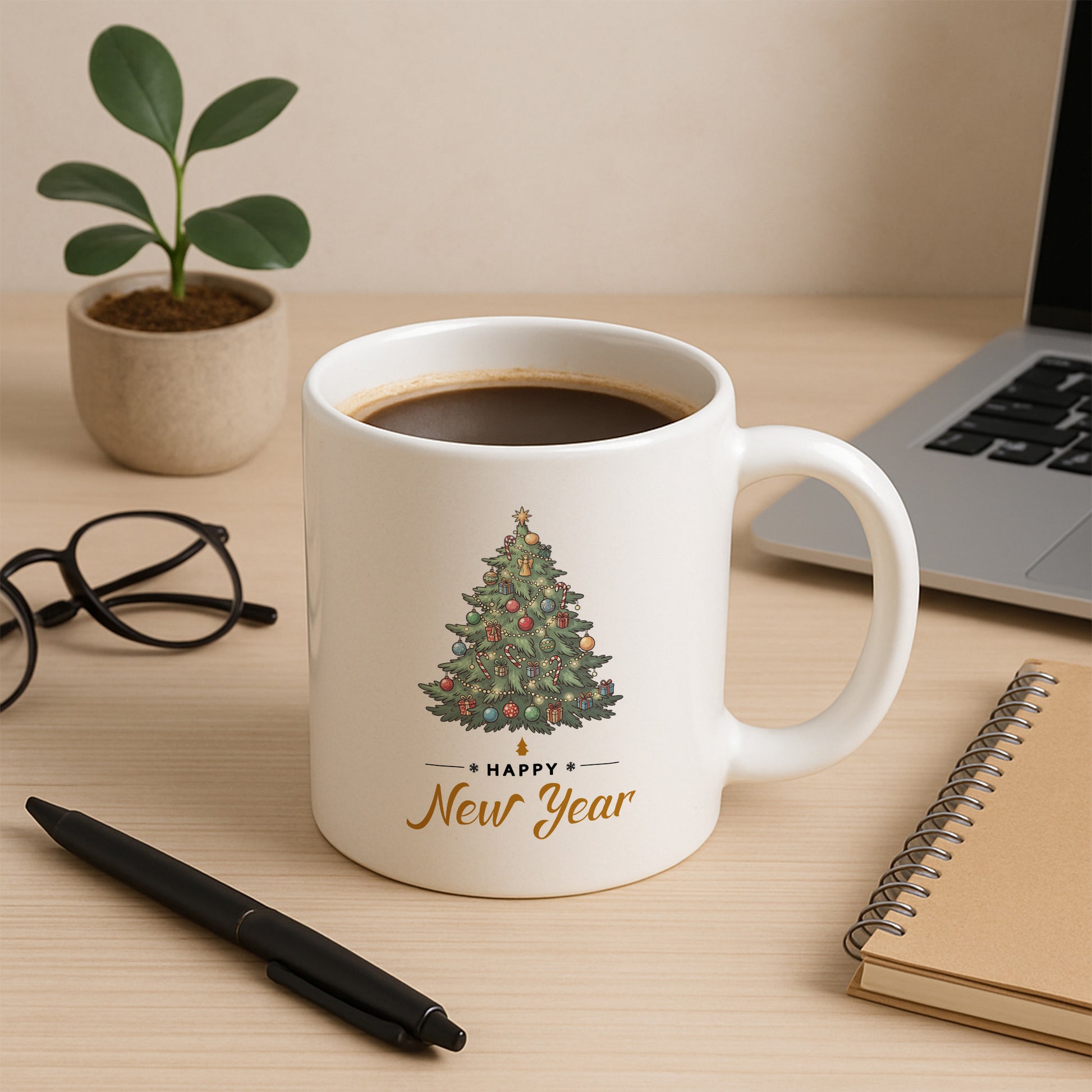 Bu özel tasarım kupa, yeni yılın umut dolu başlangıcını zarif bir yılbaşı ağacı illüstrasyonu ile buluşturur. Ağaç üzerindeki süsler, hediyeler ve ışık detayları, yeni yılın neşesini ve paylaşma duygusunu yansıtan sıcak bir hikâye anlatır. Beyaz zemin üzerinde konumlanan tasarım, kupaya ferah ve zamansız bir görünüm kazandırır.