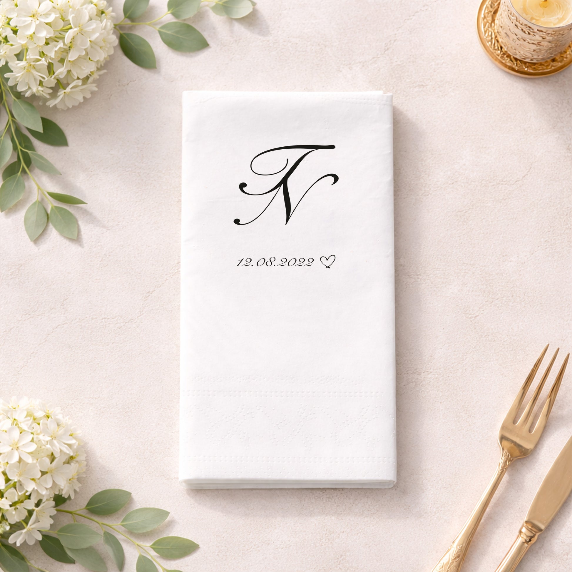 Siyahın asaletini ve kişiselleştirmenin gücünü birleştiren bu monogram tasarımlı peçete, "N" baş harfi ve 12.08.2022 tarihi ile unutulmaz bir günün simgesidir. Kalp ikonuyla tamamlanan bu zarif tasarım, düğün ve özel davetlerinizde elit bir atmosfer yaratır. Minimalist bir yaklaşımla hazırlanan baskı, siyah kağıt üzerinde kusursuz bir görünüm sergiler. Özel gün peçetesi arayışında olan çiftler için hem modern hem de hatıra değeri taşıyan harika bir tercihtir. Yüksek gramajlı kağıt yapısı ve kaliteli baskı işçiliği ile sunulan bu ürün, masanızdaki her tabağın yanına estetik bir dokunuş katar. Misafirleriniz bu ince düşünülmüş detayı kesinlikle fark edecektir. Organizasyonlarınızda kişisel bir dokunuş bırakmak ve kutlamanızı daha özel kılmak için bu baskılı peçete modelimizi tercih edebilirsiniz. Şıklığın detaylarda gizli olduğunu bilenler için tasarlanmış bu ürün, markamızın kalite standartlarını yansıtır.