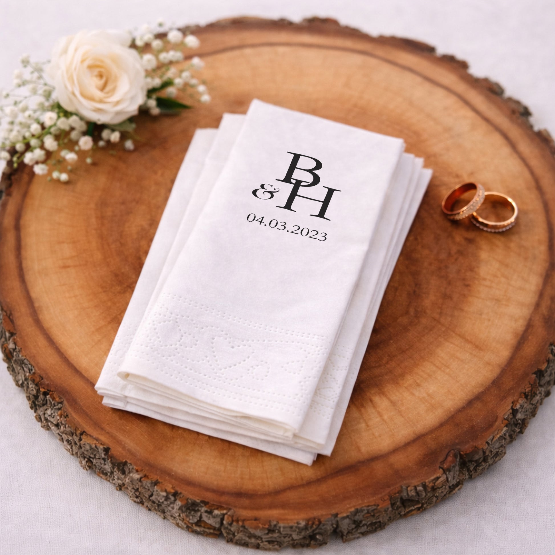 Harf monogram odaklı bu baskılı peçete, düğün ve nişan organizasyonlarında modern ve prestijli bir sunum sağlar. Sade tipografiyle hazırlanan tasarım, organizasyon peçetesi olarak masalarda düzenli ve kurumsal bir görünüm oluşturur. Özel gün peçetesi olarak isim baş harflerini öne çıkararak kişisel bir detay sunar. Düğün peçetesi ve nişan peçetesi olarak farklı konseptlerle uyumludur. Baskılı peçete kalitesi sayesinde yazılar net ve şıktır. Zamansız ve profesyonel bir stil arayan çiftler için ideal bir tercihtir.