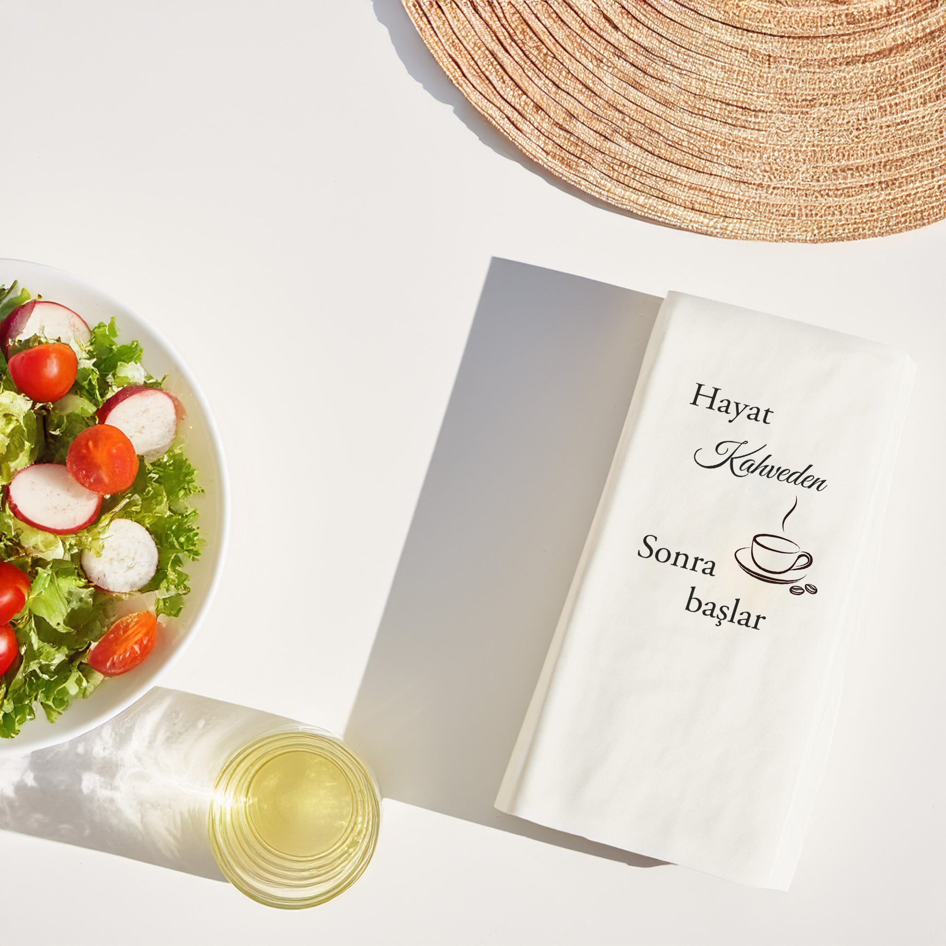 Kahve olmadan güne başlayamayanlar için tasarlanan “Hayat Kahveden Sonra Başlar” Yazılı Baskılı Peçete, minimalist kahve fincanı çizimi ve zarif tipografisiyle sofralara hem şıklık hem de espri katıyor.