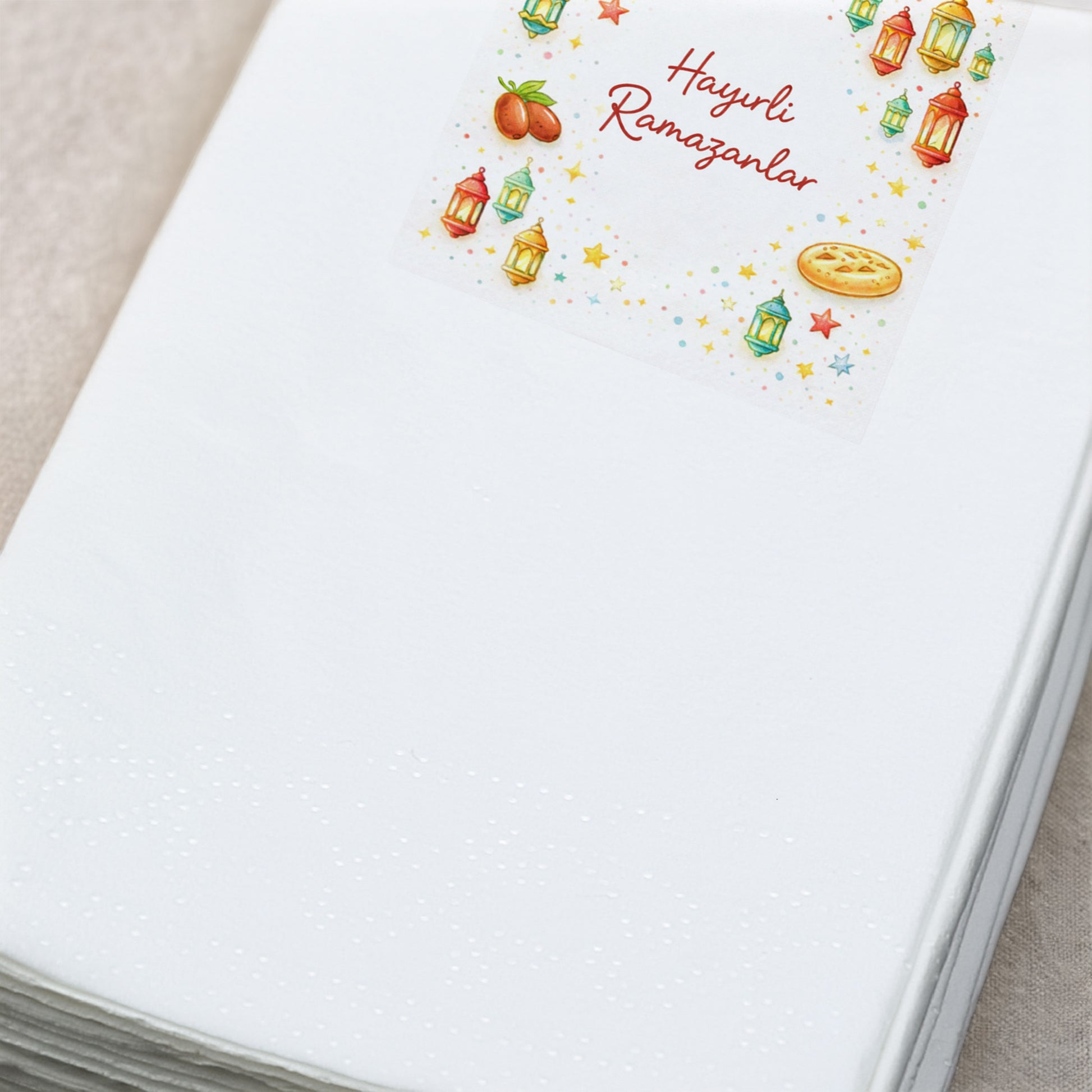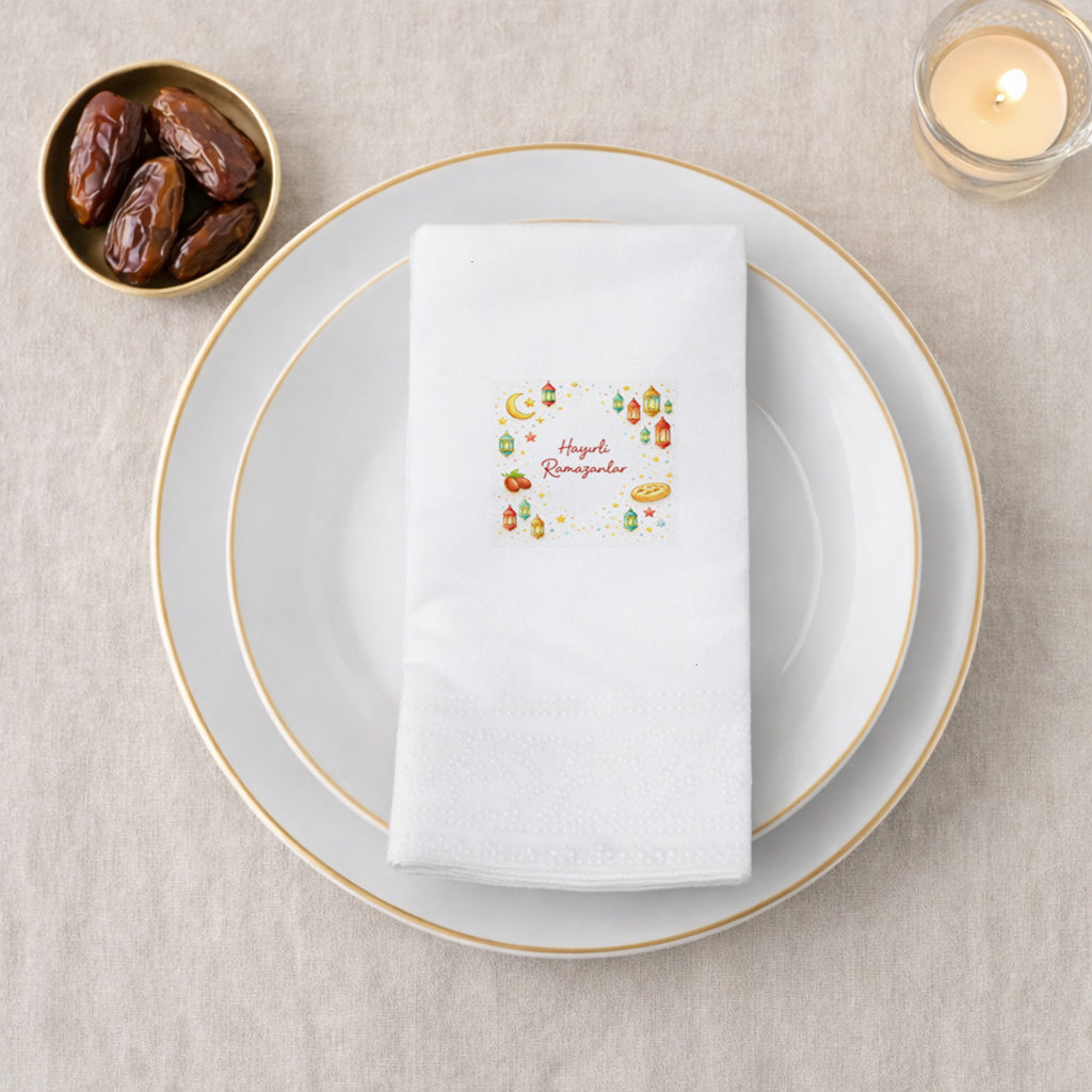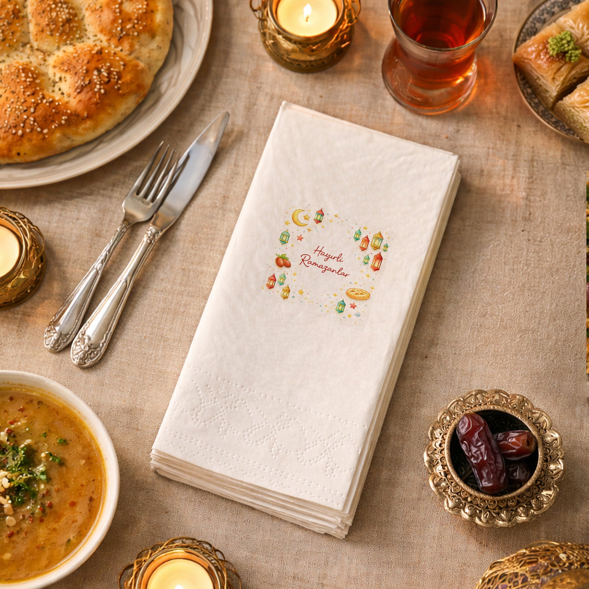 Hayırlı Ramazanlar” yazılı bu Ramazan Desenli Baskılı Peçete, iftar sofralarına sıcak ve davetkâr bir atmosfer katar.