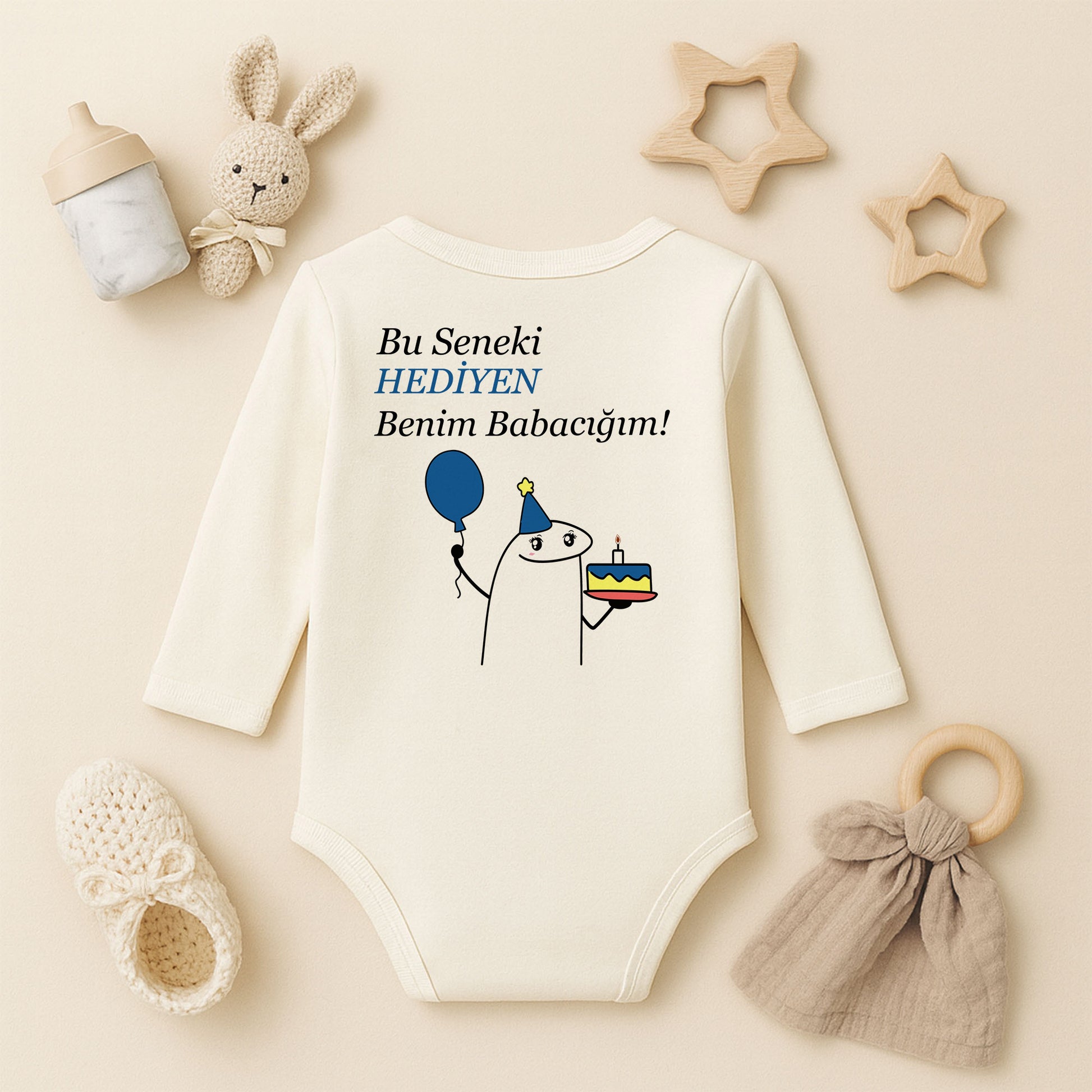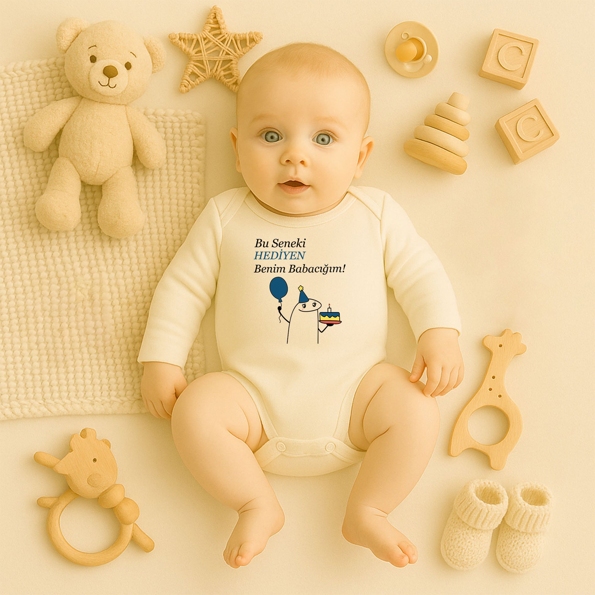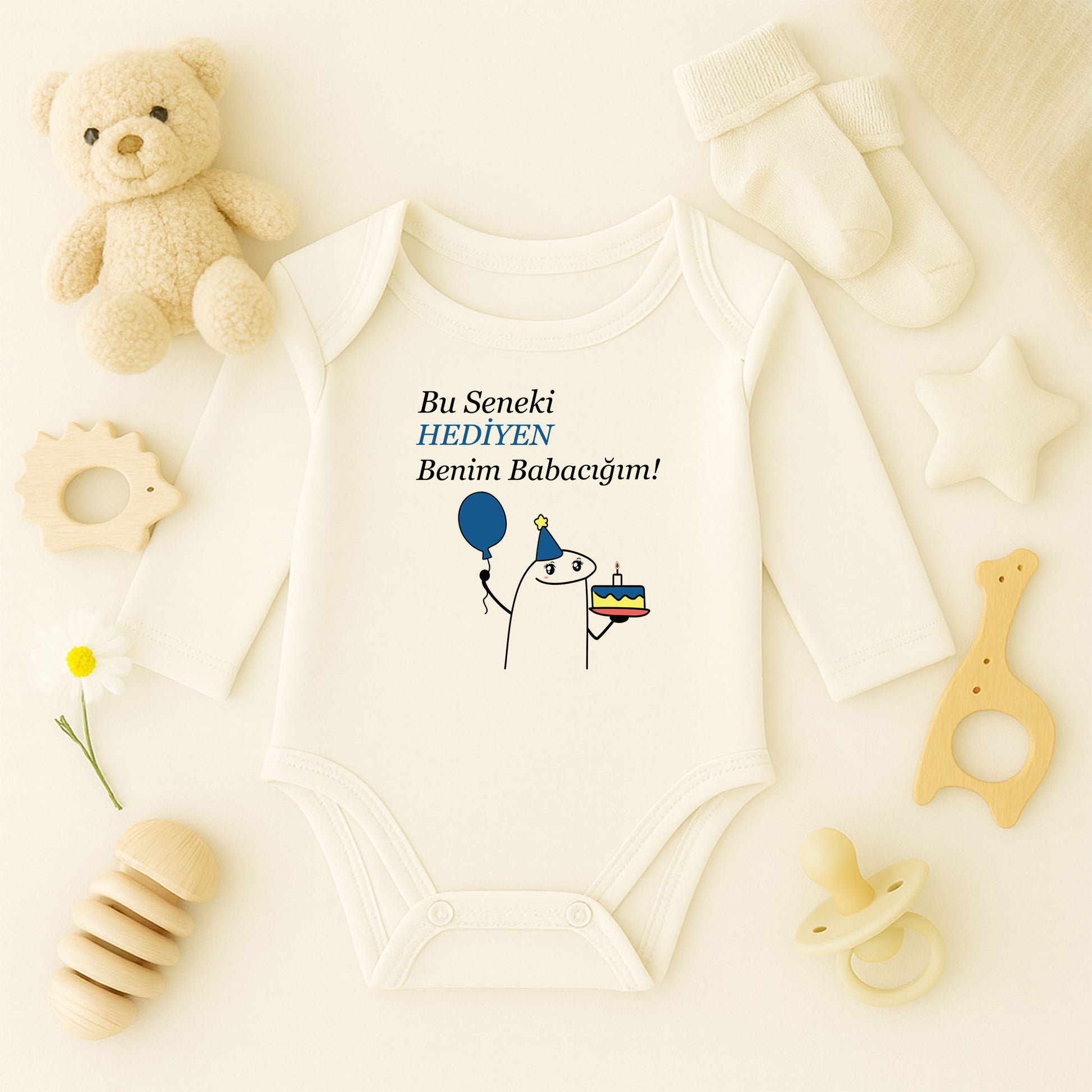 “HEDİYEN” yazısı, balon ve doğum günü pastası figürüyle tasarlanan bu bebek zıbını; sade, esprili ve dikkat çekici tarzıyla öne çıkar. Özellikle doğum günü kutlamaları, baby shower’lar ve özel gün hediyeleri için çok sevilen bir modeldir.