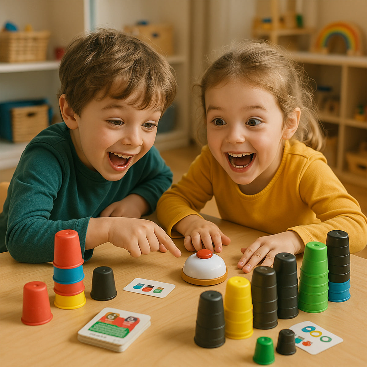 Btoys Bardaklar oyunu ile çocuklarınızın dikkat, hız ve el becerilerini geliştirin! "Zile İlk Basan Sen Ol!" temasıyla tasarlanan bu eğlenceli oyun, çocukların dikkat ve konsantrasyonlarını artırırken aynı zamanda hızlı düşünme yeteneklerini de geliştirir. Renkli bardakları doğru şekilde dizerek ve zili ilk çalarak oyunu kazanmaya çalışın!
