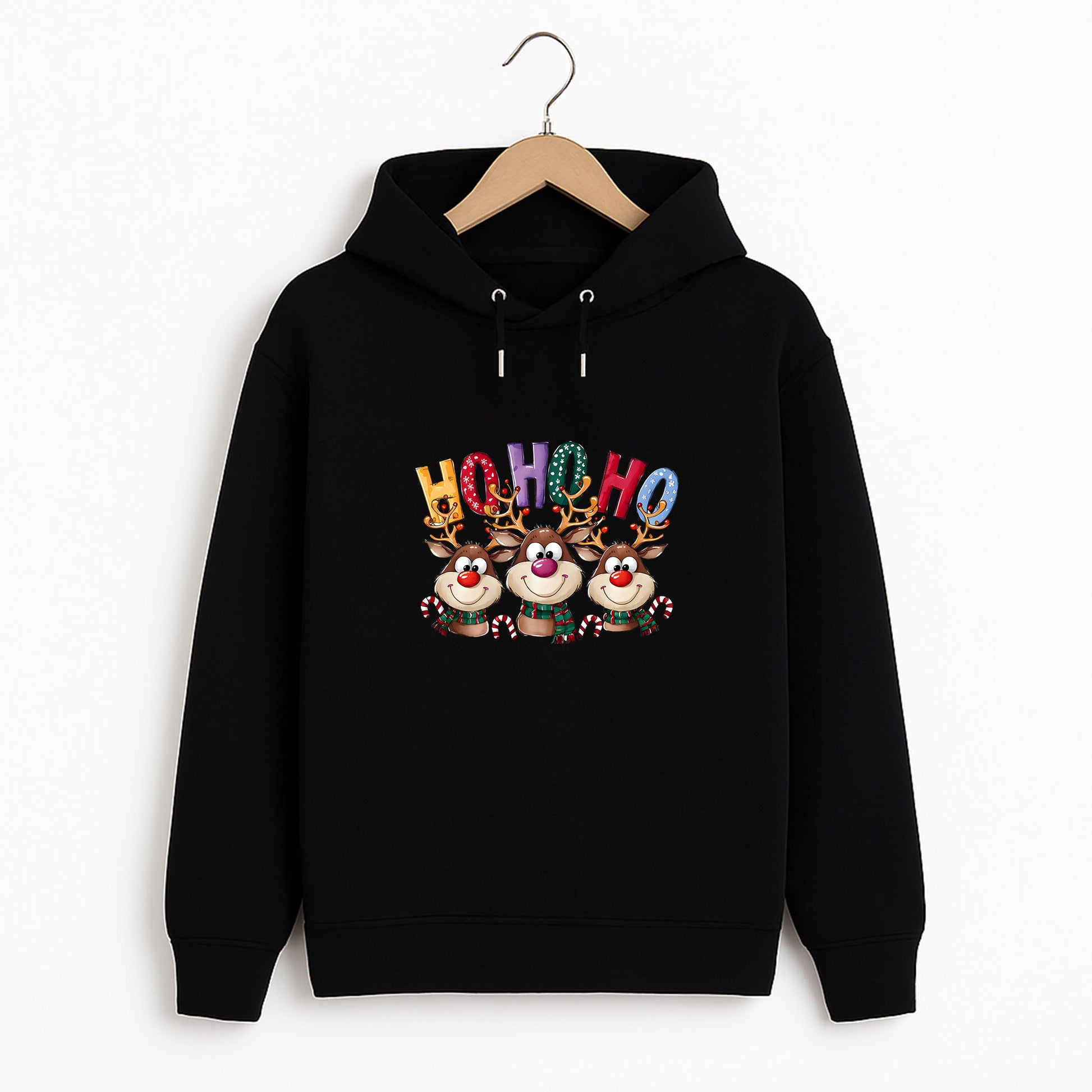 Ho Ho Ho yazılı, sevimli geyik figürlü yılbaşı temalı çocuk sweatshirt.