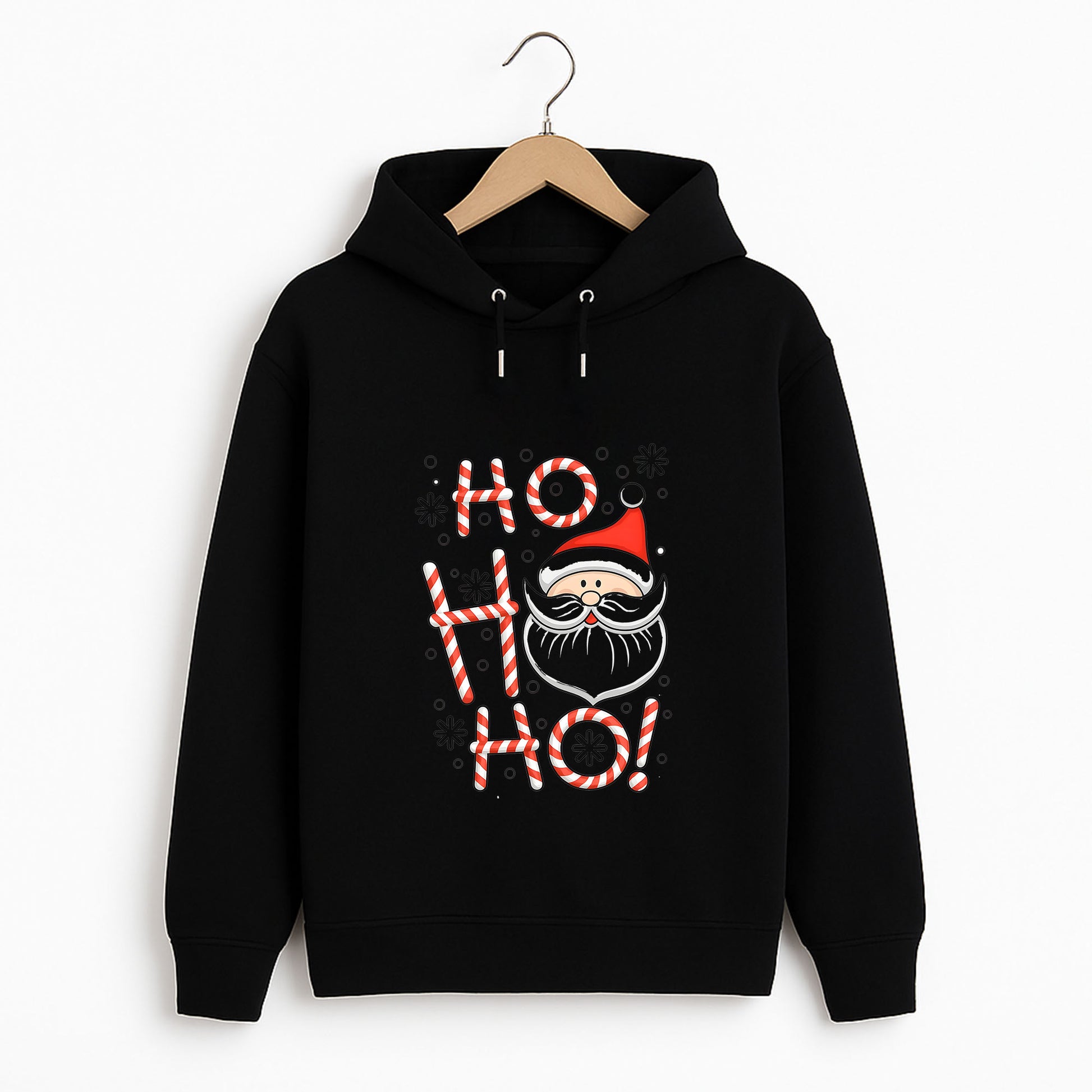 Yılbaşı neşesini klasik bir mesajla buluşturan bu çocuk sweatshirt, “Ho Ho Ho” yazısı ve sevimli Noel Baba yüzüyle eğlenceli bir stil sunar. Kırmızı-beyaz şeker kamışı desenli harfler, siyah zemin üzerinde güçlü bir kontrast oluşturarak tasarımı öne çıkarır.