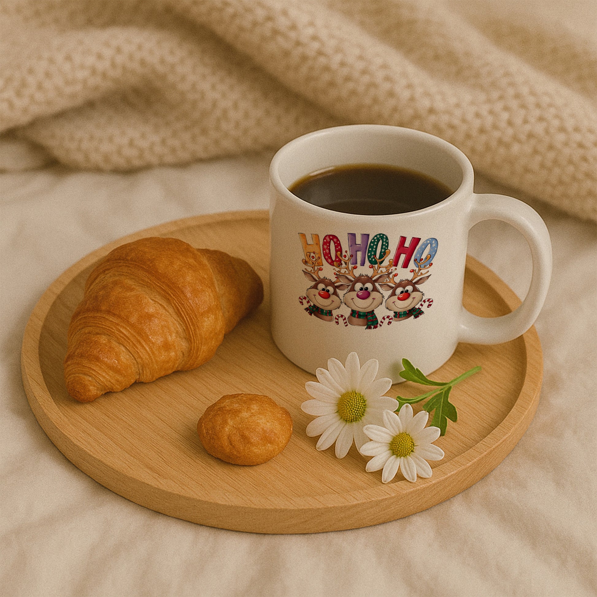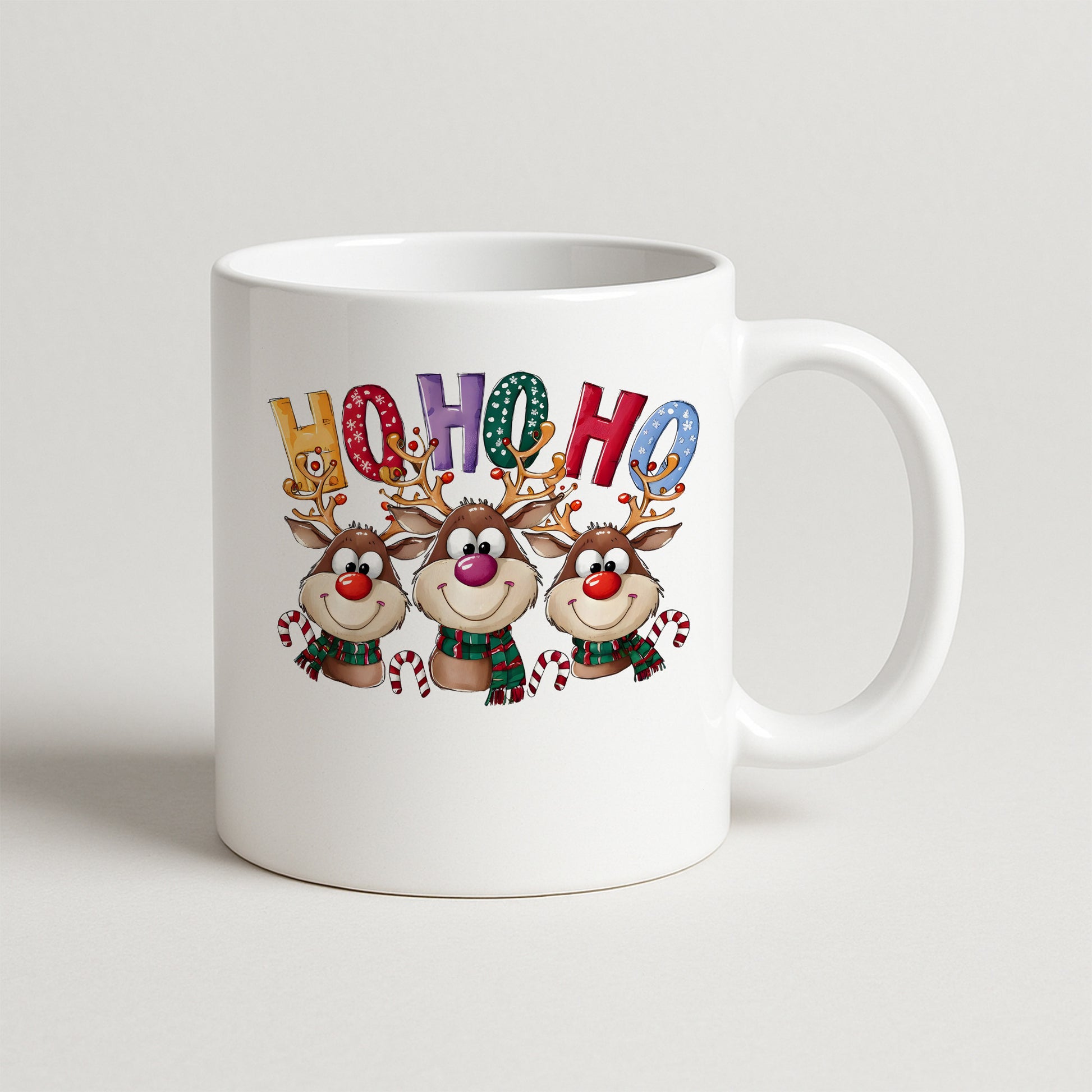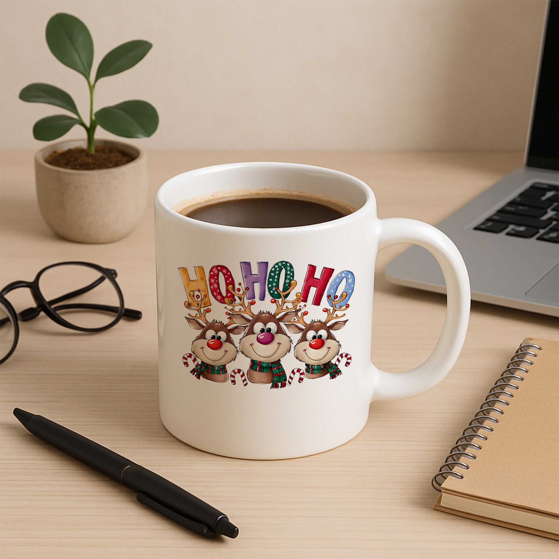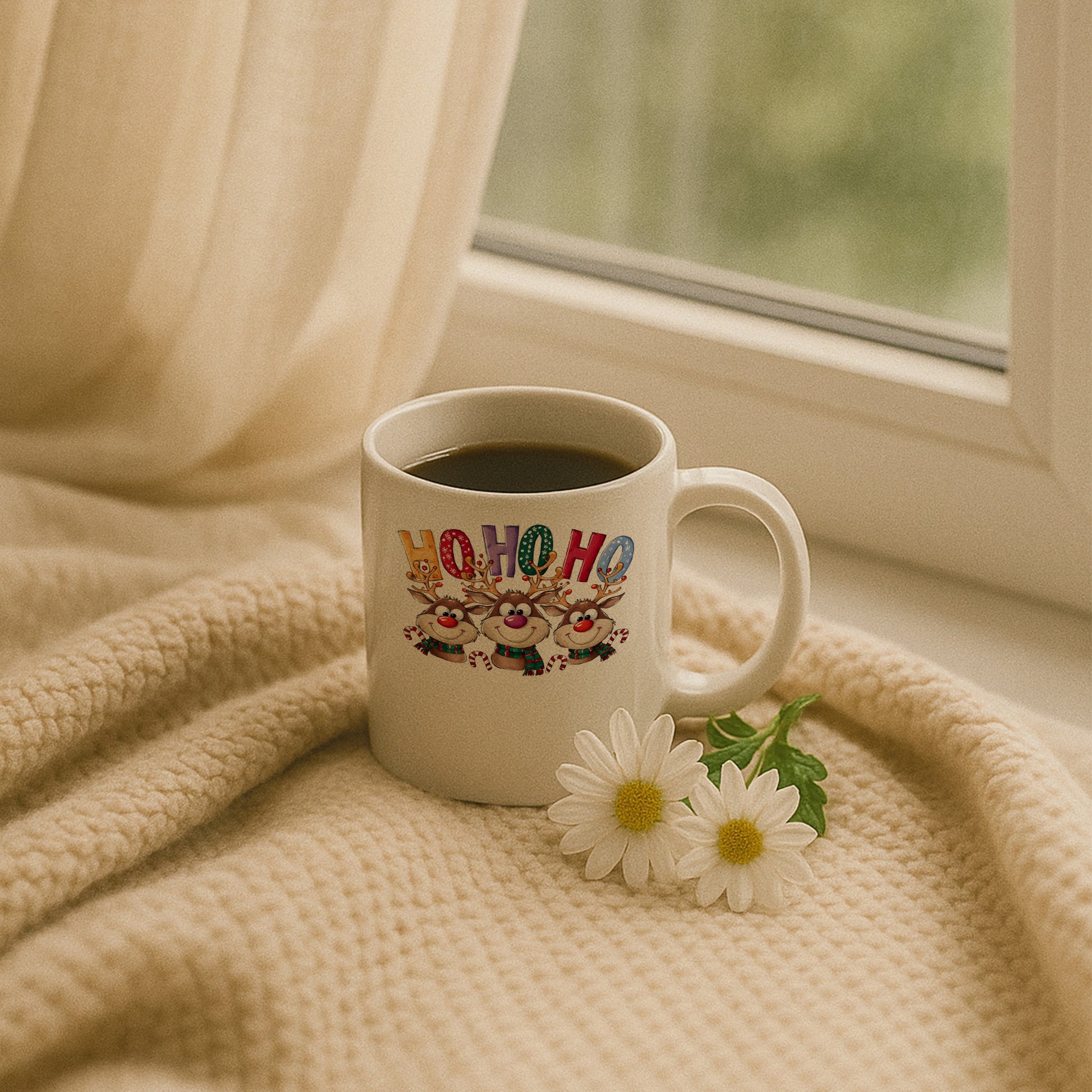 “Ho Ho Ho” yazısı ve üçlü geyik figürüyle tasarlanmış, enerjik ve dekoratif yılbaşı temalı kupa.