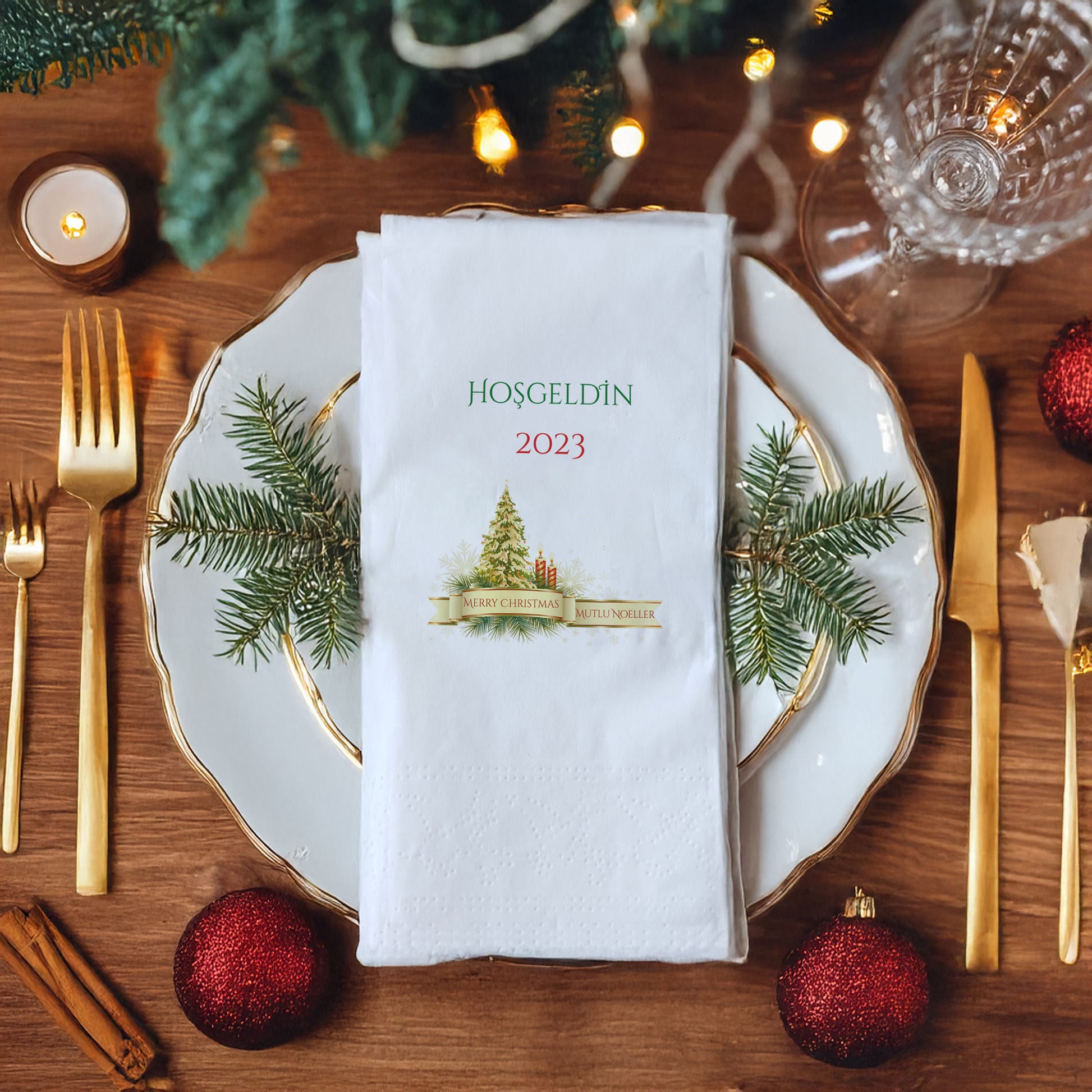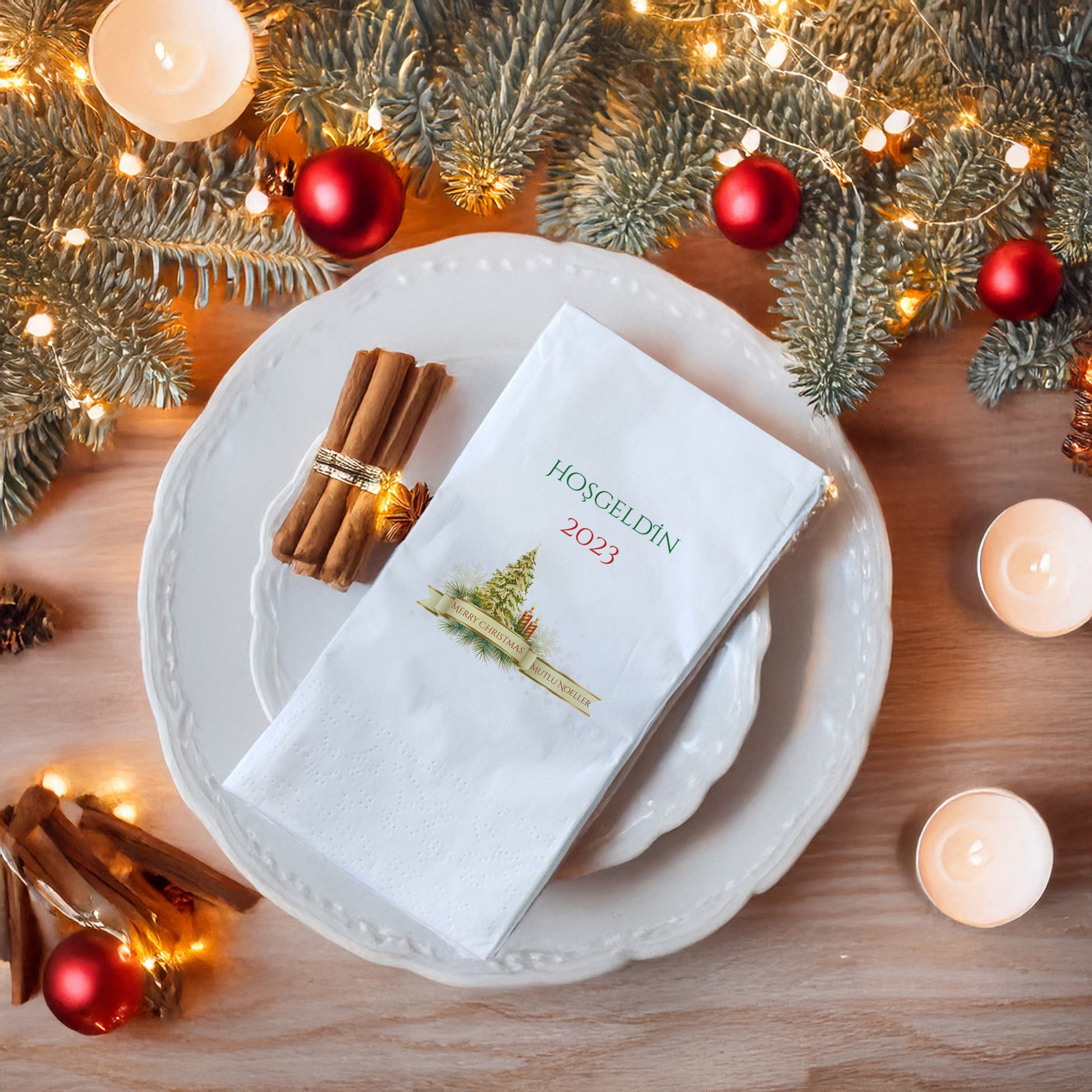 Yeni yılı zarif ve büyülü bir masa düzeniyle karşılamak isteyenler için tasarlanan Hoşgeldin 2023 Yılbaşı Desenli Baskılı Peçete, yılbaşı sofranıza sıcaklık ve şıklık katıyor.