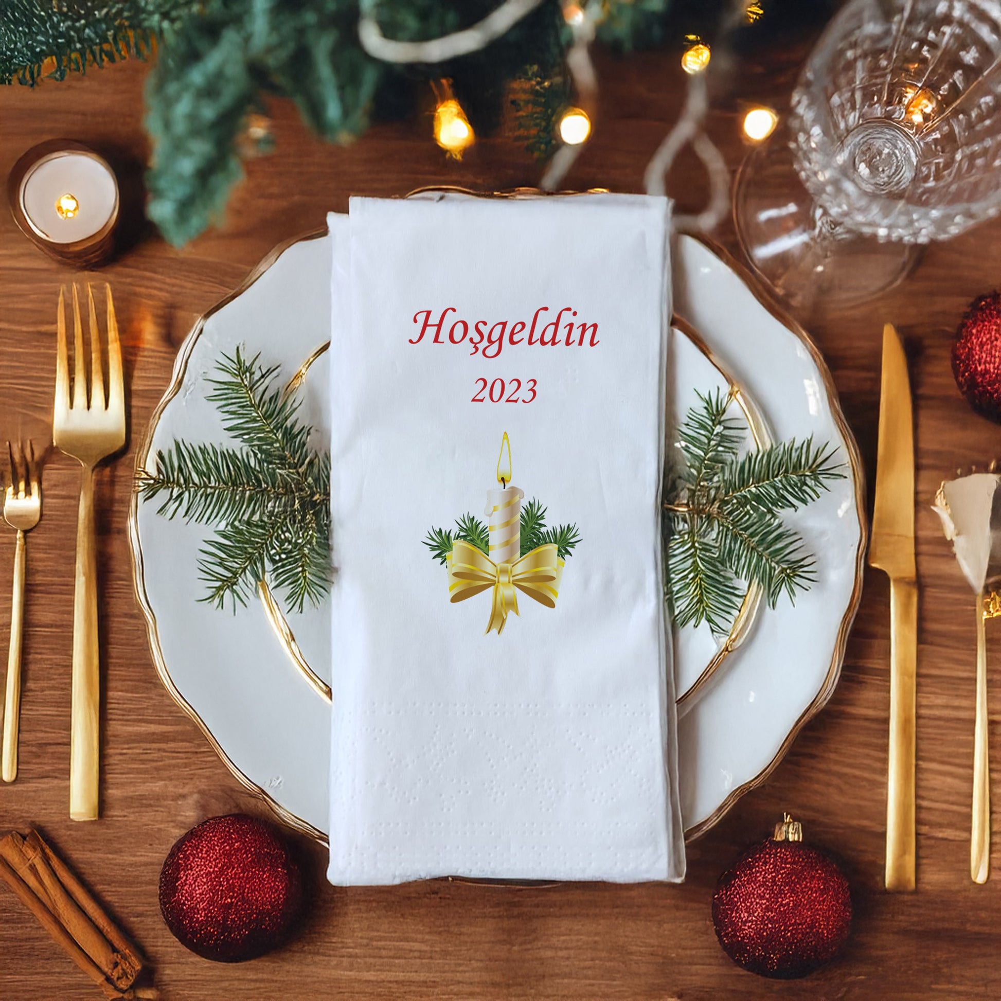 Yeni yıl sofralarınıza sıcaklık, şıklık ve özel bir atmosfer katmak için tasarlanan Hoşgeldin 2023 Yılbaşı Desenli Baskılı Peçete, zarif altın detaylı mum motifi ile yılbaşı ruhunu sofranıza taşıyor. Hem ev davetlerinde hem restoran & café konseptlerinde kusursuz bir yeni yıl dekoru oluşturur.