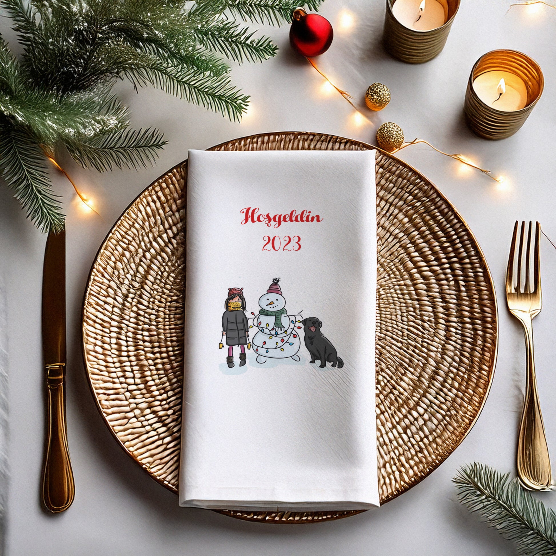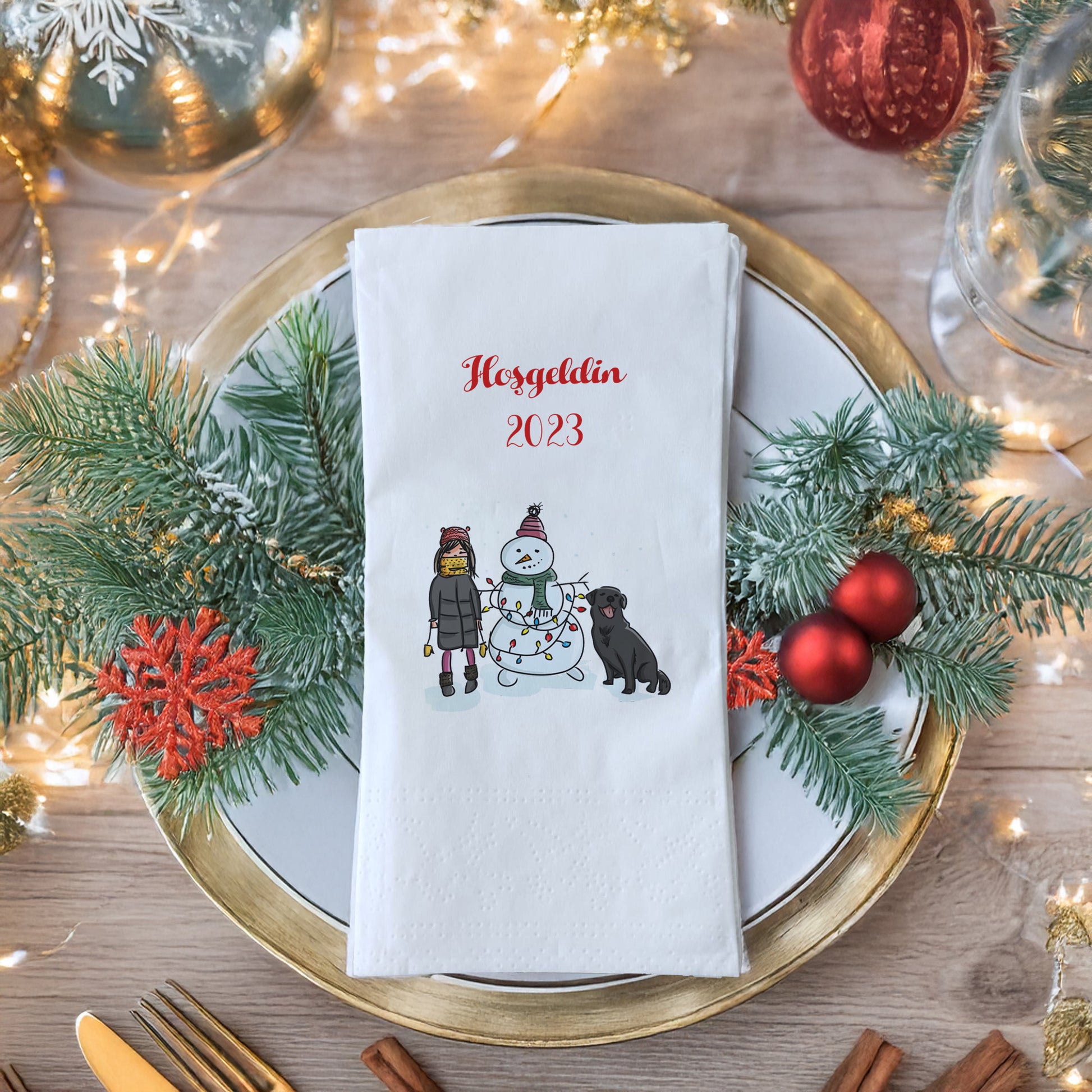 Yeni yıl sofralarınıza sıcaklık ve neşe katan Hoşgeldin 2025 Yılbaşı Baskılı Peçete, özel tasarımıyla yılbaşı akşamlarınıza zarafet katıyor. Kardan adam, çocuk ve sevimli köpek illüstrasyonlarıyla hazırlanmış bu şık peçete; hem yetişkin hem çocuk misafirlerin ilgisini çeker.