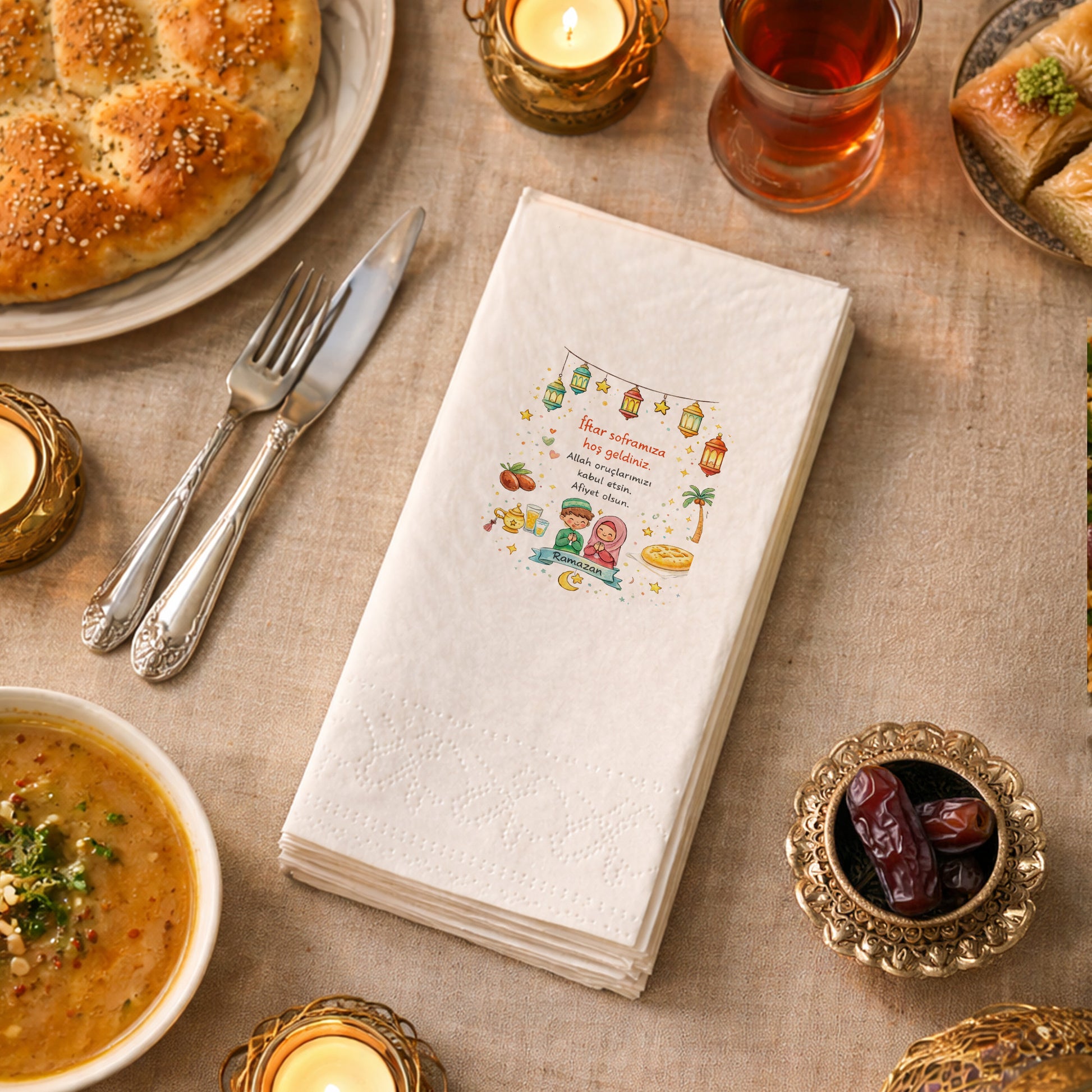 İftar soframıza hoş geldiniz” yazılı bu Ramazan Desenli Baskılı Peçete, iftar sofralarına samimi ve davetkâr bir atmosfer katar.