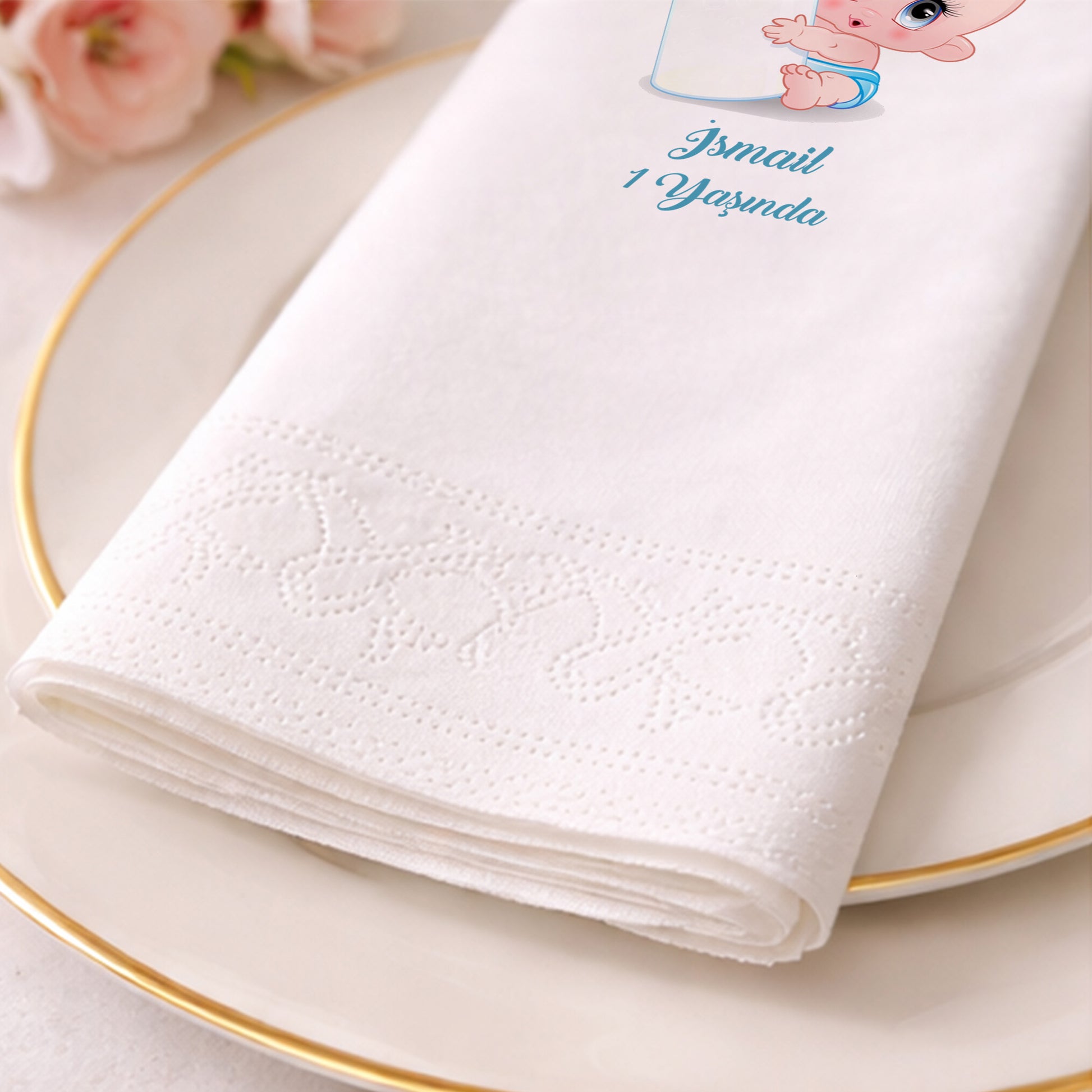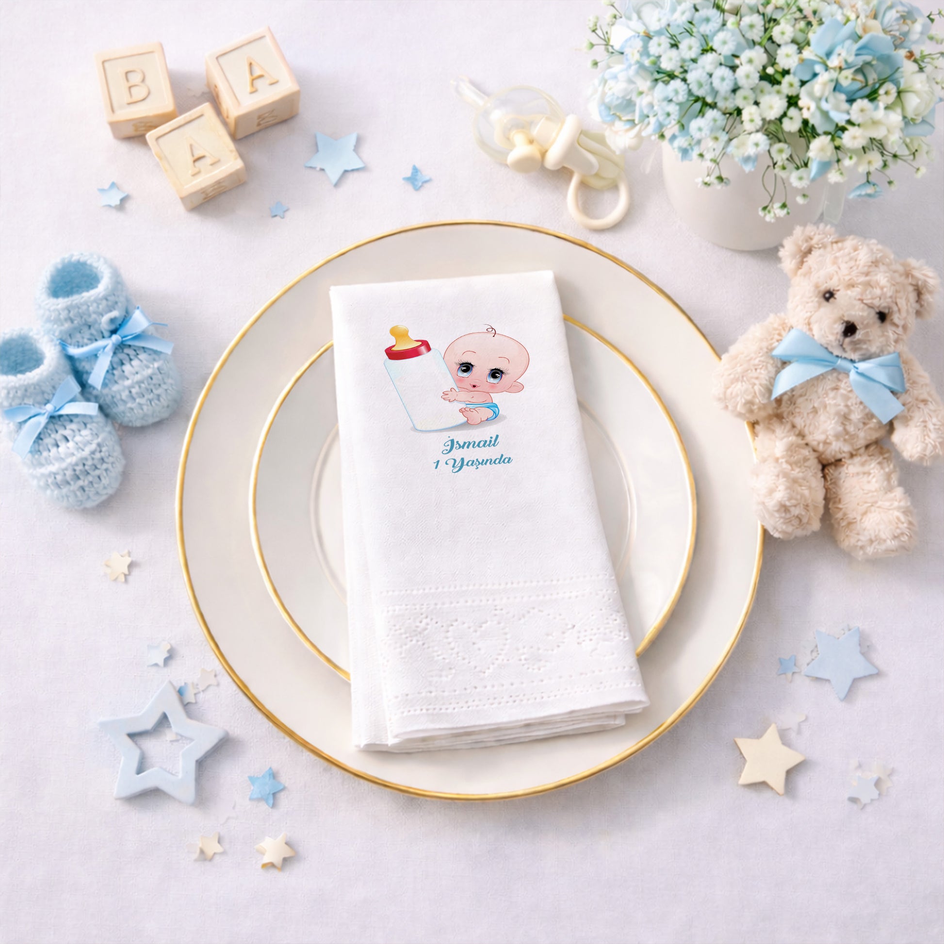 Mavi tonlarının huzuruyla hazırlanan bu peçete, İsmail bebeğin ilk yaş kutlaması için neşeli ve sevimli bir alternatif sunar. Dev biberonuyla masum bir şekilde bakan bebek figürü, sofranızın en tatlı eşlikçisi olacak. İsme özel hazırlanan bu tasarım, kişiselleştirilmiş bir parti deneyimi sunarak misafirlerinizin beğenisini kazanır. 1. yaş günü, diş buğdayı veya mevlüt gibi özel günlerde kullanıma uygun olan bu peçeteler, emici ve dayanıklı yapısıyla öne çıkar. Açık gri zemin üzerine yerleştirilen canlı mavi detaylar, masanızdaki diğer dekoratif öğelerle harika bir uyum sağlar. Kaliteli dijital baskı sayesinde görseller net ve göz alıcıdır. Bu özel ürünle kutlamanıza profesyonel bir dokunuş ekleyin.