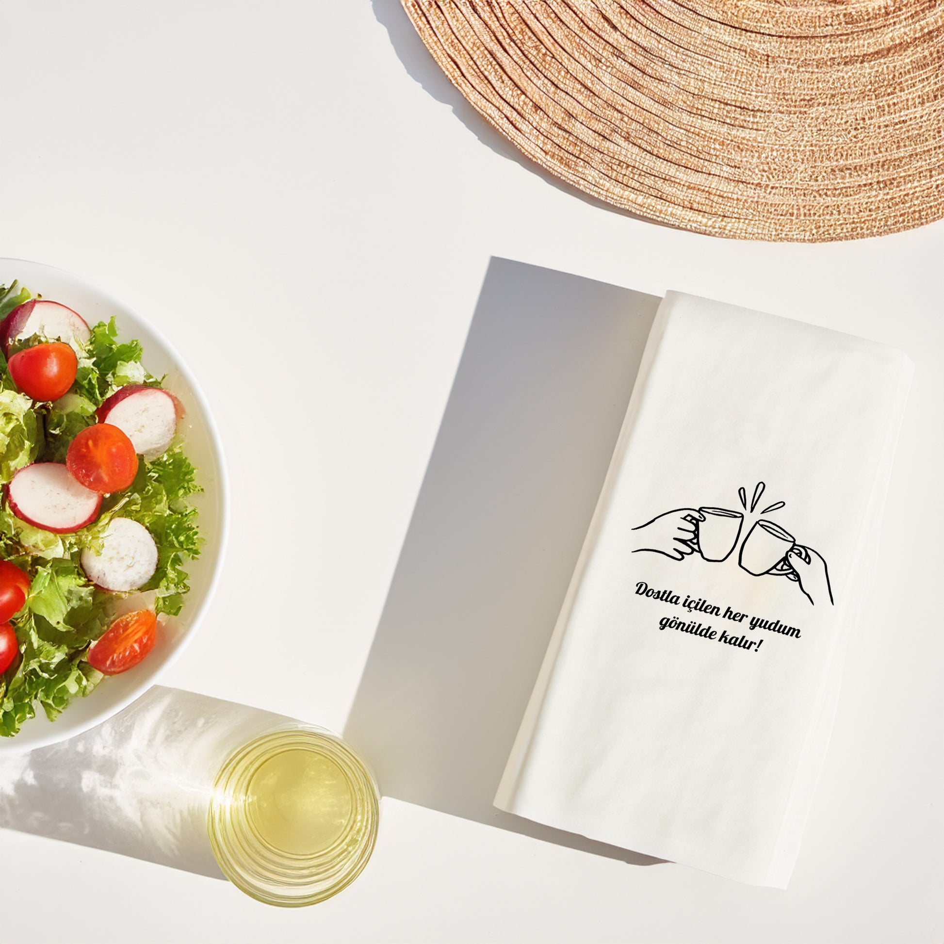 Tasarım, peçetenin ön yüzünde tam merkezde olacak şekilde yüksek çözünürlüklü baskı ile uygulanır. Dilersen özel konumlandırma taleplerini de iletebilirsin.