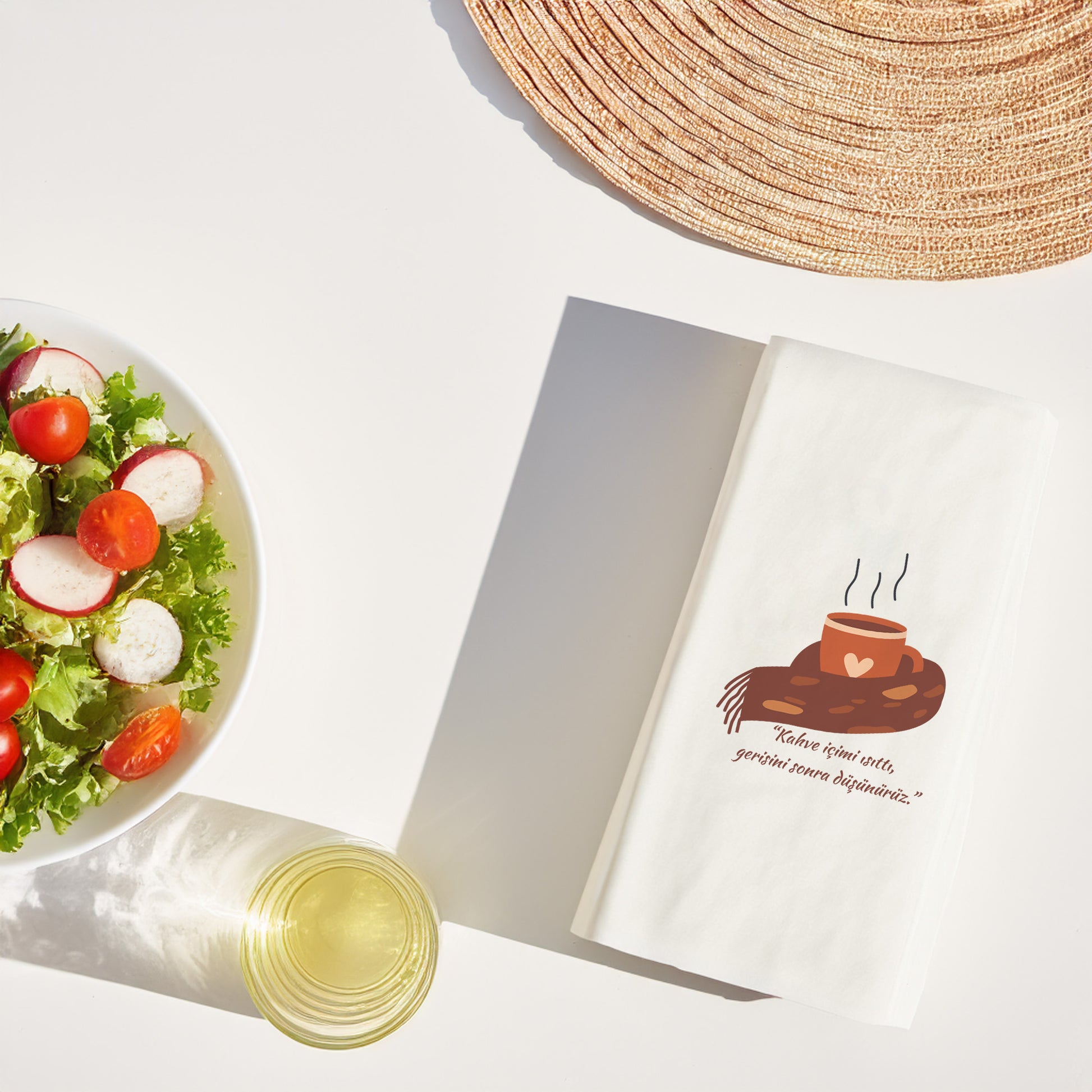 Bu sıcak ve samimi mesajla tasarlanan Kahve Desenli Baskılı Peçete, kahve keyfini anın tadını çıkarma felsefesiyle buluşturur. Kalpli fincan illüstrasyonu ve yumuşak renk geçişleriyle, huzur veren bir atmosfer yaratır. Özellikle soğuk günlerde, battaniye altında kahve keyfi hissini sofralara taşır.