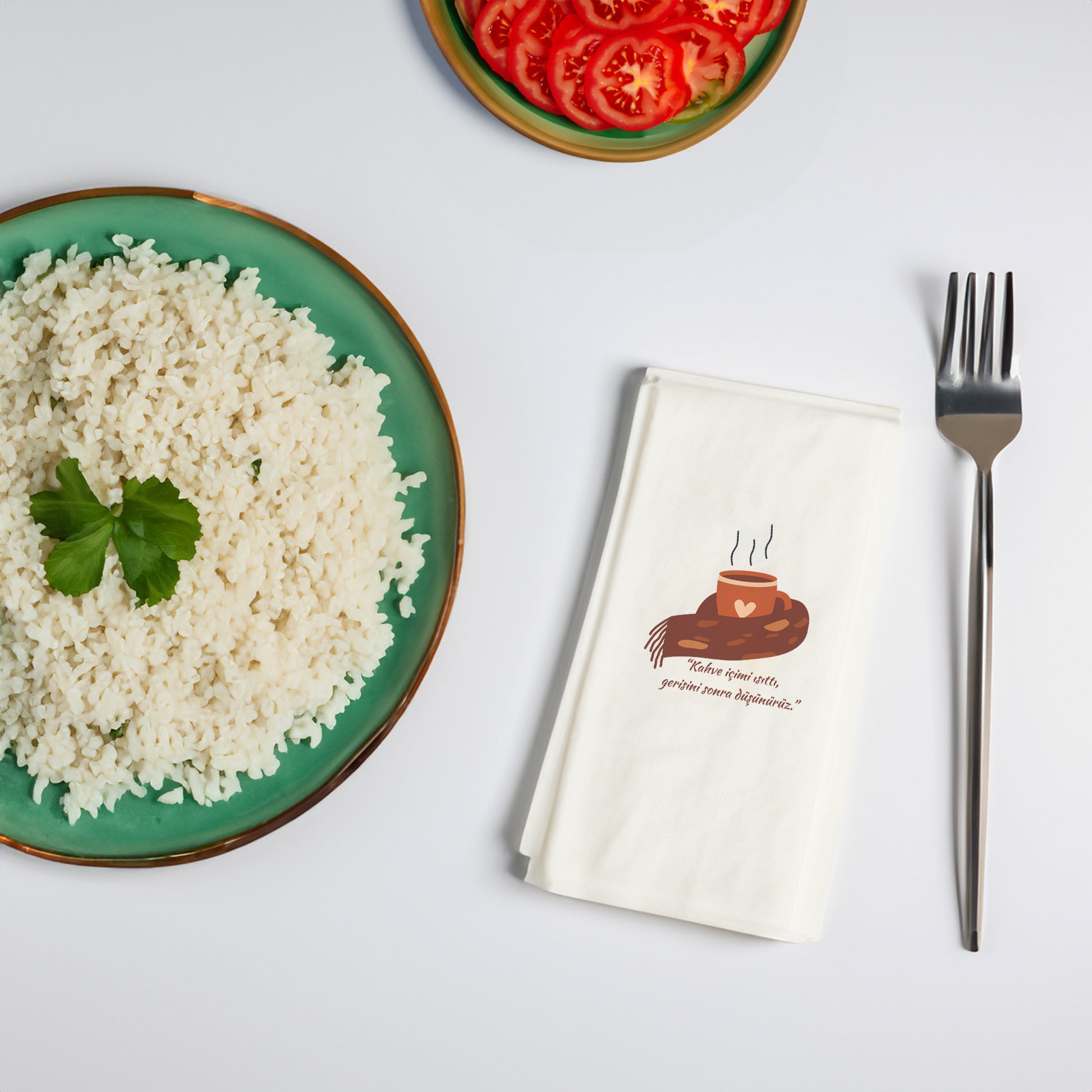 Tasarım, peçetenin ön yüzünde tam merkezde olacak şekilde yüksek çözünürlüklü baskı ile uygulanır. Dilersen özel konumlandırma taleplerini de iletebilirsin.