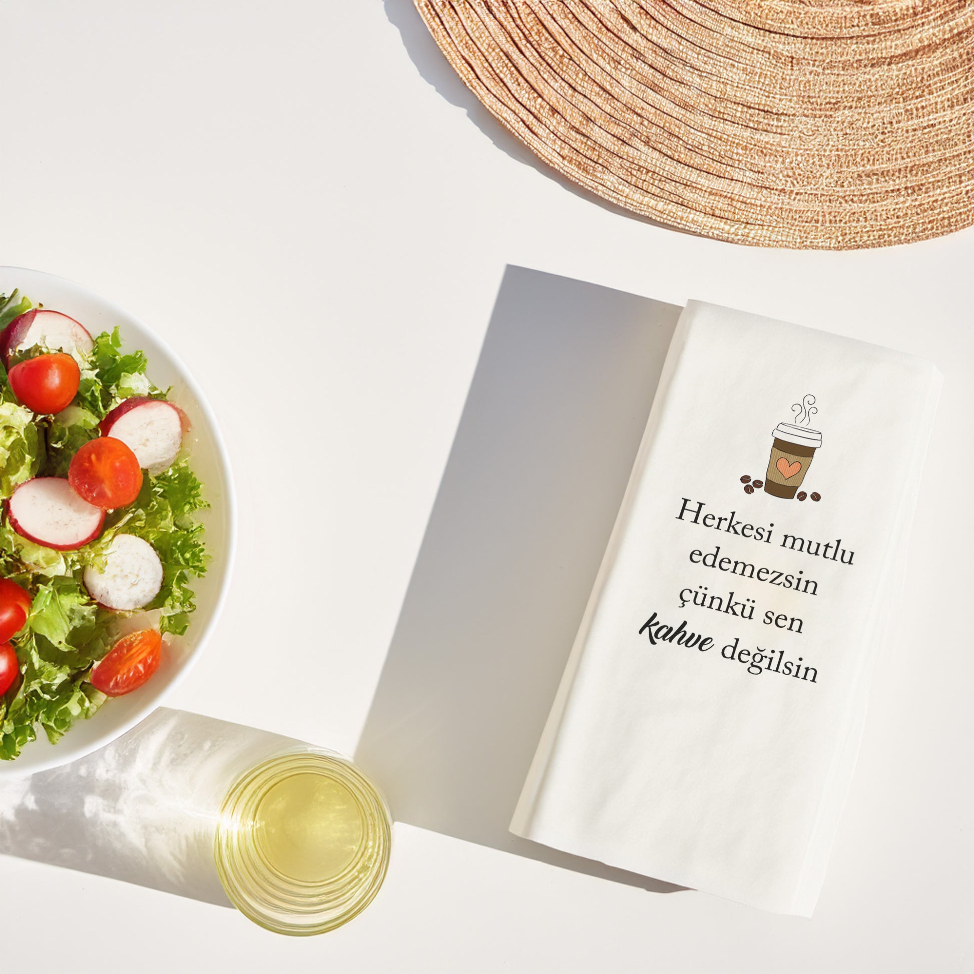Peçete üzerinde yer alan kahve bardağı illüstrasyonu ve “Herkesi mutlu edemezsin çünkü sen kahve değilsin” yazısı, hem mizahi hem dekoratif bir dokunuş sunuyor.