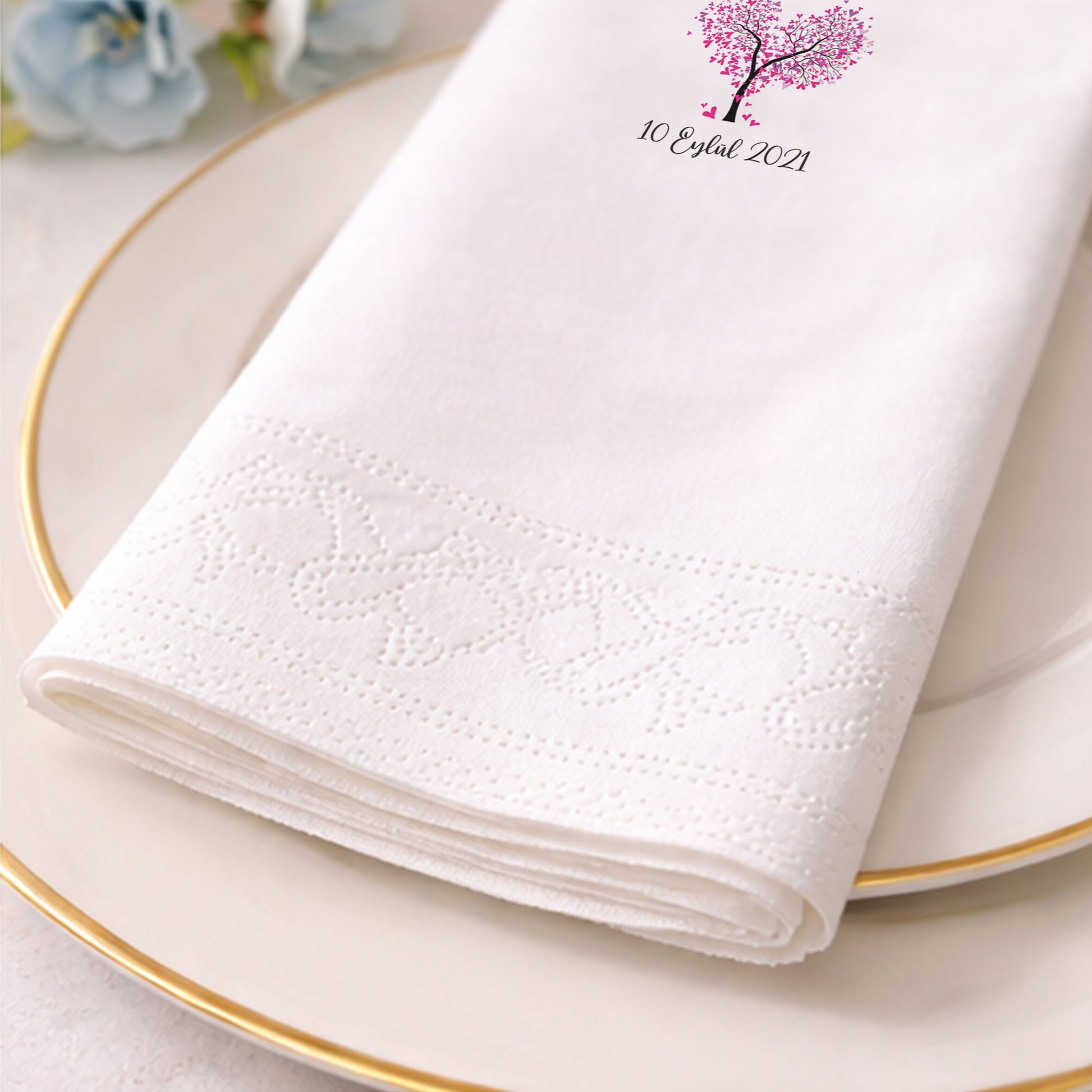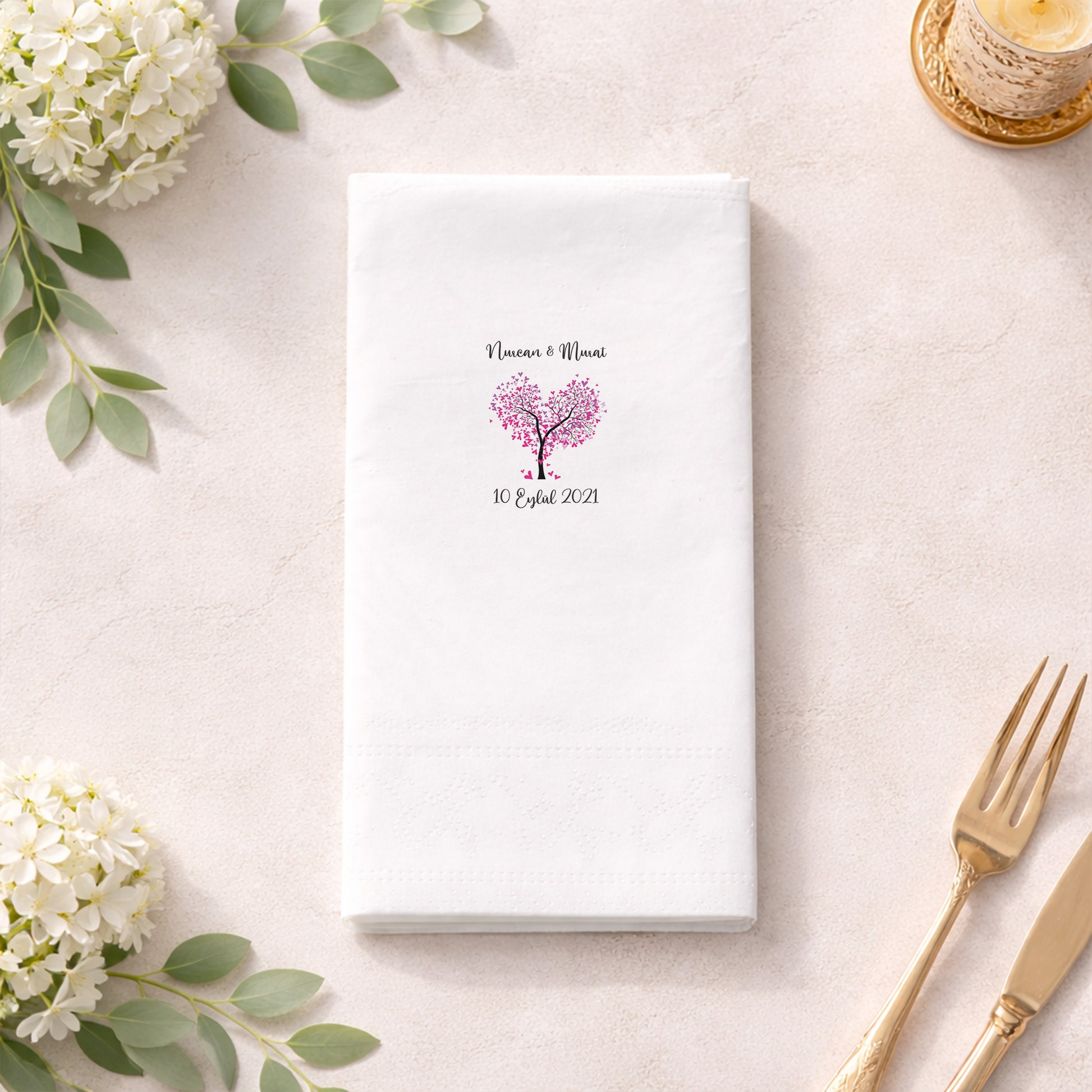 Kalp formunda ağaç figürüyle hazırlanan bu baskılı peçete, romantik düğün ve nişan organizasyonları için anlamlı bir tasarım sunar. İsim ve tarih bilgisiyle kişiselleştirilebilen özel gün peçetesi, davetlerde duygusal bir bağ oluşturur. Organizasyon peçetesi olarak masalara sıcak ve samimi bir hava katar. Düğün peçetesi ve nişan peçetesi kullanımına uygundur. Baskılı peçete kalitesi sayesinde figür detayları net ve estetik görünür. Aşk temasını ön plana çıkaran, özgün ve güven veren bir tasarım arayan çiftler için dikkat çekici bir seçenektir.