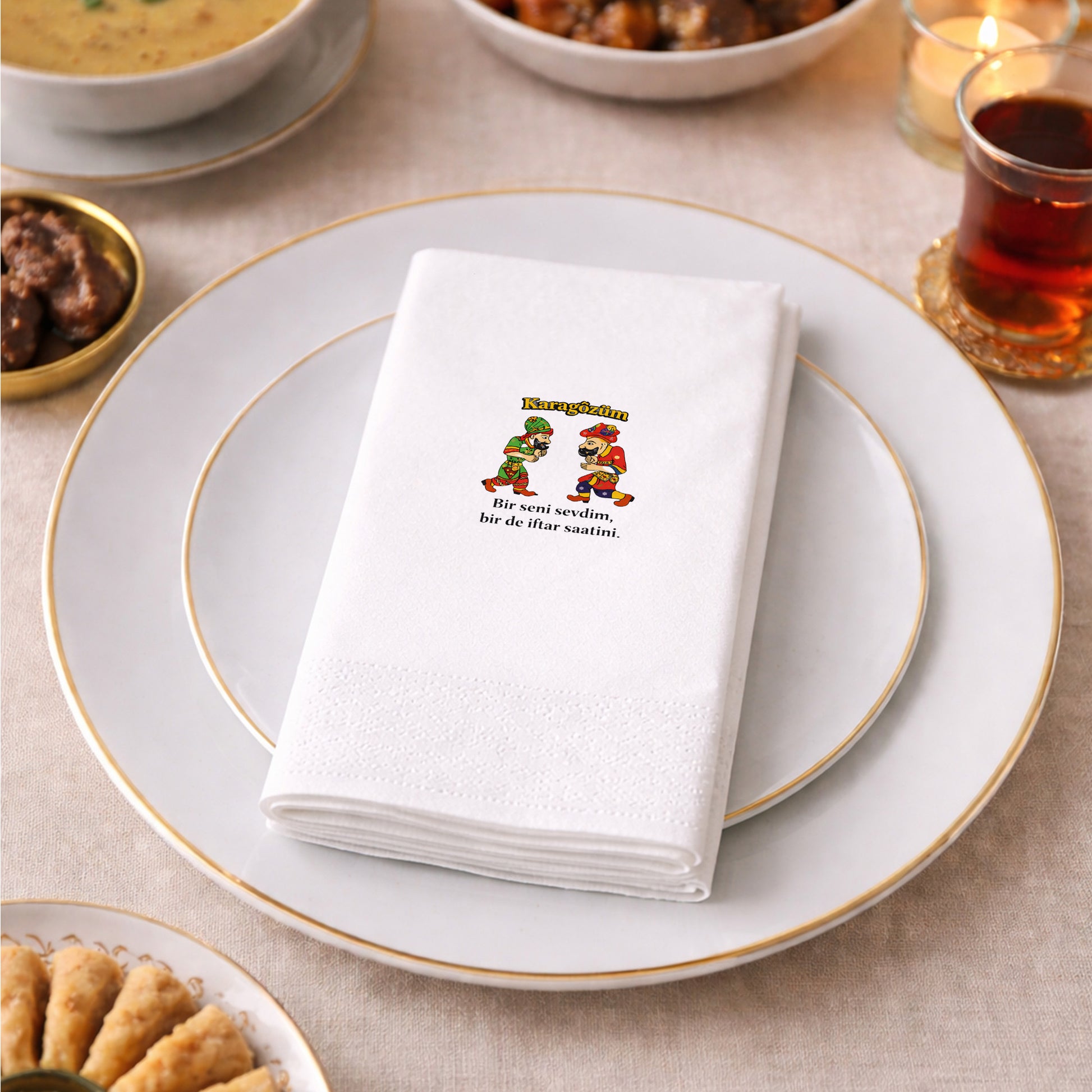 Karagöz & Hacivat Temalı Ramazan Baskılı Peçete, renkli Karagöz–Hacivat figürleri ve