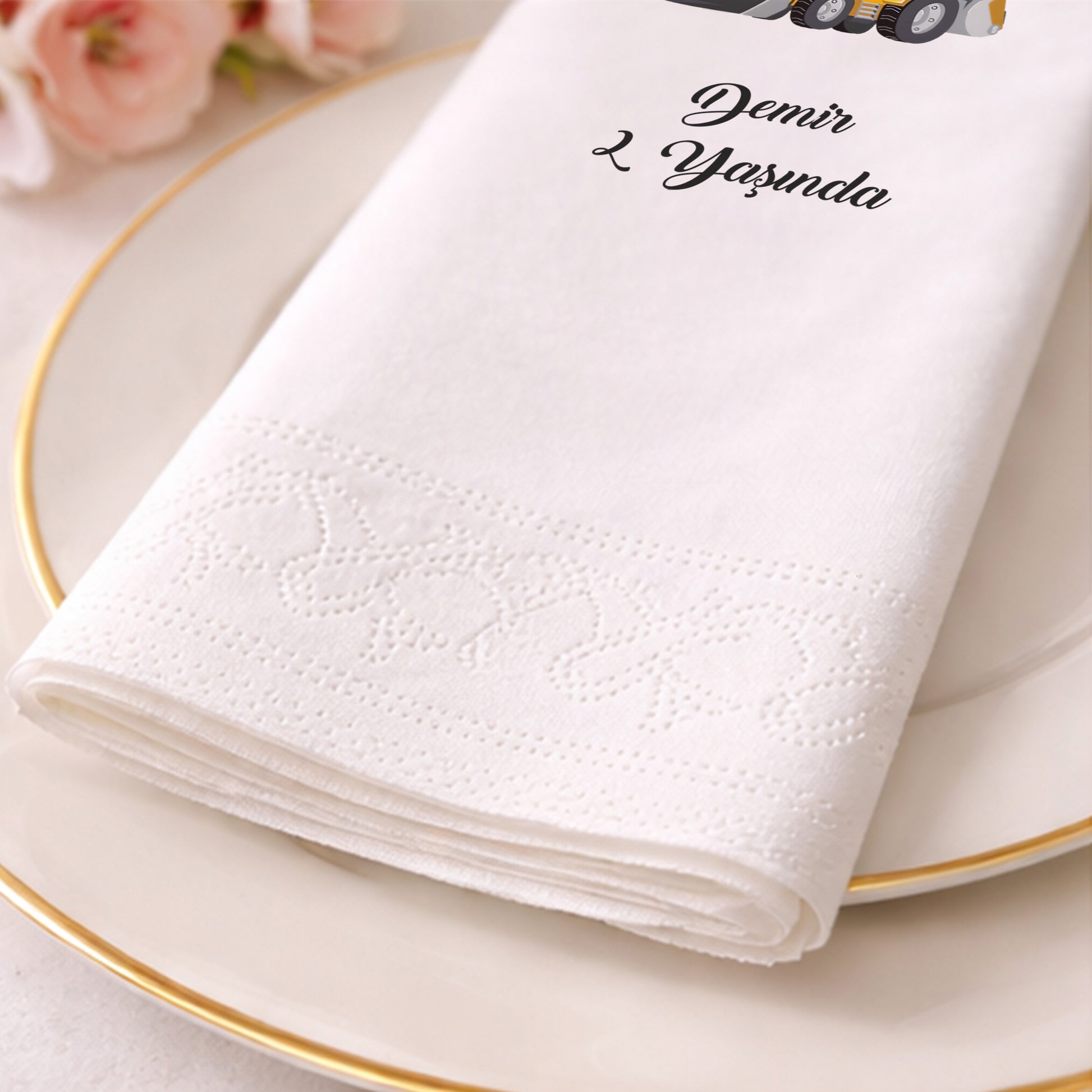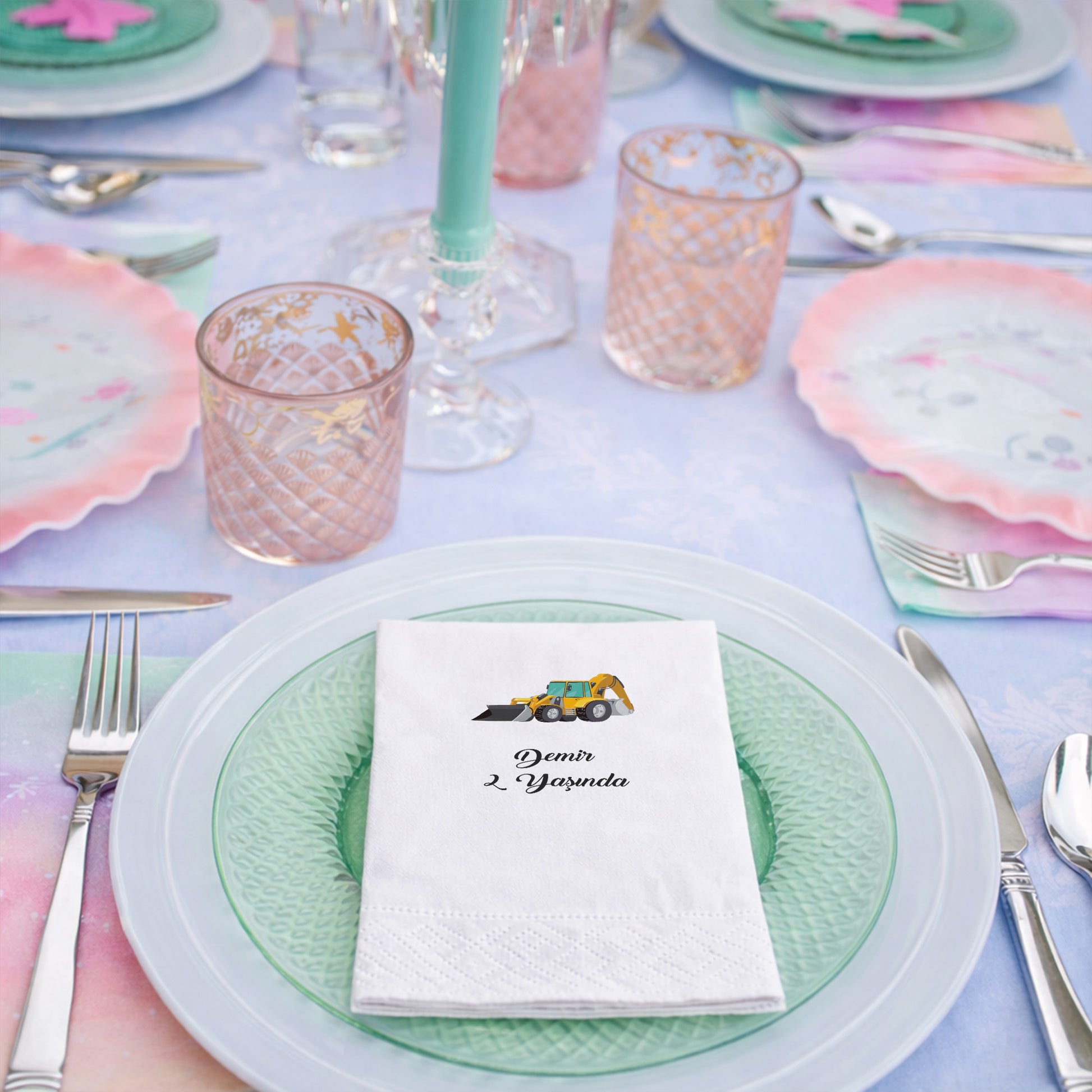 Kepçe illüstrasyonu ile tasarlanan bu peçete, özellikle küçük yaş erkek çocuk doğum günü organizasyonları için sevimli ve enerjik bir atmosfer oluşturur. İsim ve yaş bilgisi eklenebilen kişiye özel tasarımı sayesinde kutlamayı unutulmaz hale getirir. Yumuşak dokulu çift katlı yapısı, hem estetik hem de fonksiyonel kullanım sunar. Gıda ile temasa uygun baskı teknolojisi kullanılarak üretilmiştir. Doğum günü masasında pasta ve ikram sunumlarını konseptle uyumlu hale getirir. Evde yapılan küçük kutlamalardan büyük organizasyonlara kadar rahatlıkla tercih edilebilir. Temalı masa düzeni oluşturmak isteyen ebeveynler için pratik ve şık bir çözümdür.