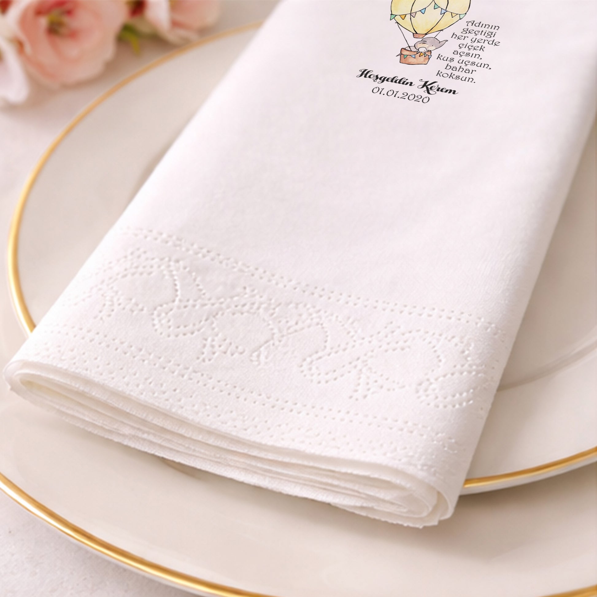 Tasarım, peçetenin ön yüzünde tam merkezde olacak şekilde yüksek çözünürlüklü baskı ile uygulanır. Dilersen özel konumlandırma taleplerini de iletebilirsin.