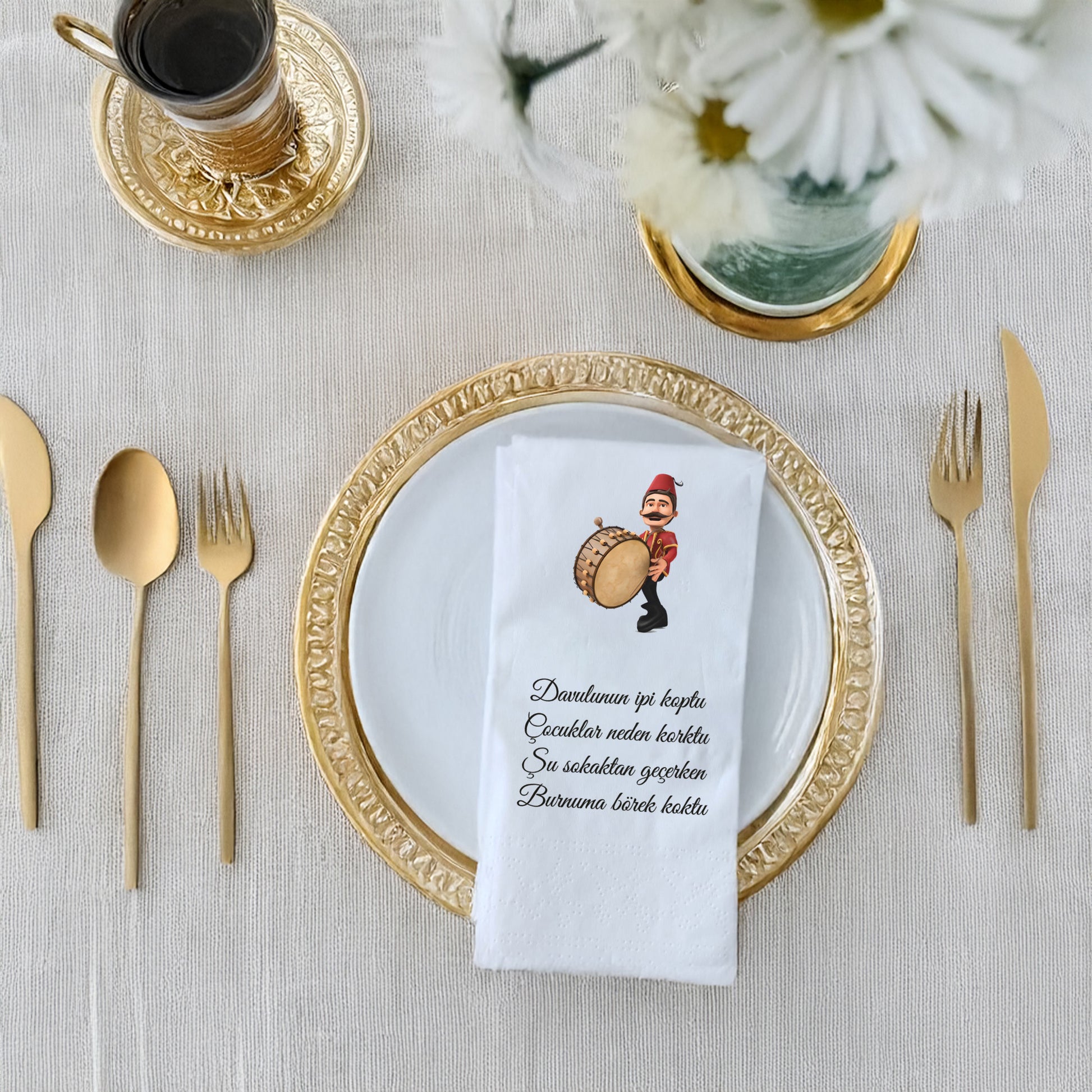 Kidzia’nın Ramazan koleksiyonundan Davulcu ve Mani Yazılı Baskılı Peçete, geleneksel Ramazan atmosferini sofranıza taşımak için özel olarak tasarlandı.