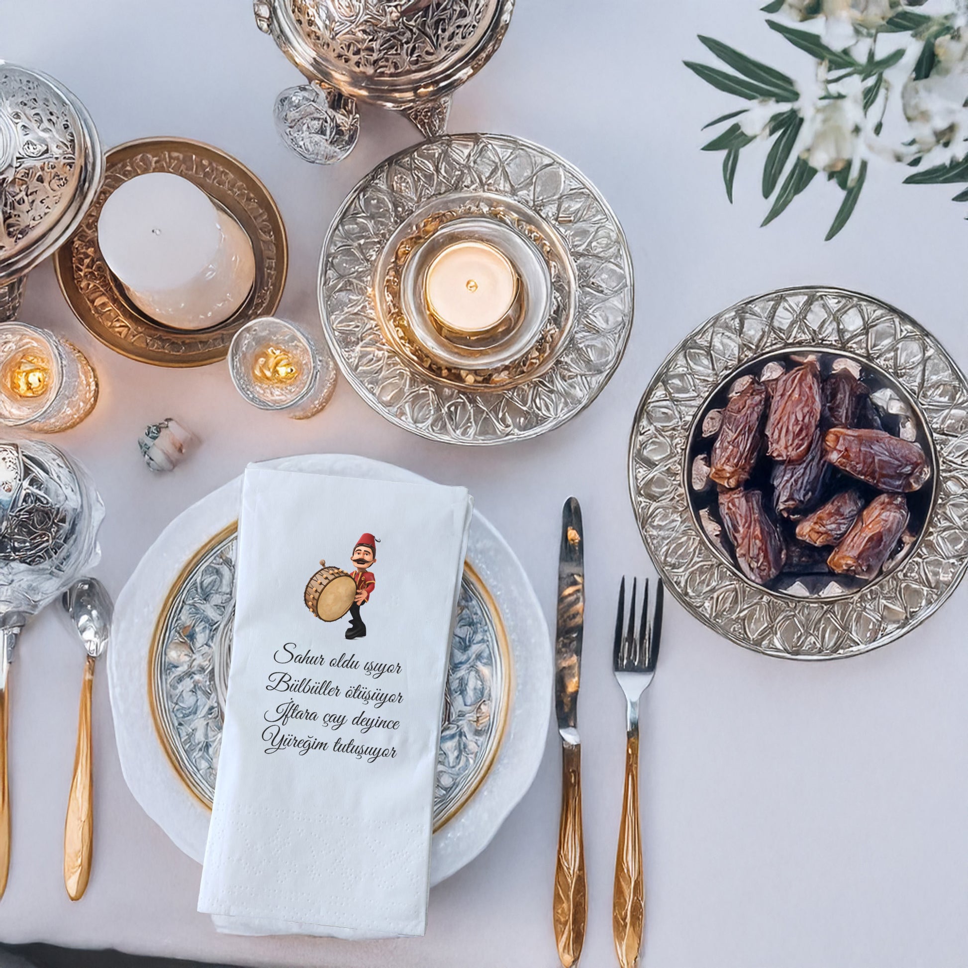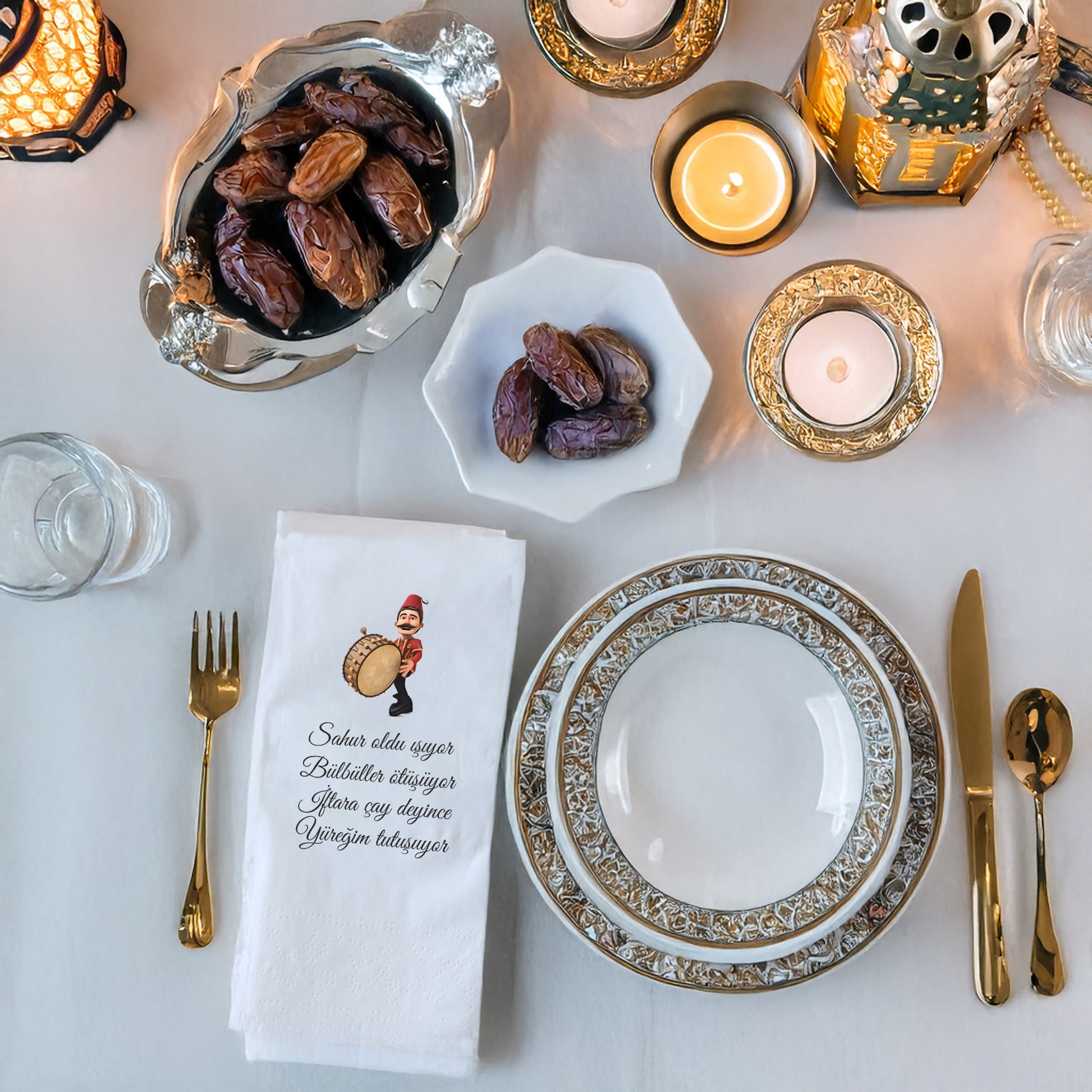 Kidzia’nın Ramazan koleksiyonundan Davulcu Çizimli Mani Baskılı Peçete, Ramazan ayının en keyifli ve nostaljik geleneklerinden biri olan davulcu kültürünü sofralara taşıyor.