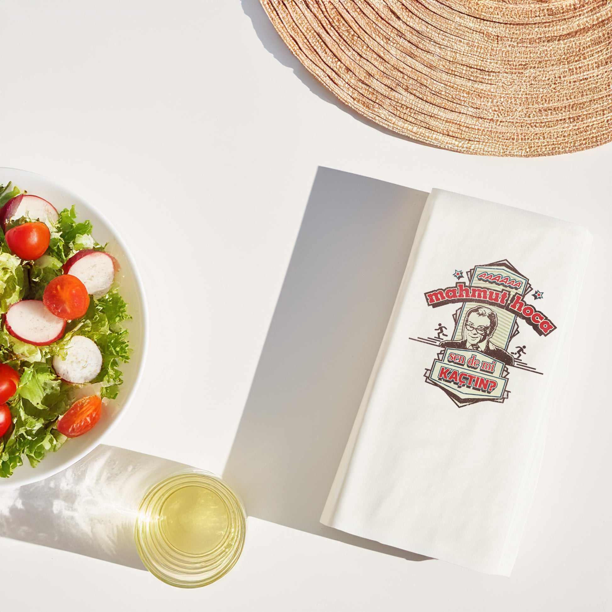 Tasarım, peçetenin ön yüzünde tam merkezde olacak şekilde yüksek çözünürlüklü baskı ile uygulanır. Dilersen özel konumlandırma taleplerini de iletebilirsin.