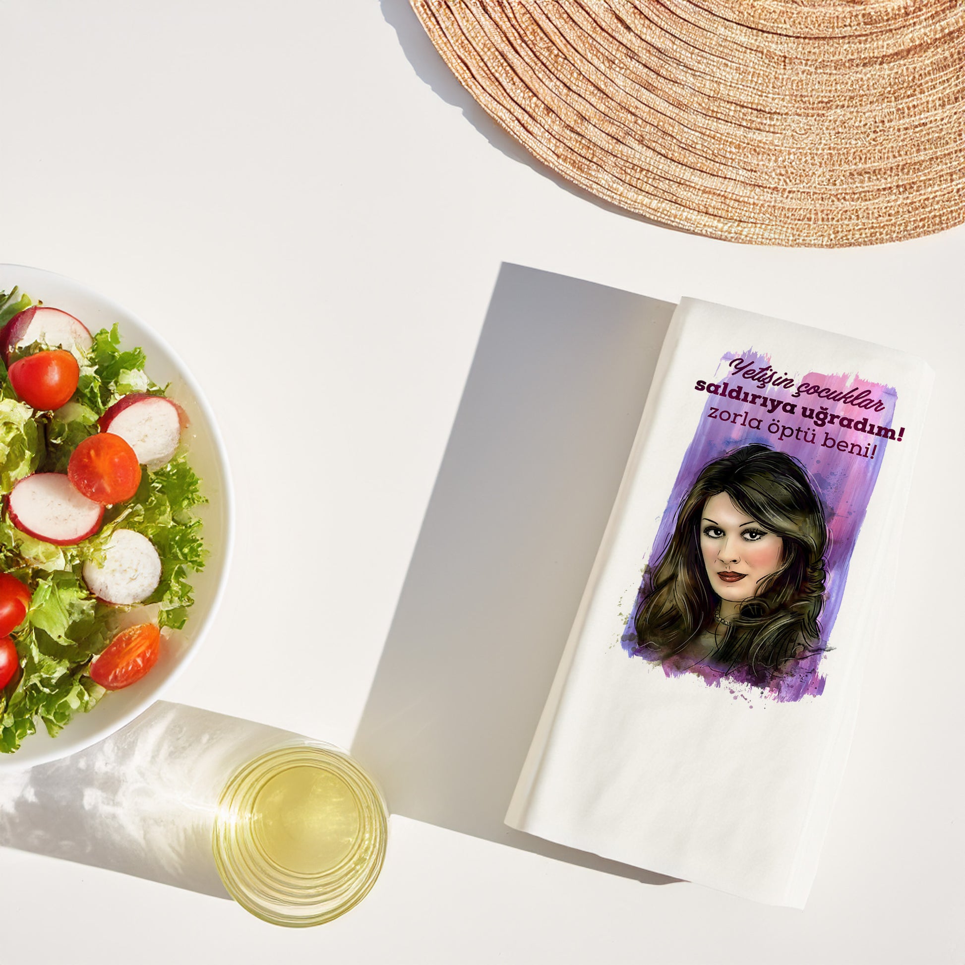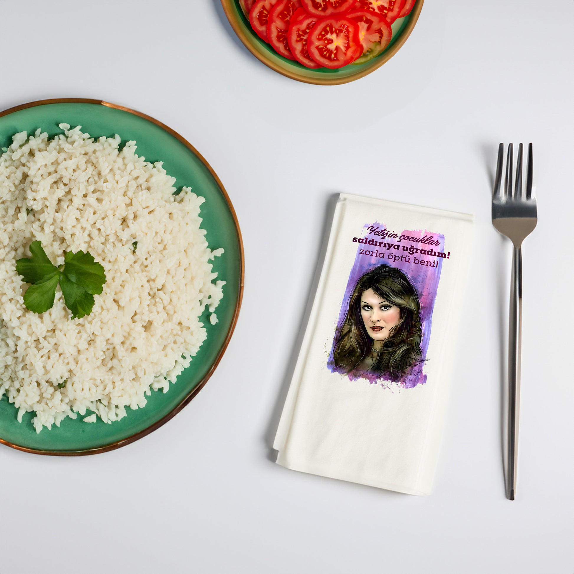 Bu modelde, ikonik replik “Yetişin çocuklar, saldırıya uğradım! Zorla öptü beni!” eğlenceli illüstrasyonla bir araya gelerek sofralara hem mizah hem de retro bir dokunuş katıyor.