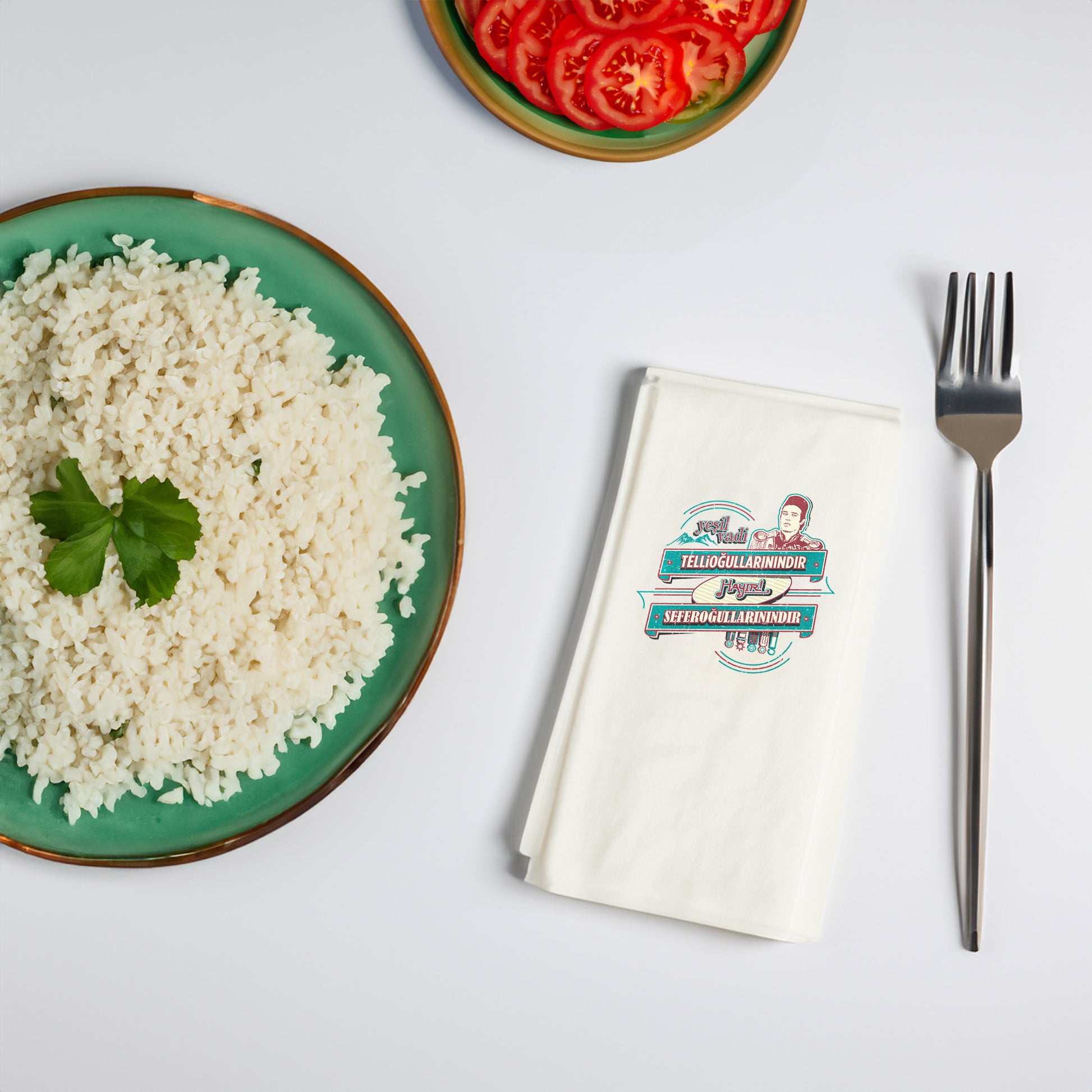 Tasarım, peçetenin ön yüzünde tam merkezde olacak şekilde yüksek çözünürlüklü baskı ile uygulanır. Dilersen özel konumlandırma taleplerini de iletebilirsin.
