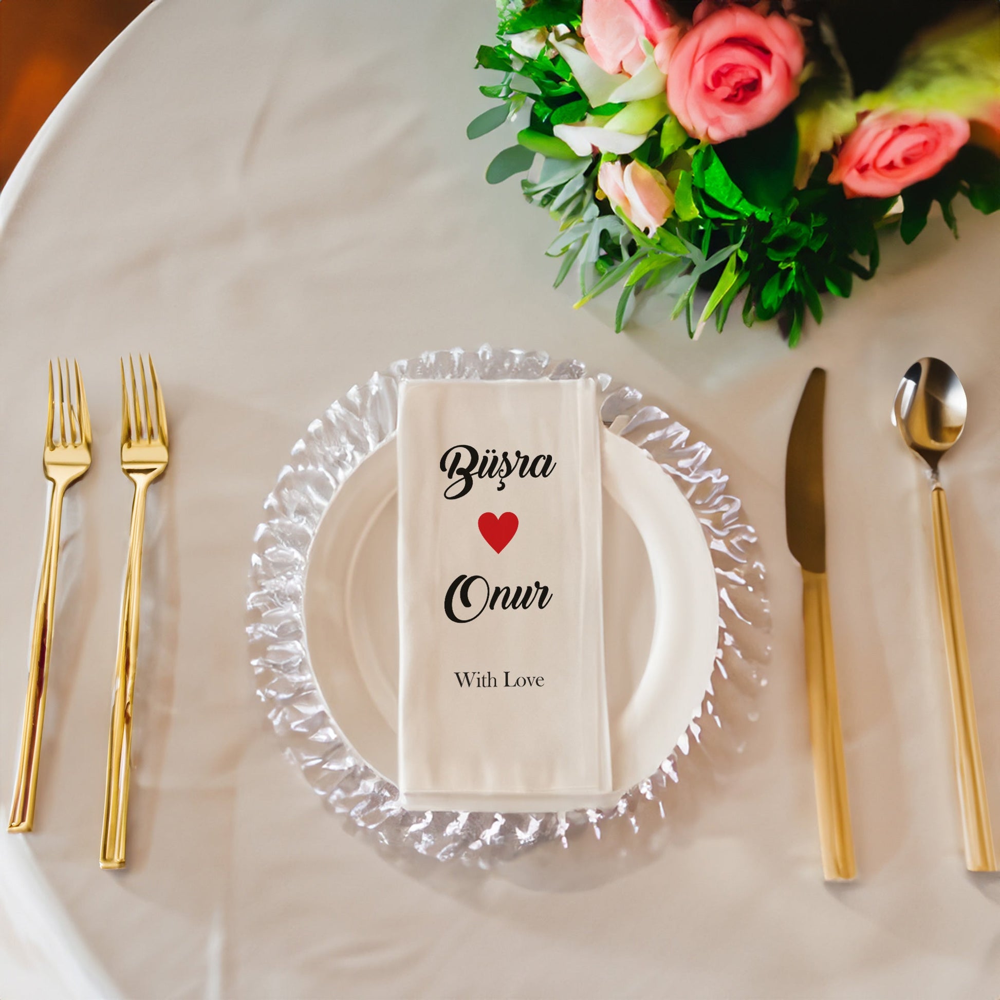 Özel günlerinizi unutulmaz kılacak zarif bir dokunuş: Kırmızı Kapli İsim Detaylı Düğün, Nişan, Söz ve Kına Peçetesi Seti!