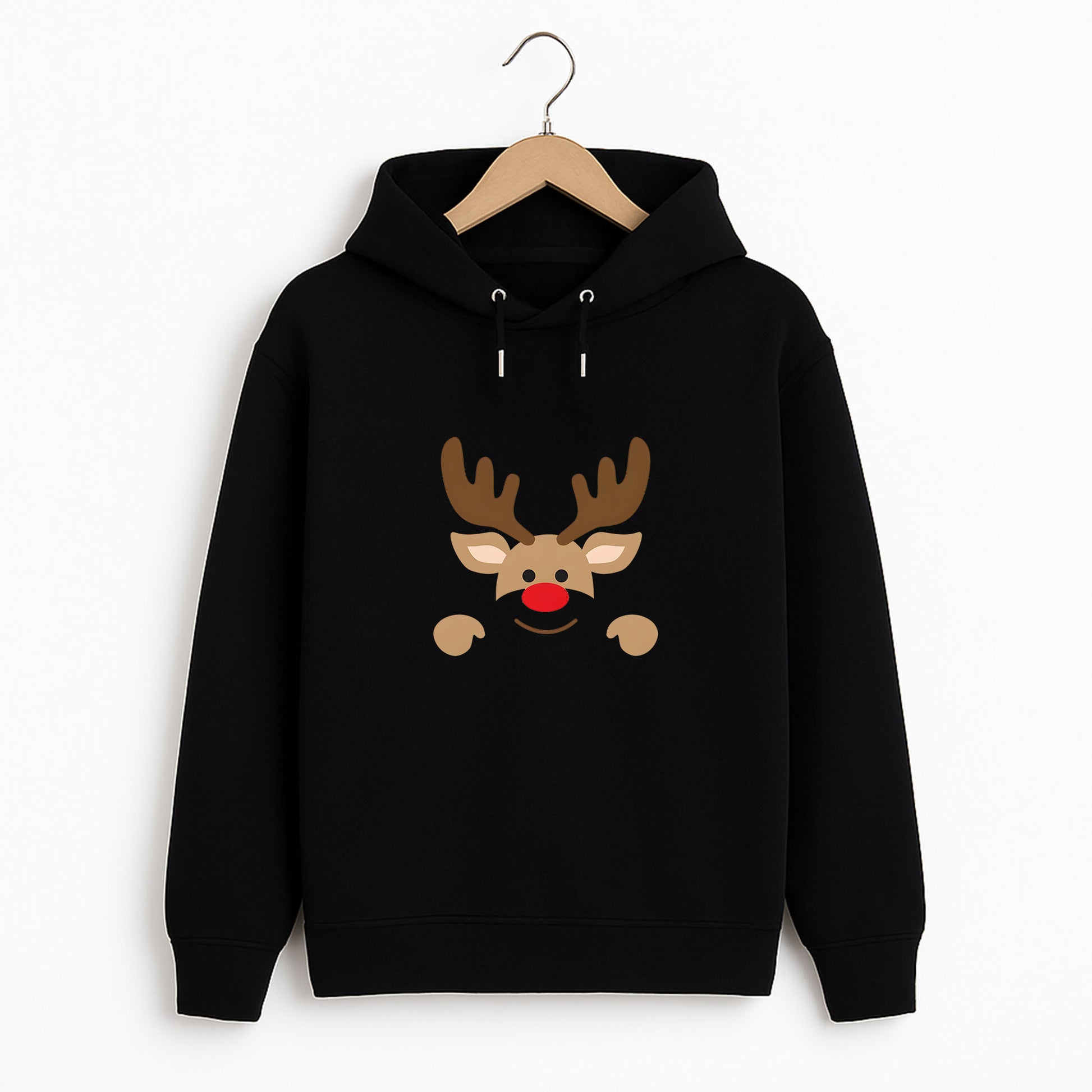 Yılbaşı denince akla gelen en sevilen figürlerden biri olan kırmızı burunlu geyik, bu sade ve sevimli tasarımla çocuk sweatshirtlerine taşındı. Minimal çizim tarzıyla hazırlanan geyik yüzü; yumuşak renk geçişleri, büyük boynuz detayları ve ikonik kırmızı burnu ile hem eğlenceli hem de modern bir görünüm sunar.