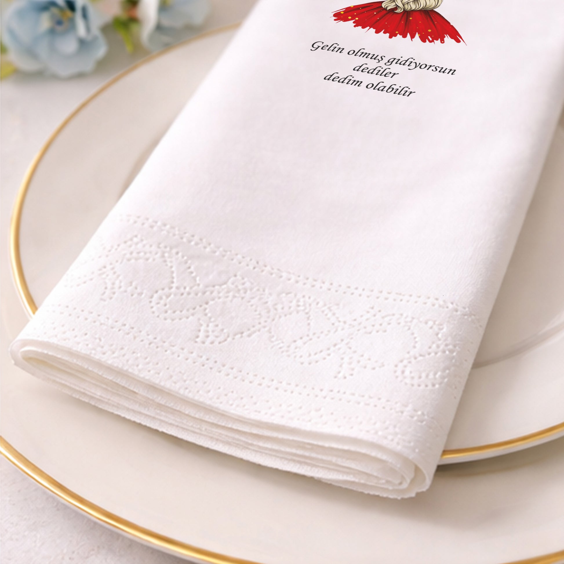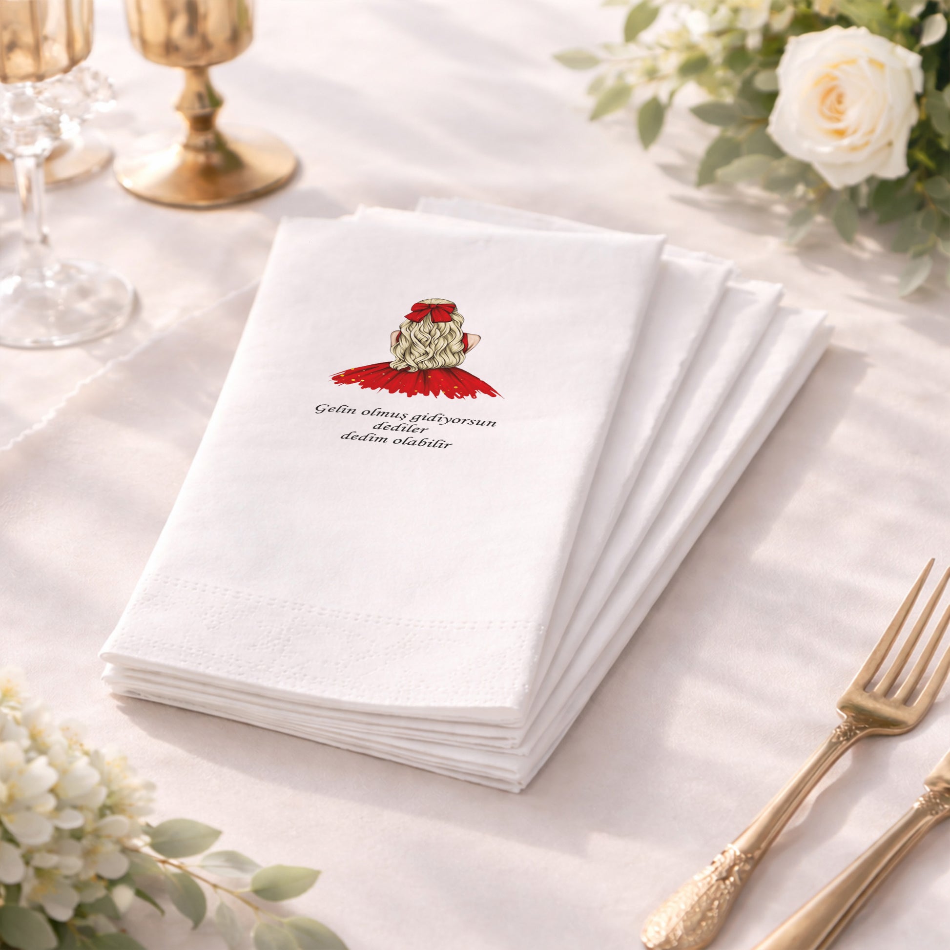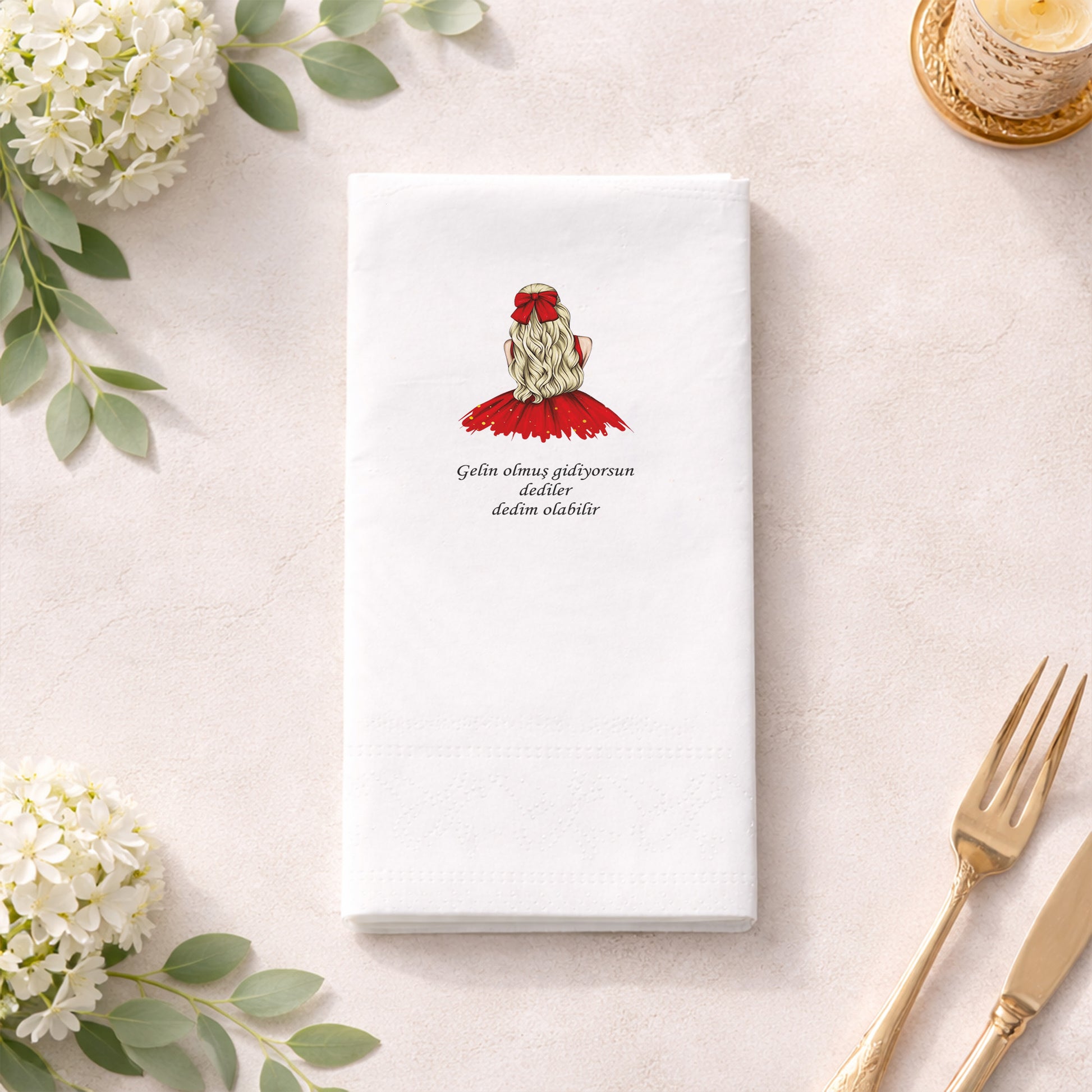 Modern bir illüstrasyonla hazırlanan, arkası dönük kırmızı elbiseli gelin figürüyle süslenmiş bu peçete, kına gecenize eğlenceli ve şık bir hava katar. "Gelin olmuş gidiyorsun dediler, dedim olabilir" esprili yazısıyla modern kına konseptlerine uyum sağlar. Yumuşak pastel gri zemin üzerine canlı kırmızı tonlarıyla işlenen bu tasarım, genç ve dinamik çiftlerin tercihi oluyor. Yüksek kaliteli kağıt yapısı ve net baskı kalitesiyle organizasyon peçetesi kategorisinde fark yaratan bu ürün, davetlileriniz için gülümseten bir hatıra bırakır. Kına gecesi eğlencesini masalara taşıyan bu özel baskılı peçete, hem görselliğiyle hem de esprili diliyle dikkat çeker. Dayanıklı dokusu ve şık tasarımıyla kına sofralarınızın enerjisini yükseltir. Özel günlerinizde fark yaratmak ve stilinizi yansıtmak için ideal bir seçimdir.
