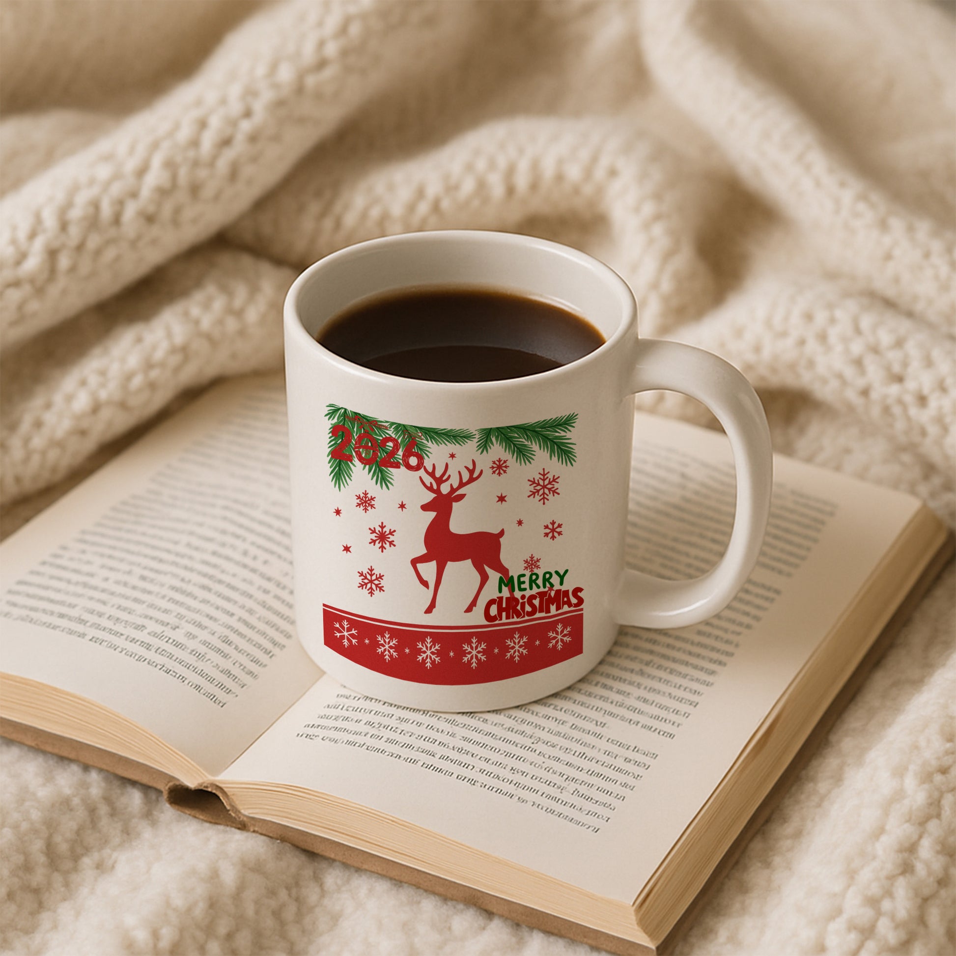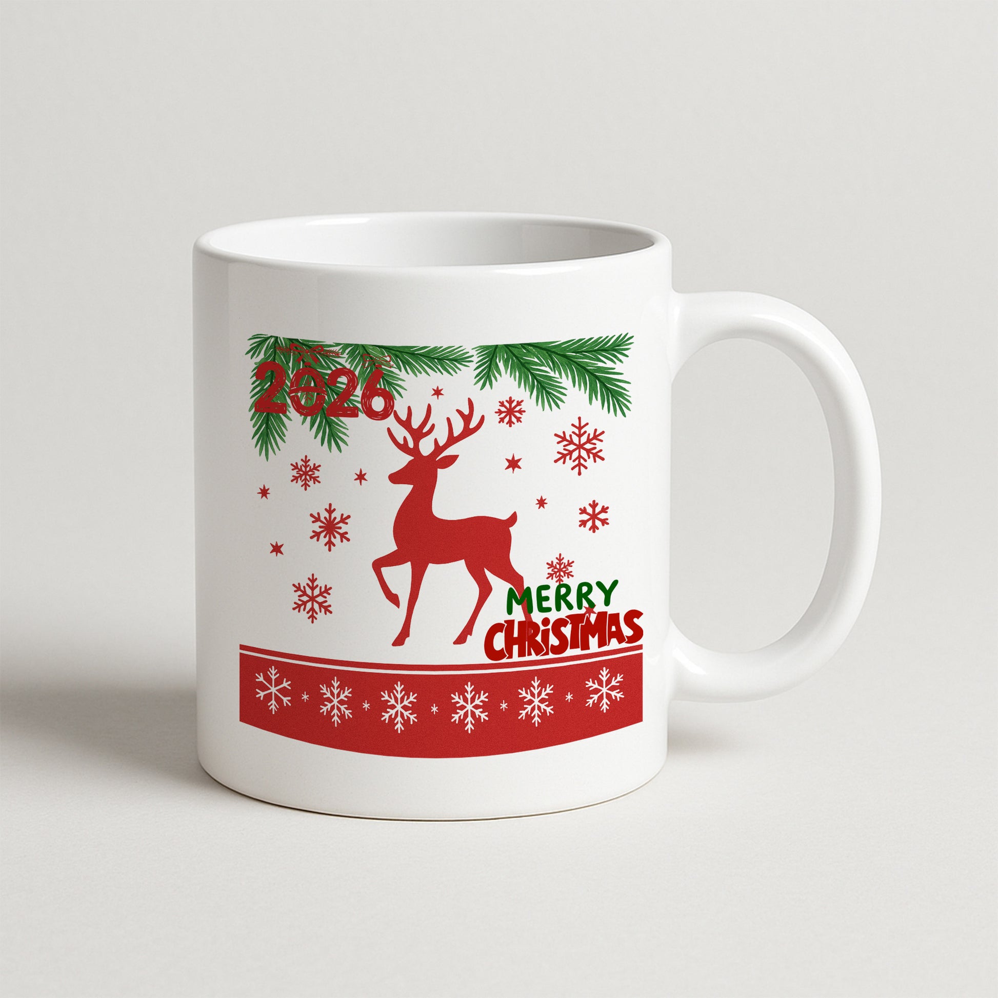 Kırmızı geyik silüeti ve “Merry Christmas” yazısıyla tasarlanmış 2026 temalı yılbaşı baskılı kupa.