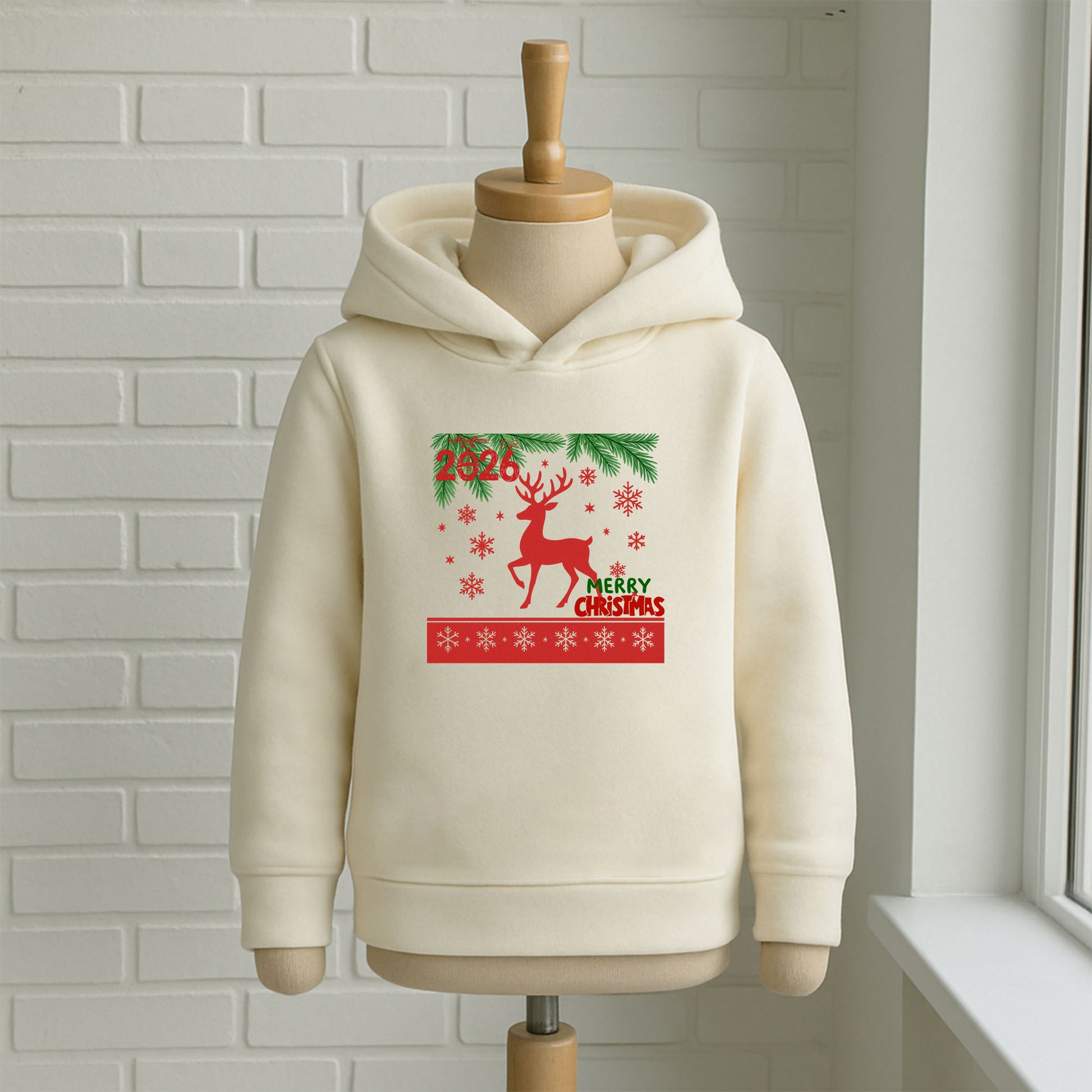 Kırmızı geyik figürü ve Merry Christmas yazısıyla hazırlanan bu 2026 yılbaşı sweatshirt’ü, çocuklar için neşeli ve sıcak bir kış stilini tamamlar.