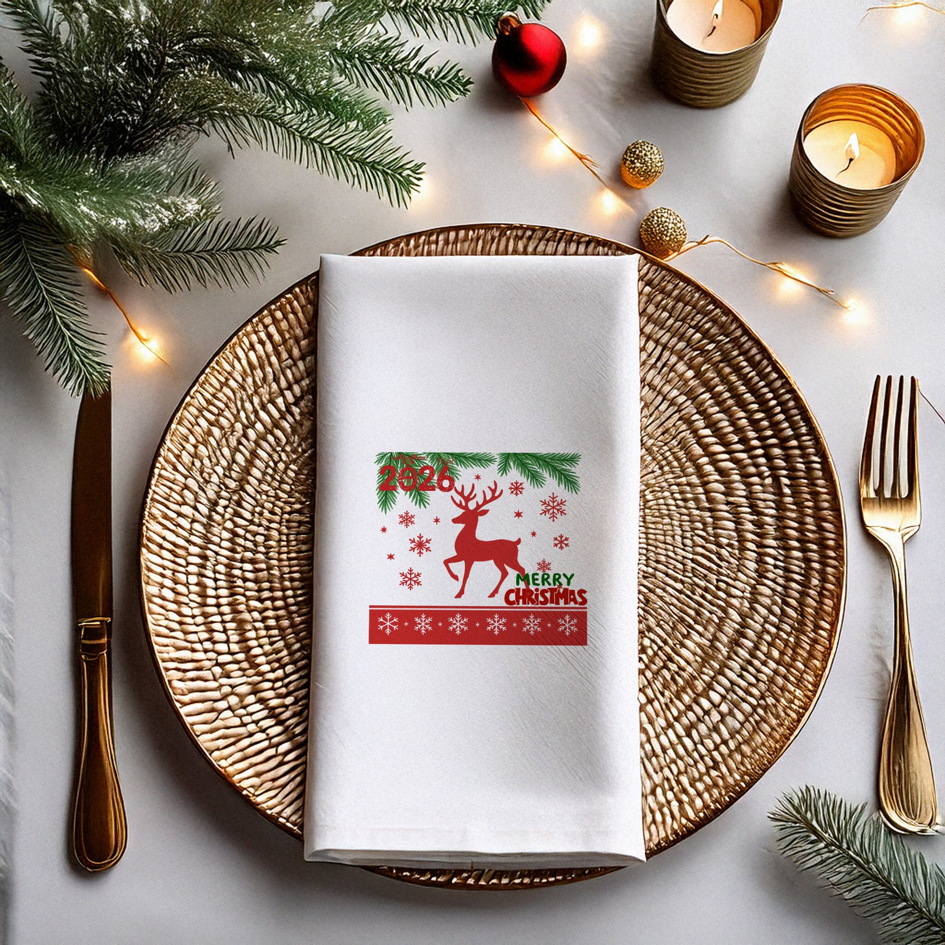 Bu “Red Deer Merry Christmas 2026” peçetesi; minimal kırmızı geyik silüeti, kar taneleri desenleri, çam dalları ve modern tipografisiyle yılbaşı sofralarına hem sıcak hem de şık bir hava katar.
