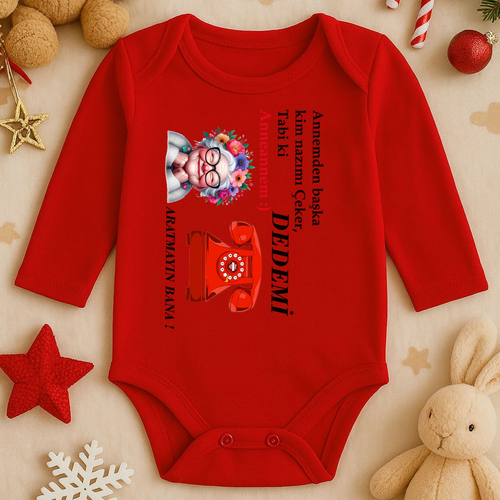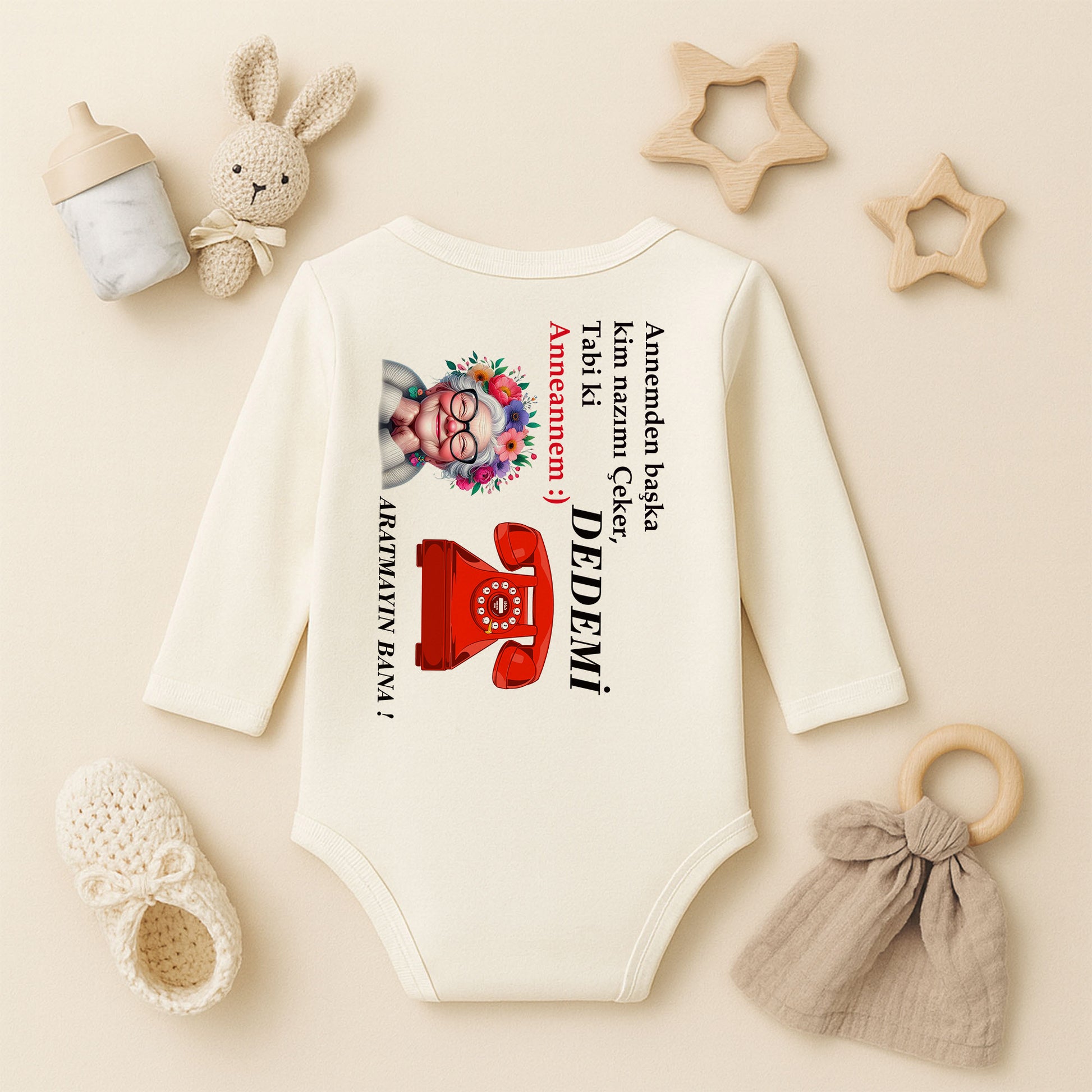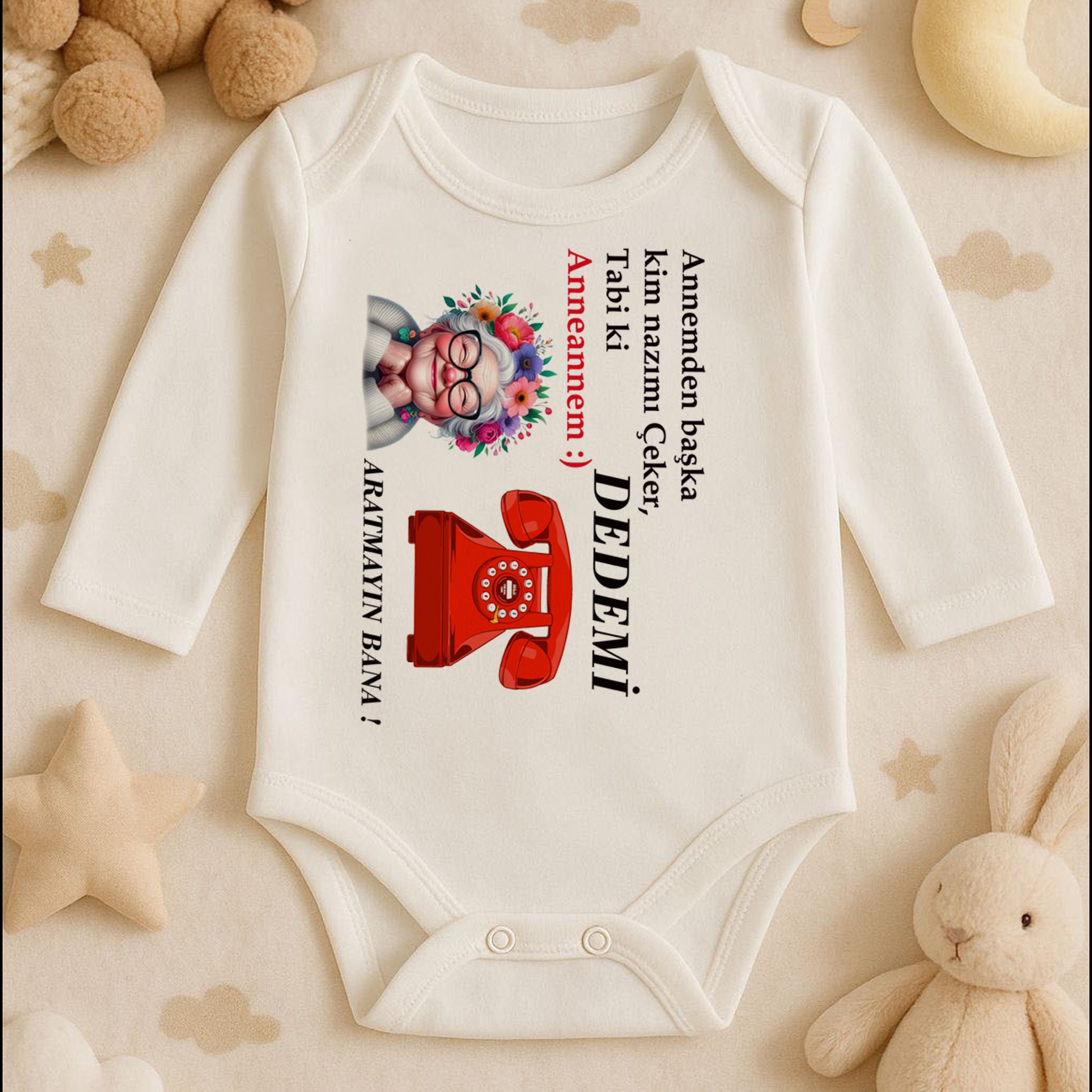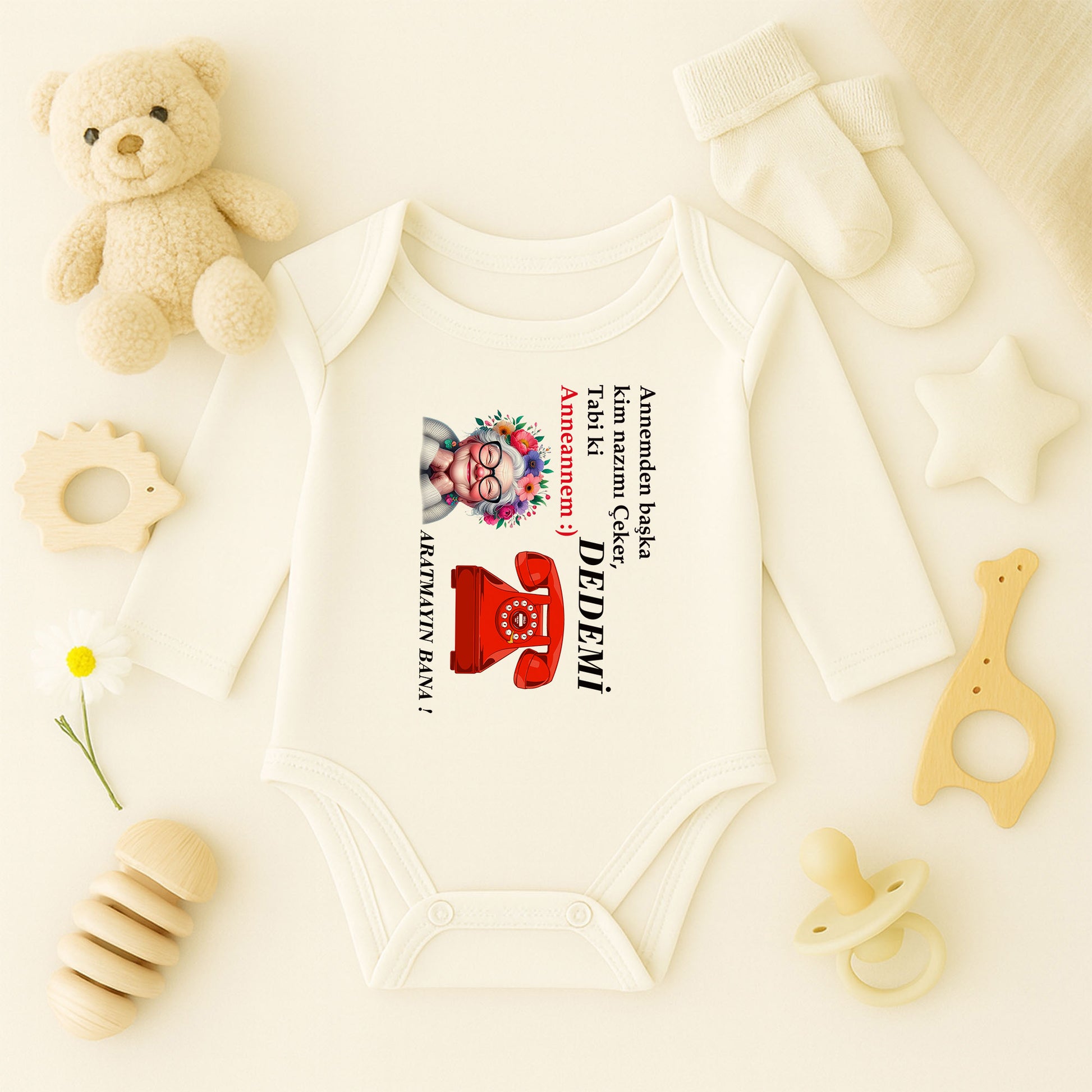 Çiçekli anneanne illüstrasyonu, retro kırmızı telefon detayı ve esprili yazılarla hazırlanmış tasarım; 1–24 ay arası tüm bebek bedenlerine uygun olarak üretilir.