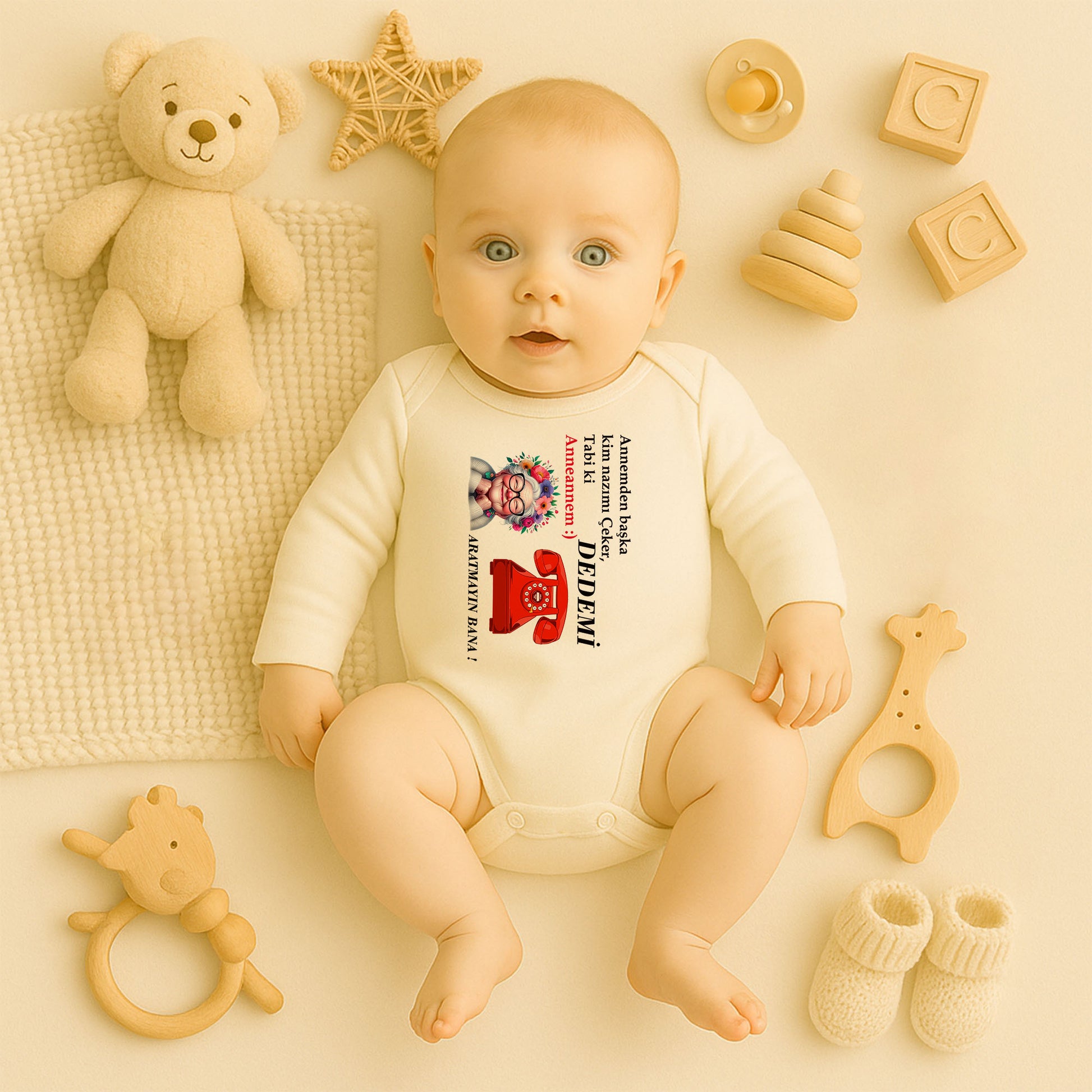 Miniklerin anneannelerine olan sevgisini en tatlı ve eğlenceli şekilde gösteren bu özel tasarım zıbın, hem günlük kullanımda hem de özel günlerde mükemmel bir tercih! 🌼💛